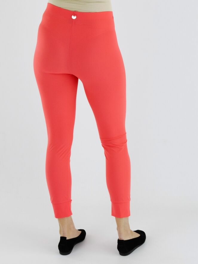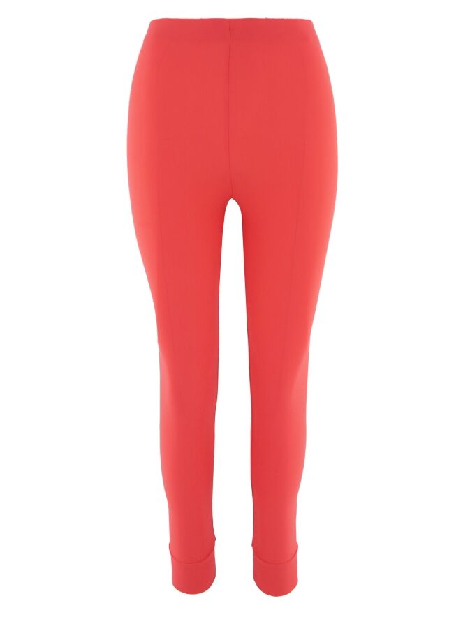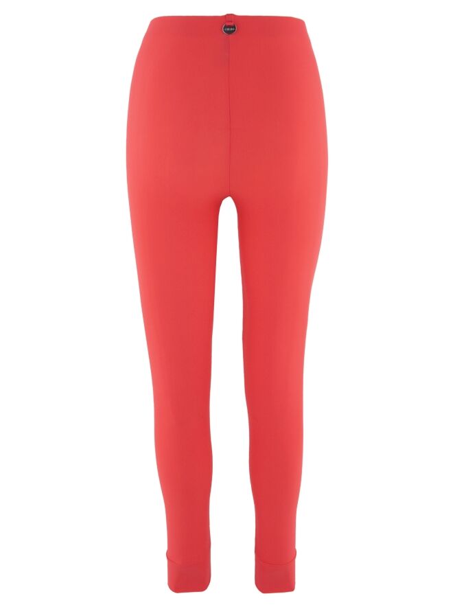 Eine Leggings von High in Korallenrot. An der Taille befindet sich ein elastisches Band. Am unteren Rand ist eine breite Borte mit einer Naht. Diese Leggings können bei 30 Grad gewaschen werden.