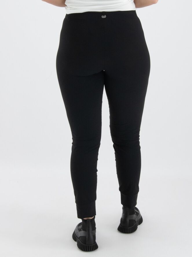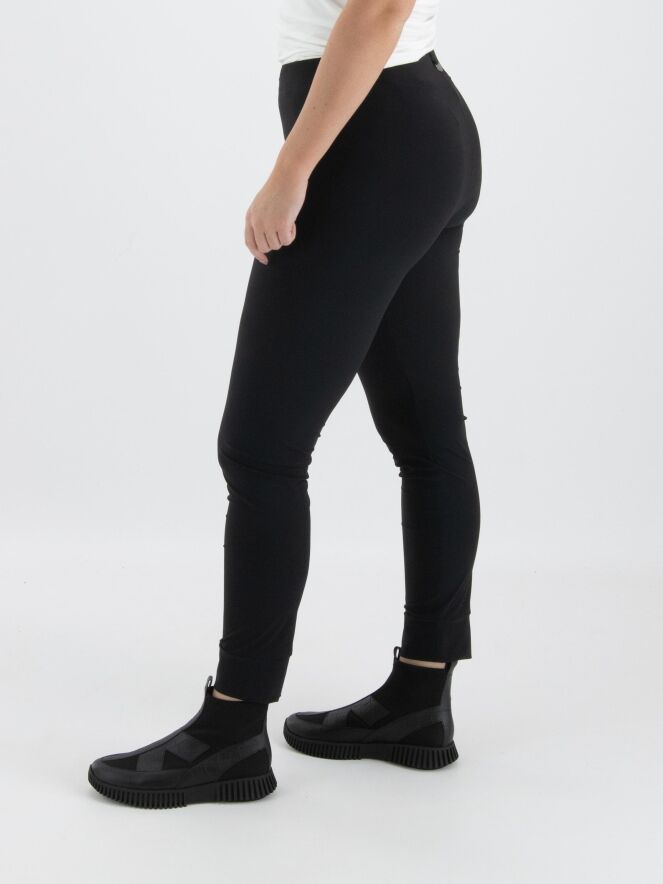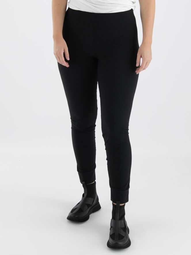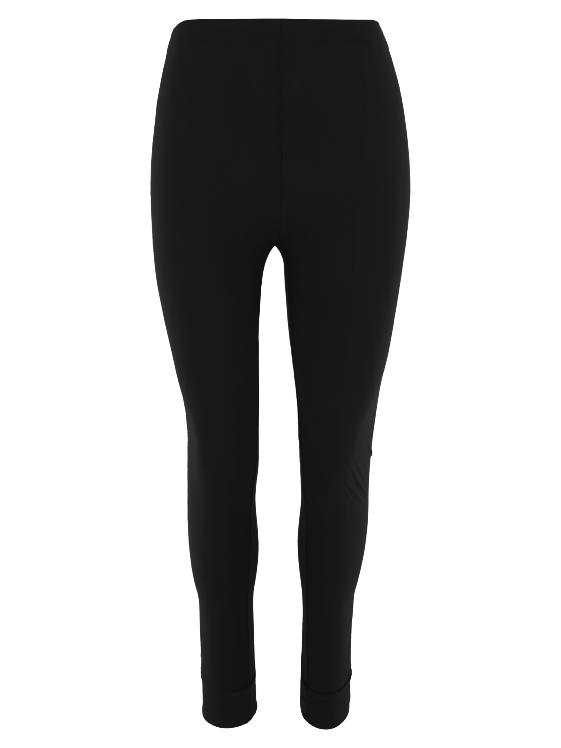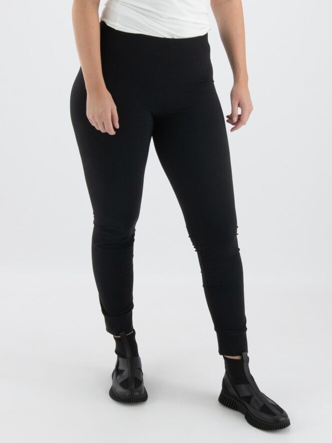 Eine Leggings von High in Schwarz. Sie hat einen elastischen Bund. Am unteren Rand befindet sich eine breite Biese mit einer Naht. Diese Leggings können bei 30 Grad gewaschen werden.