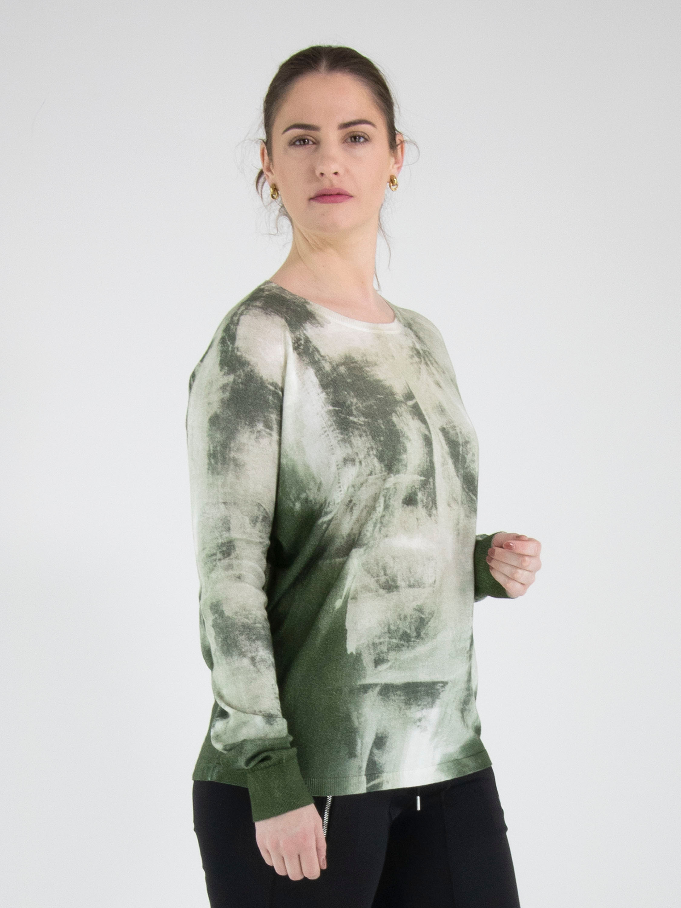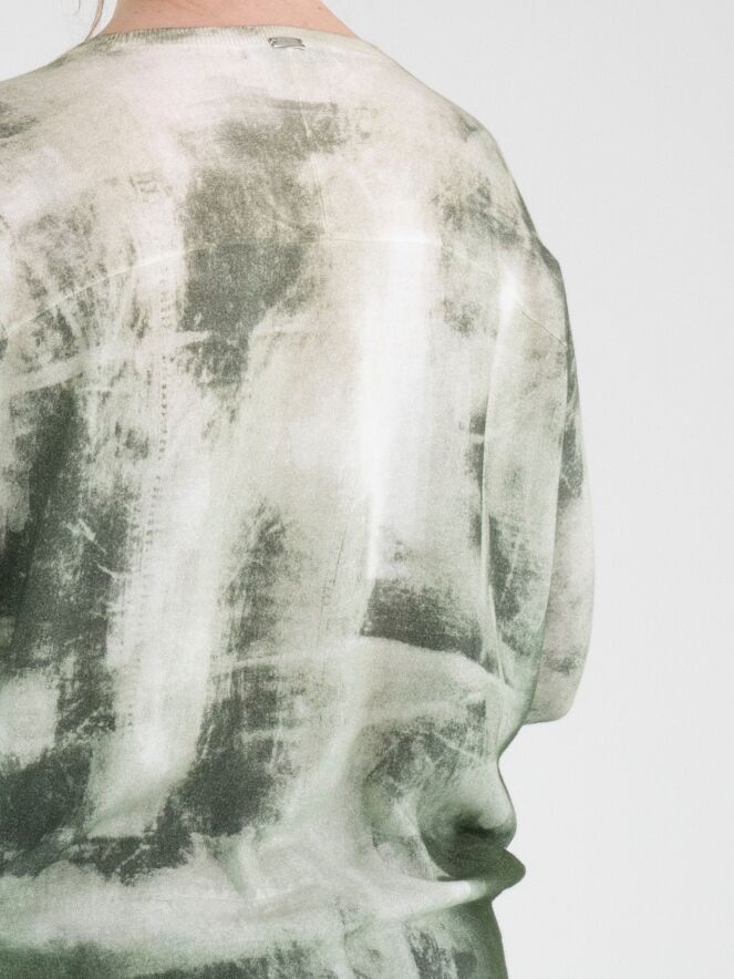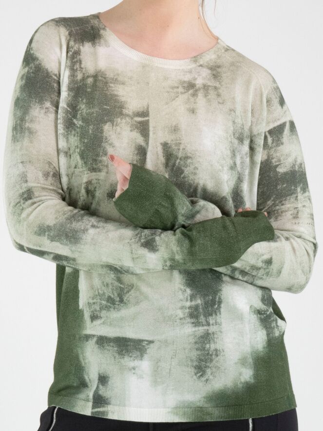 Ein Pullover von High mit einem grafischen Print in mehreren Olivgrüntönen auf cremeweißem Hintergrund. Entlang des Randes des Rundhalsausschnitts, an den Enden der langen Ärmel und am unteren Abschluss befindet sich ein fein gerippter Strickbund. Dieser Pullover darf nicht gewaschen werden.