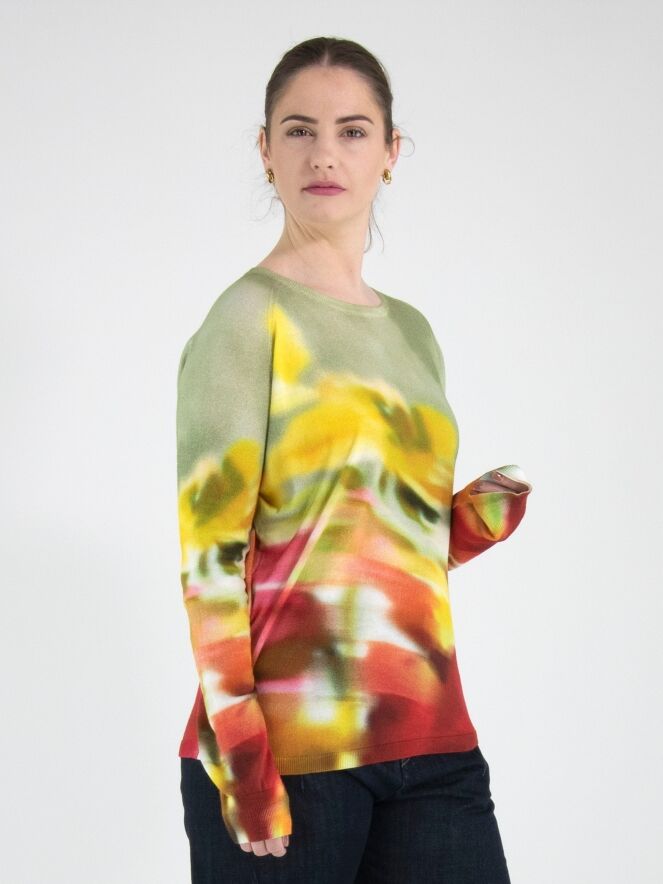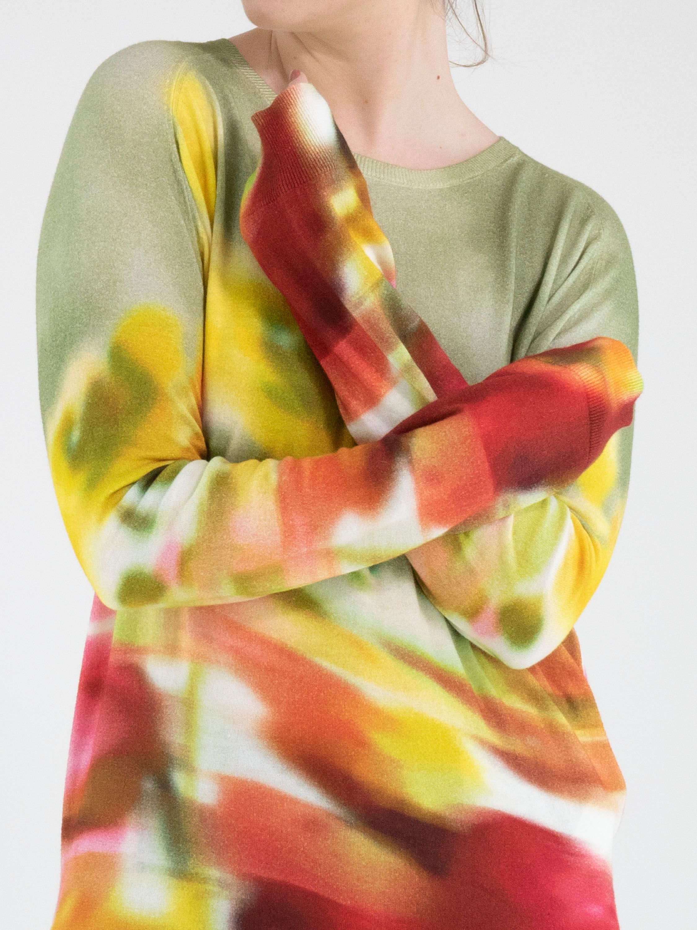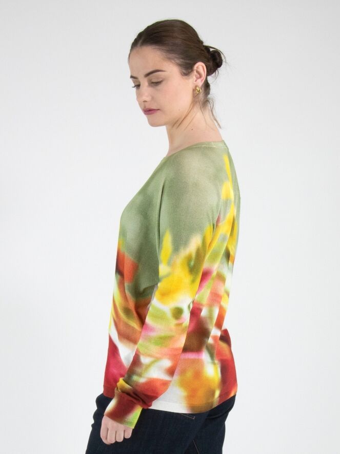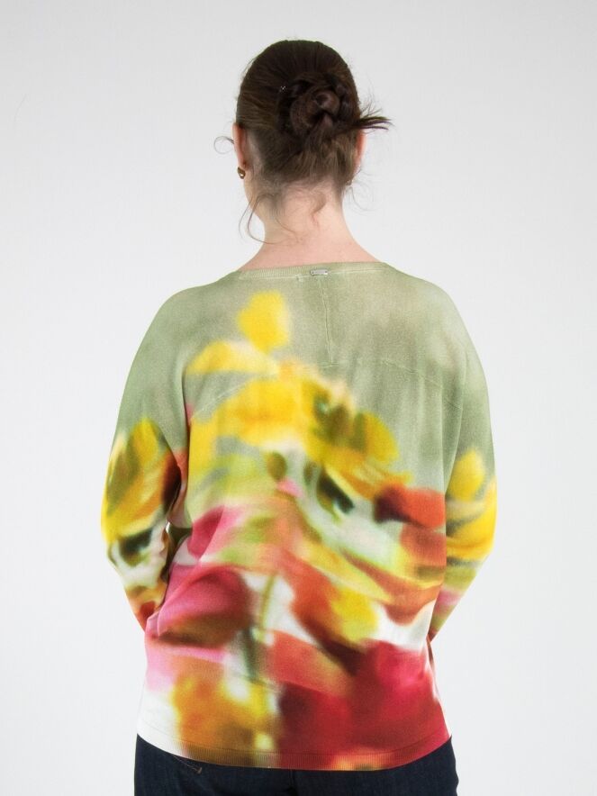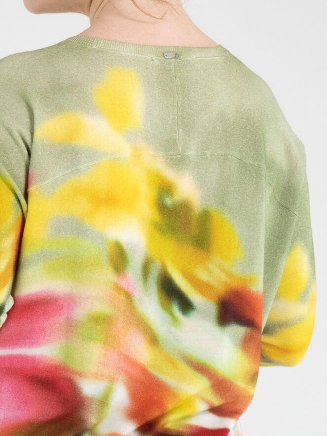 Ein Pullover von High mit einem grafischen Multicolor-Print, wobei Olivgrün die Hauptfarbe ist. Der Pullover hat einen Rundhalsausschnitt und lange Ärmel und darf nicht gewaschen werden.
