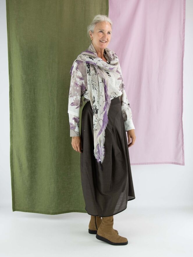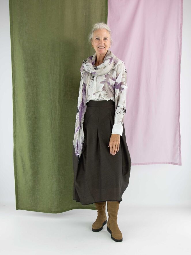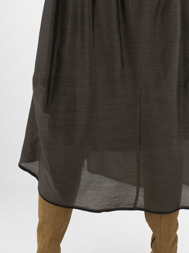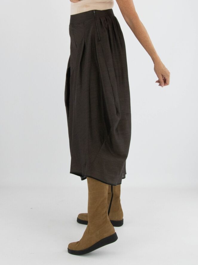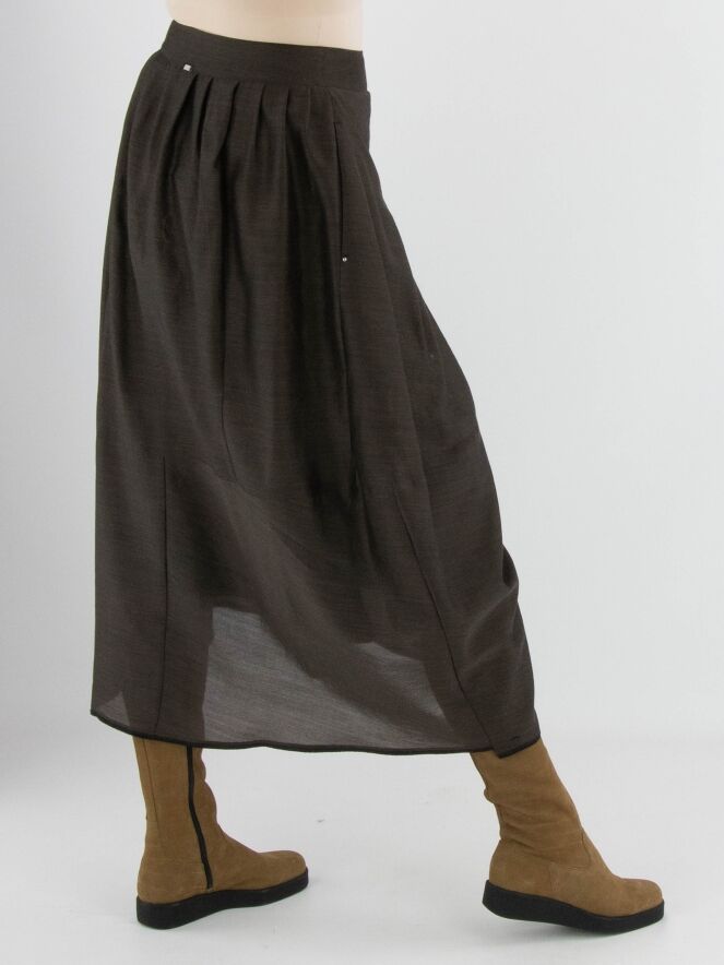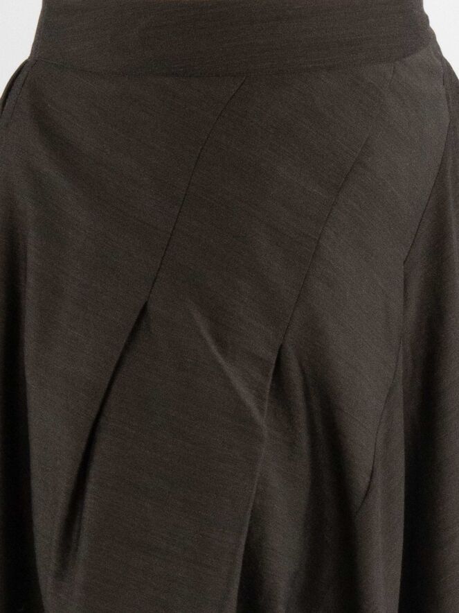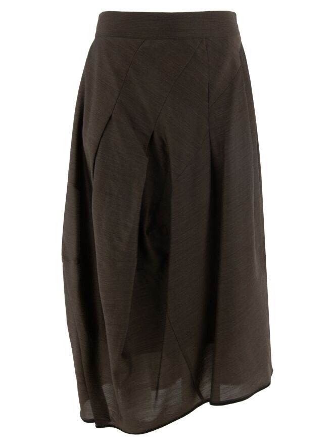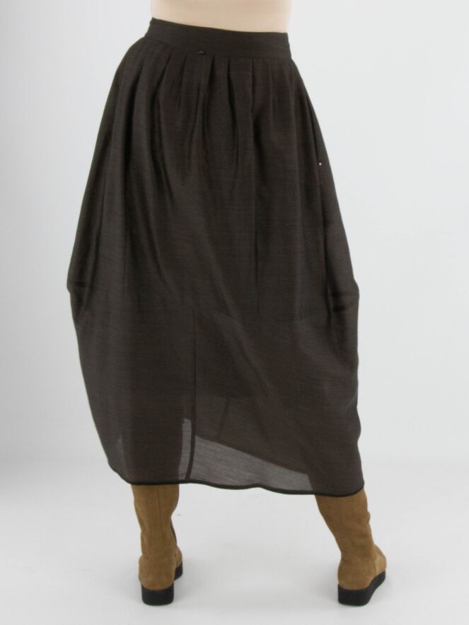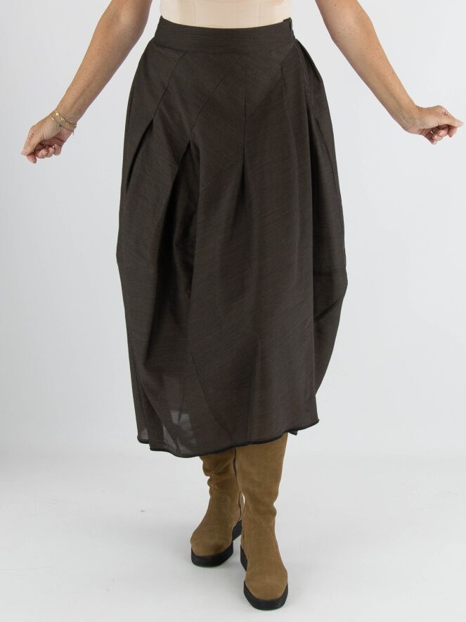 Rock aus mattem Satin von High in zwei Mokkatönen. Unter dem Bund verlaufen mehrere diagonale Nähte mit gelegentlichen Falten. Der Rock hat eine A-Linie und eine Eingrifftasche auf der rechten Seite unterhalb der Taille. Dieser Rock darf nicht gewaschen werden.