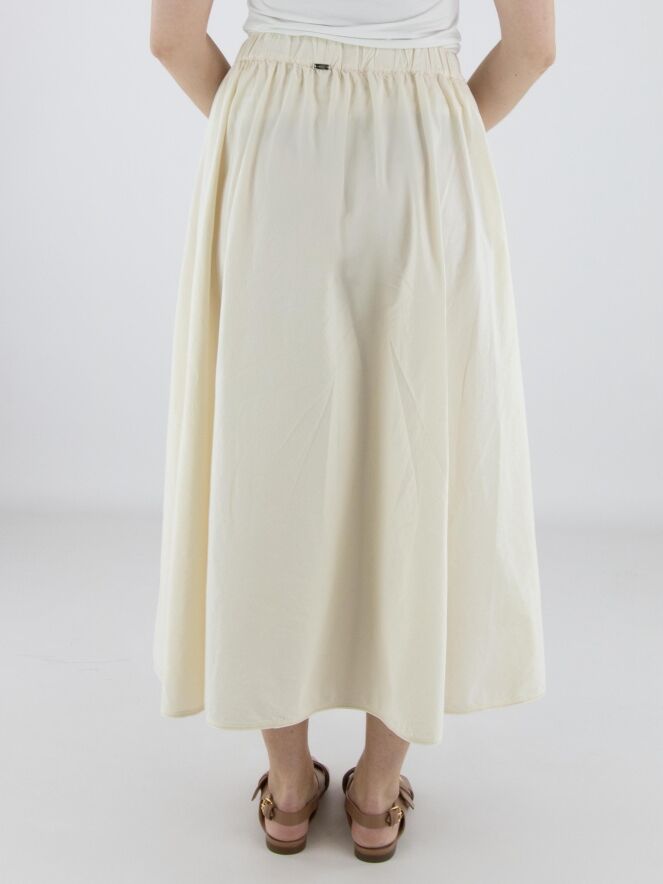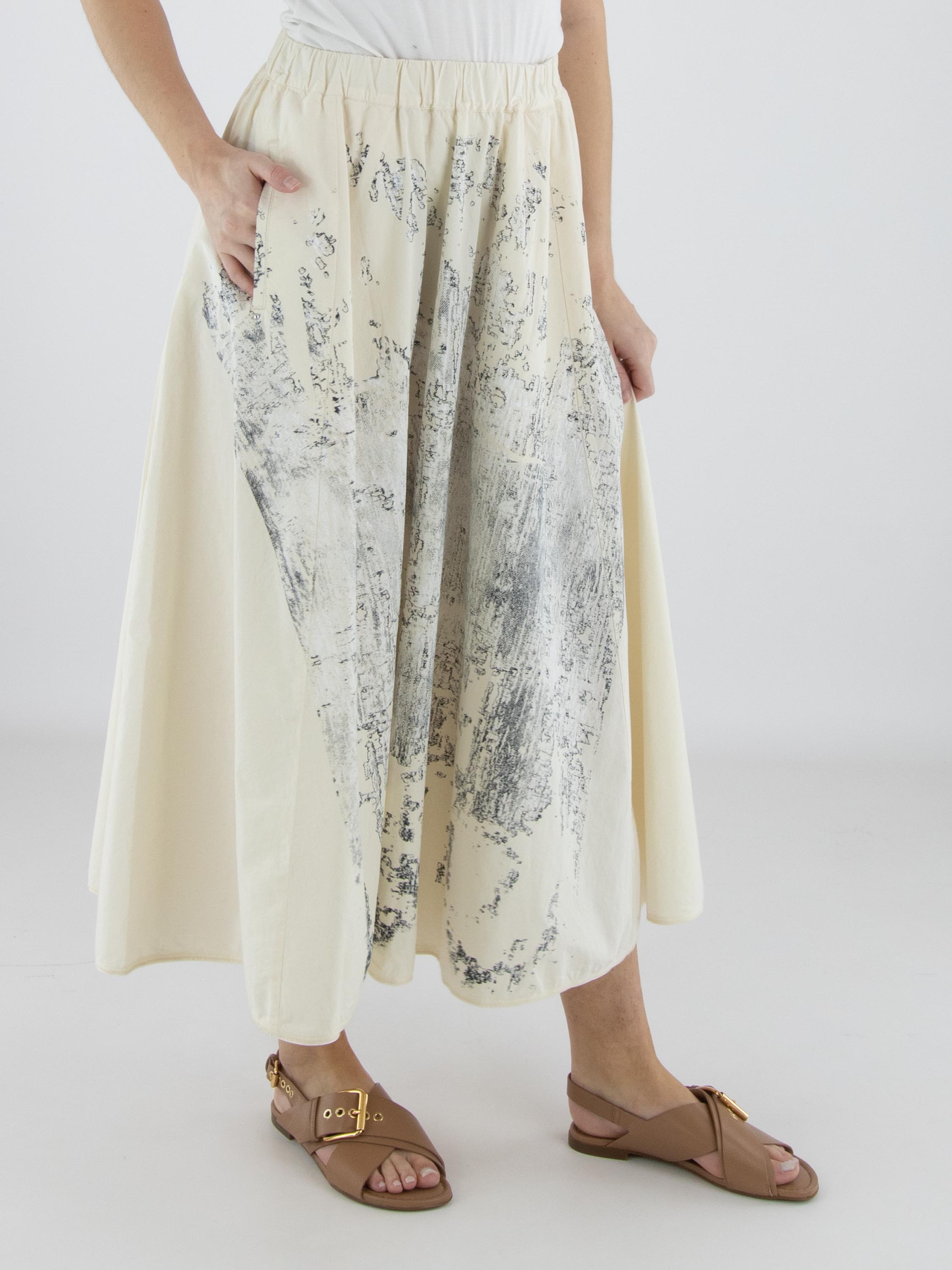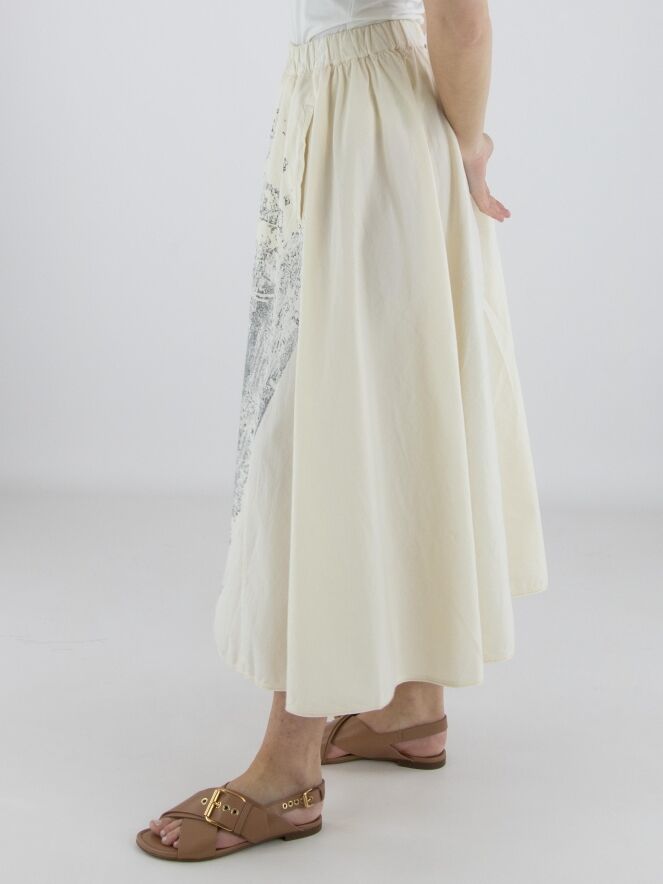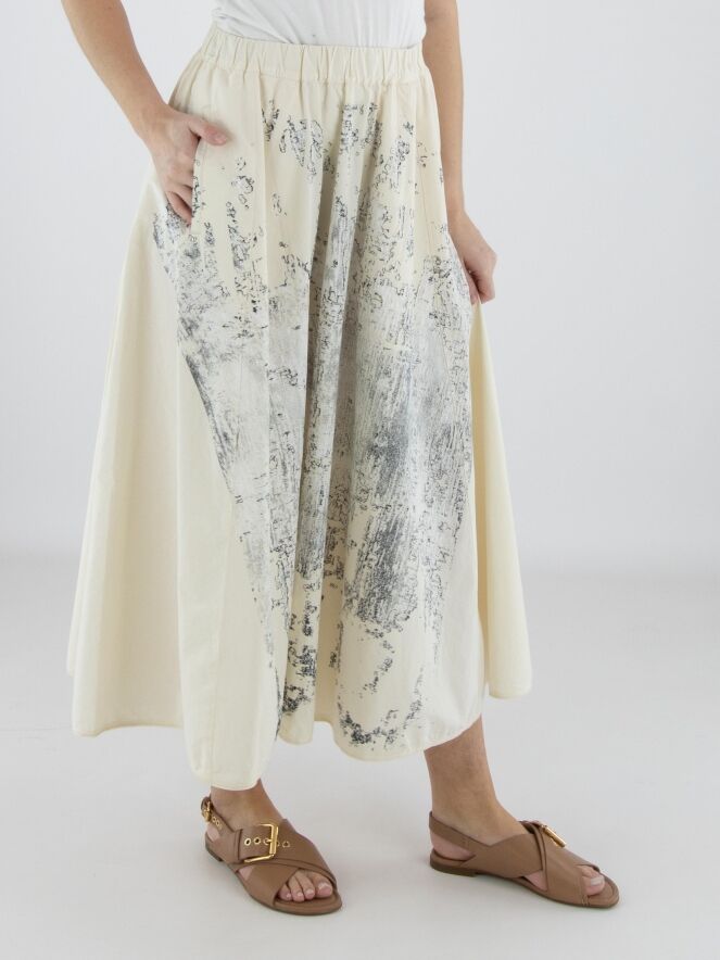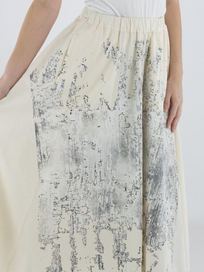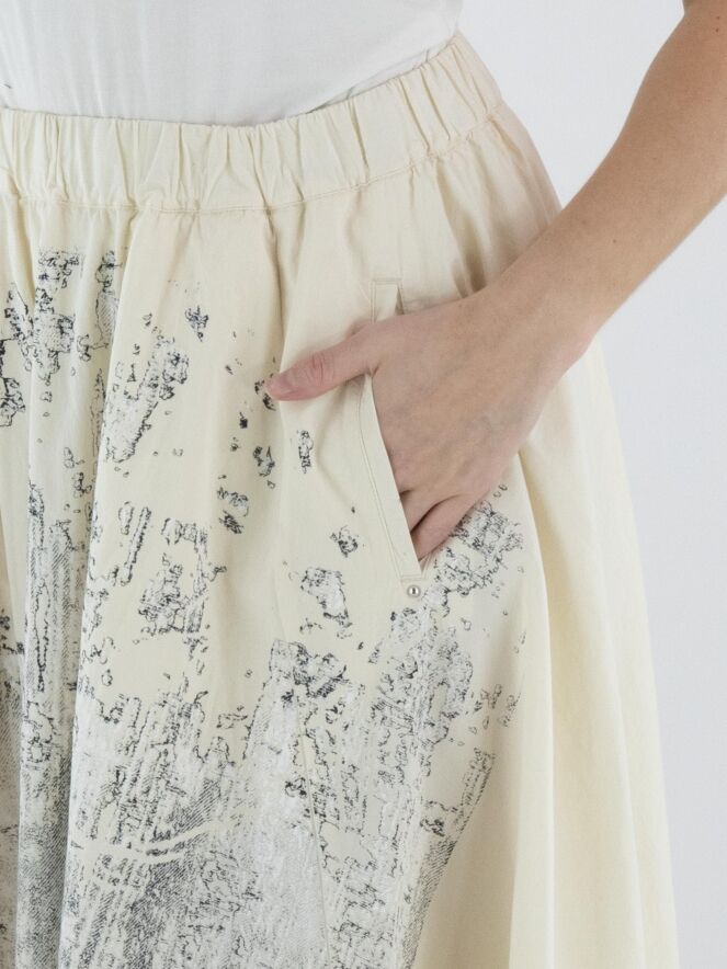 Rock von High mit grafischem Print auf der Vorderseite in mehreren Weiß- und Schwarztönen auf cremeweißem Grund. Die Rückseite ist in einem unifarbenen Cremeweiß gehalten und bildet einen stilvollen Kontrast. Ein fein gefältelter elastischer Bund sorgt für eine bequeme Passform. Der Rock verfügt über Eingrifftaschen, ist ungefüttert und sollte per Hand gewaschen werden.