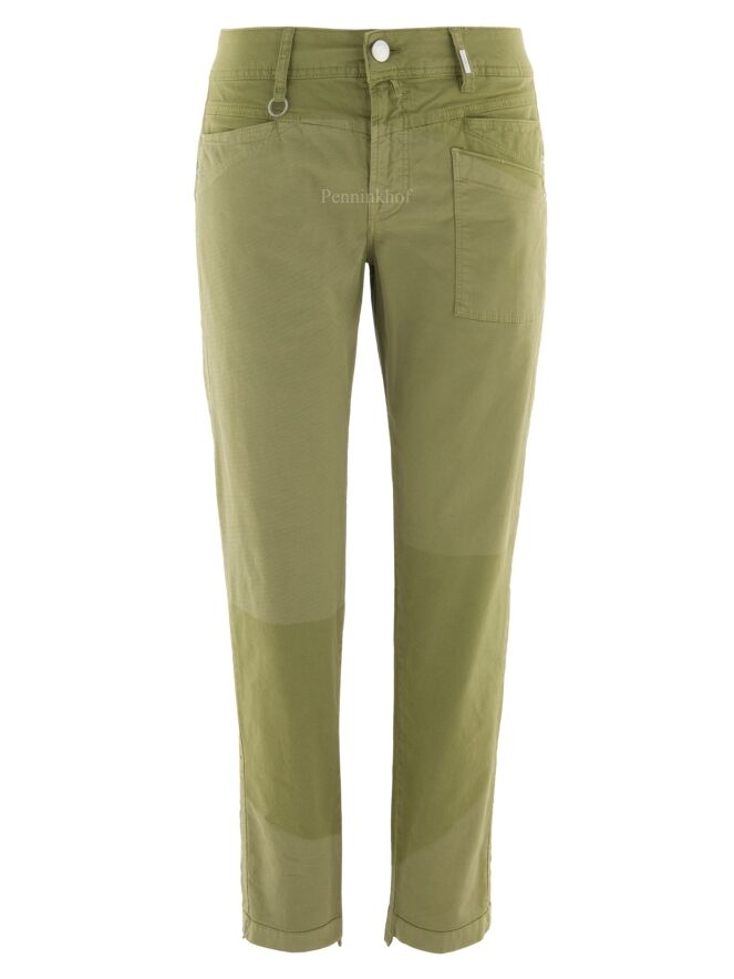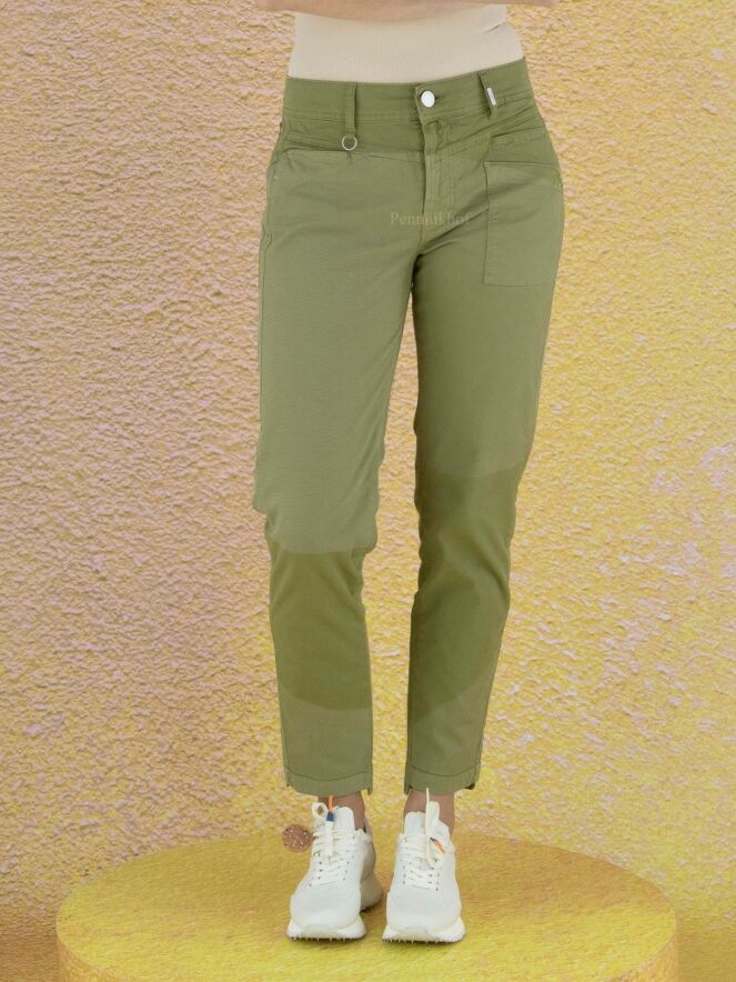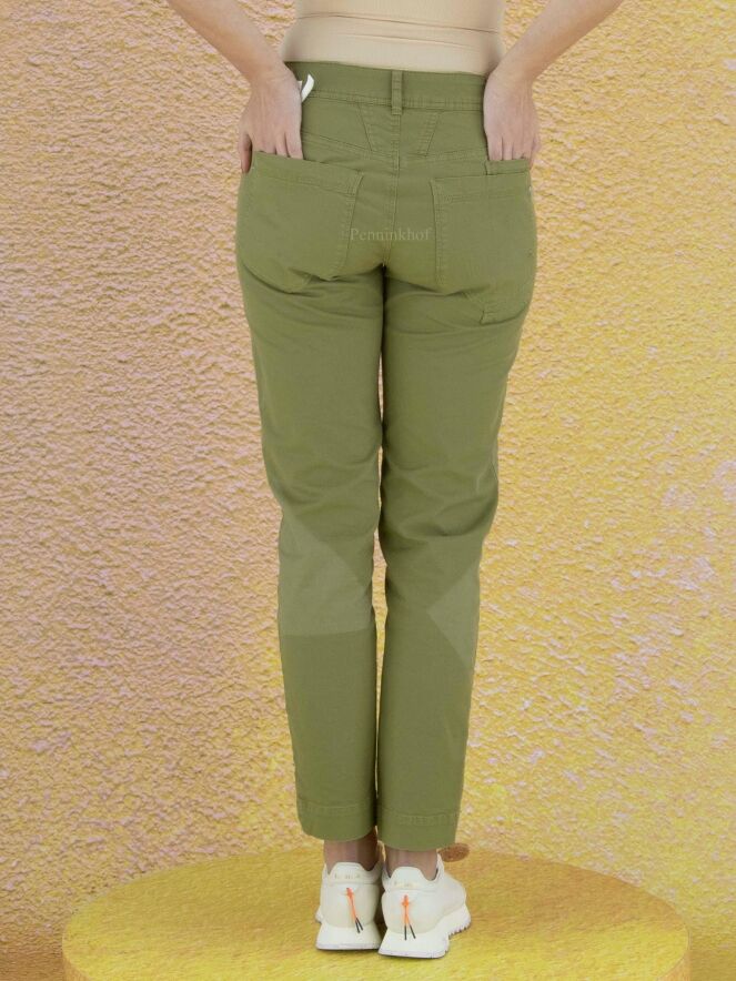 Eine grüne Stoffhose der Designermarke High. Die Hose hat mehrere Flächen mit unterschiedlichen Farbtönen. Der linke Oberschenkel ist mit einem hellen Streifenmuster versehen. Diese Hose kann bei 30 Grad gewaschen werden.