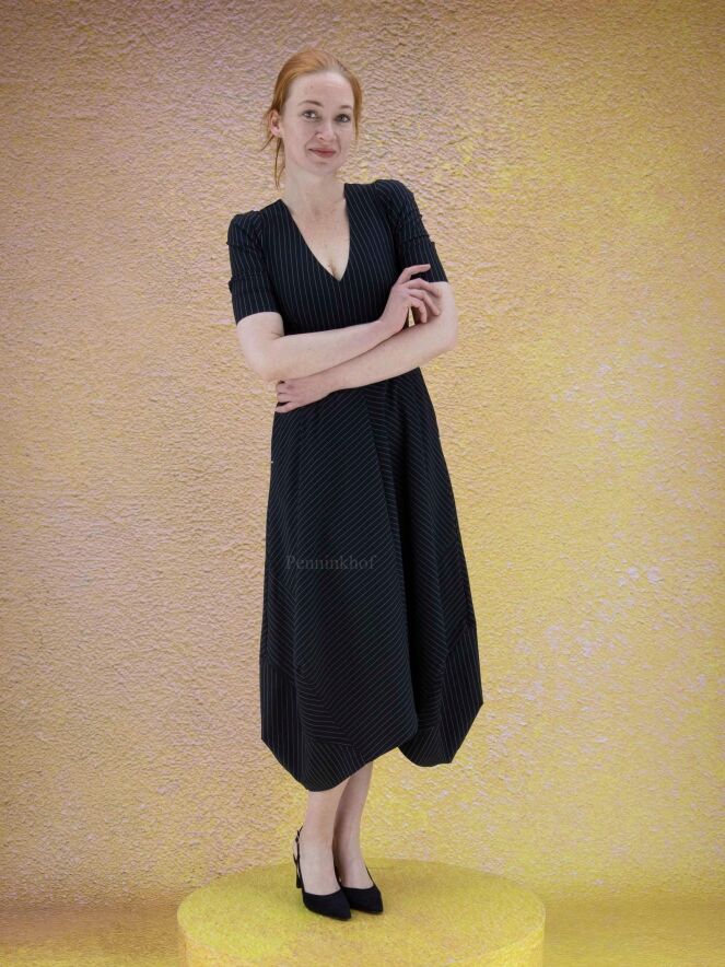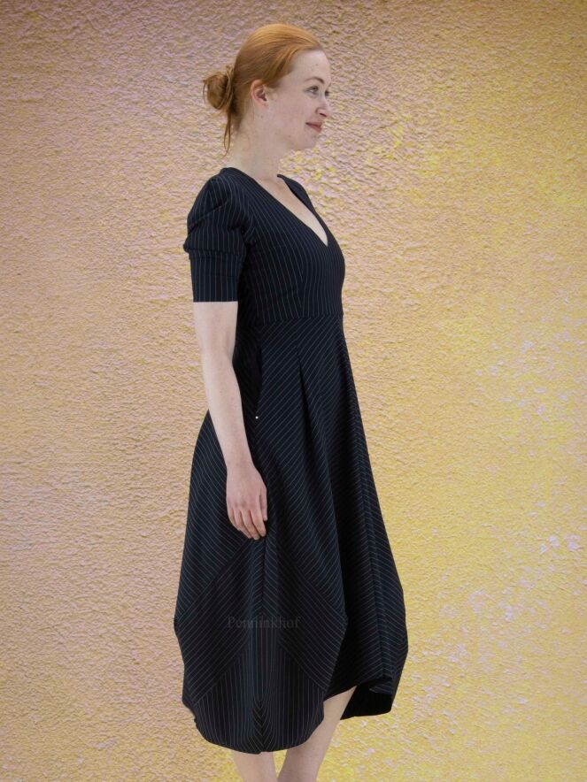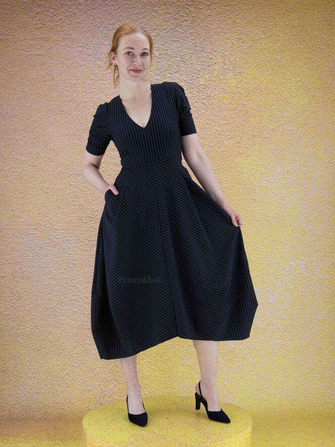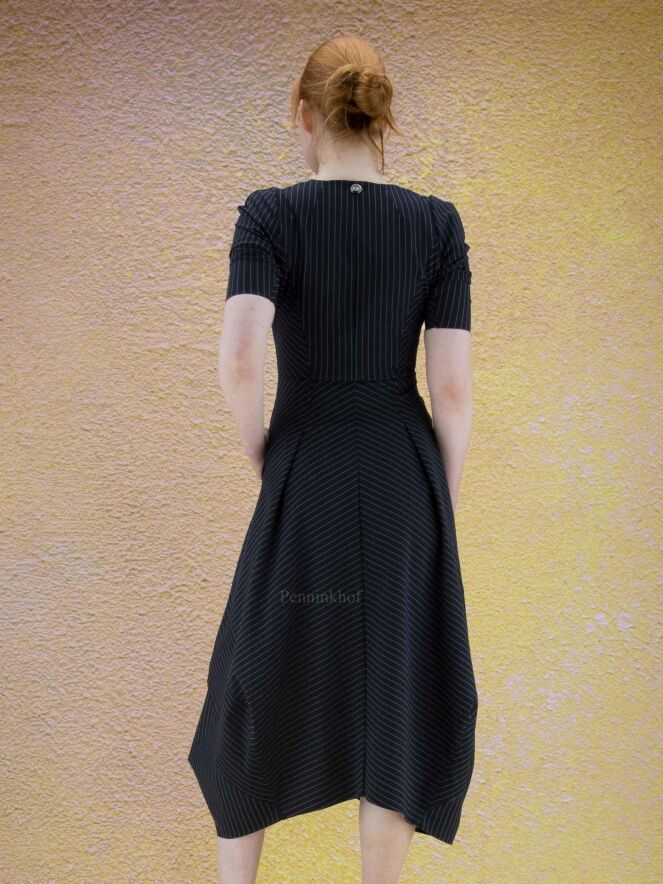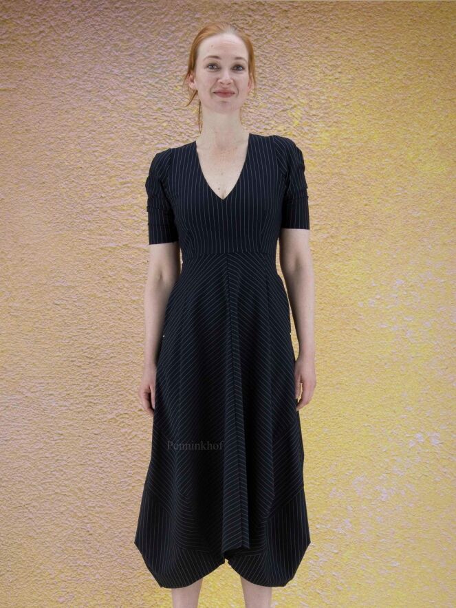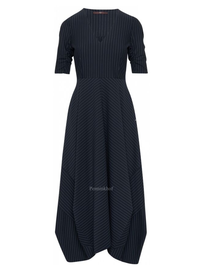 Ein marineblau-cremeweißes Nadelstreifenkleid der Designermarke High. Das Kleid hat einen V-Ausschnitt und eine A-Linie ab der Taille. Die Naht an der Unterseite der kurzen Ärmel ist leicht plissiert. Dieses Kleid hat Seitentaschen und darf von Hand gewaschen werden.