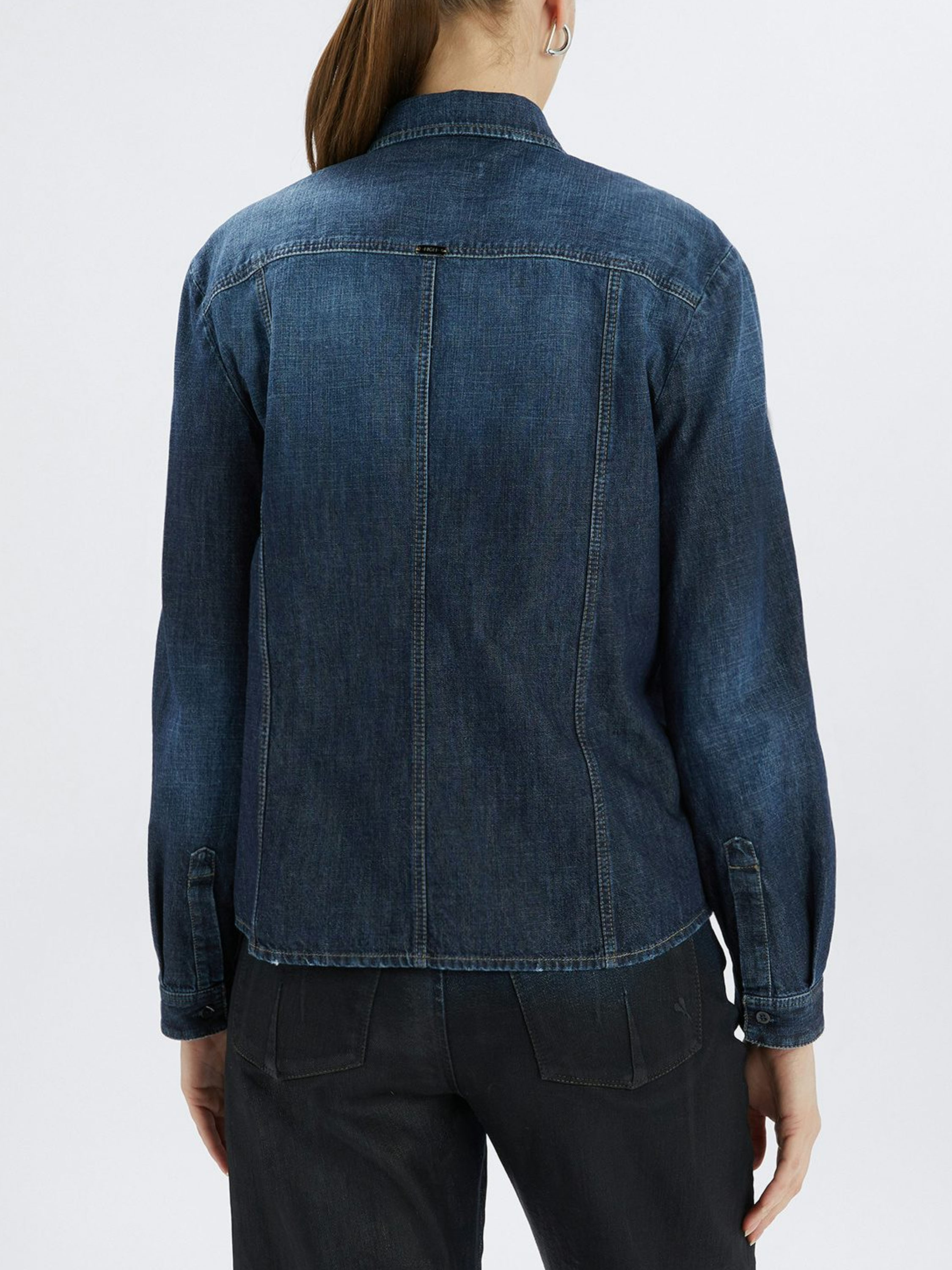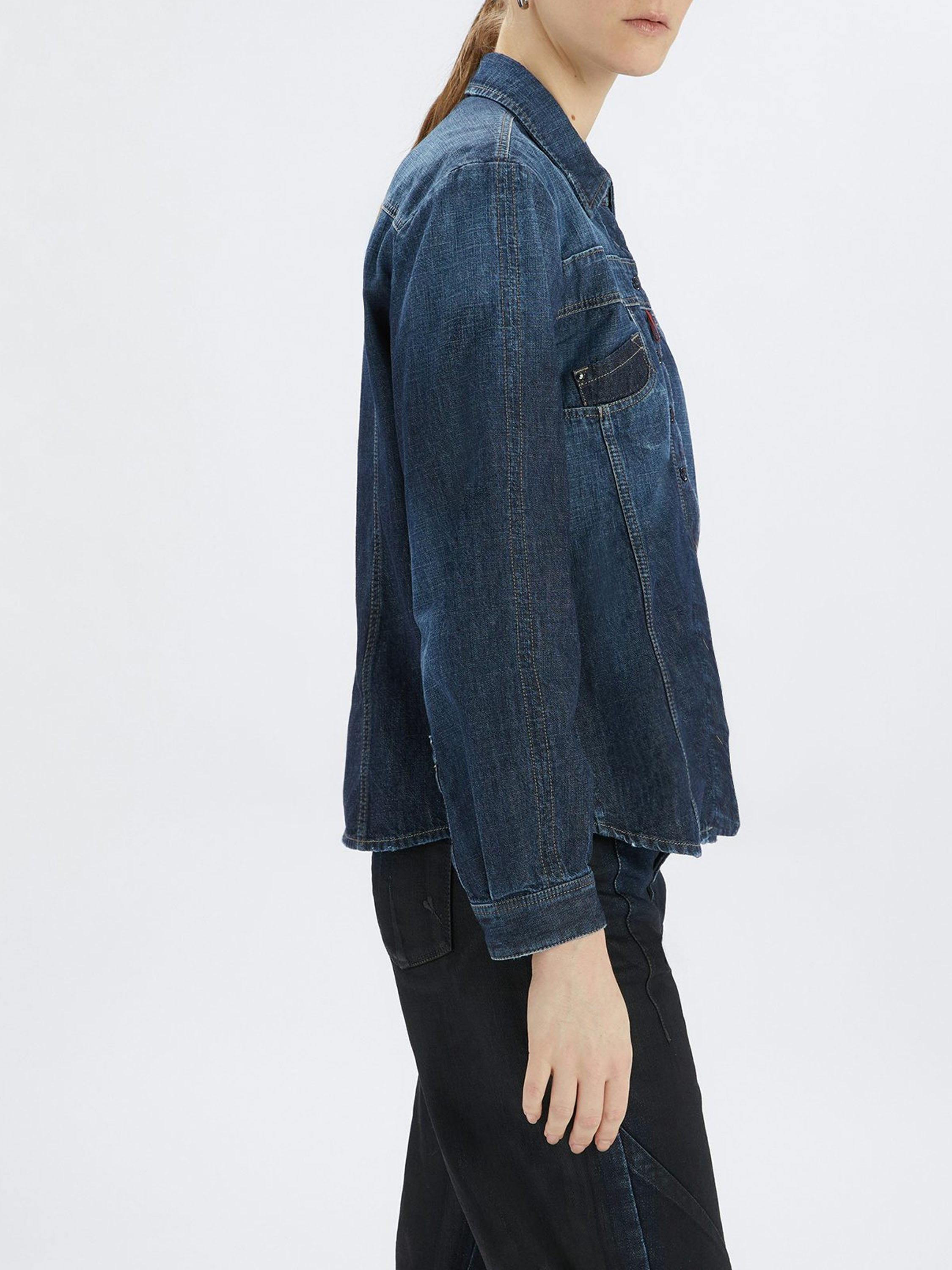 Eine Jeansbluse von High in klassischem Jeansblau. Auf beiden Vorderseiten sind kleine, dekorative Taschen in diagonaler Position angebracht. Diese Bluse kann bei 30 Grad gewaschen werden.