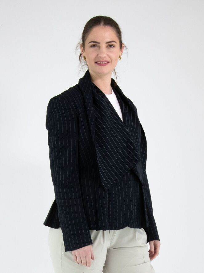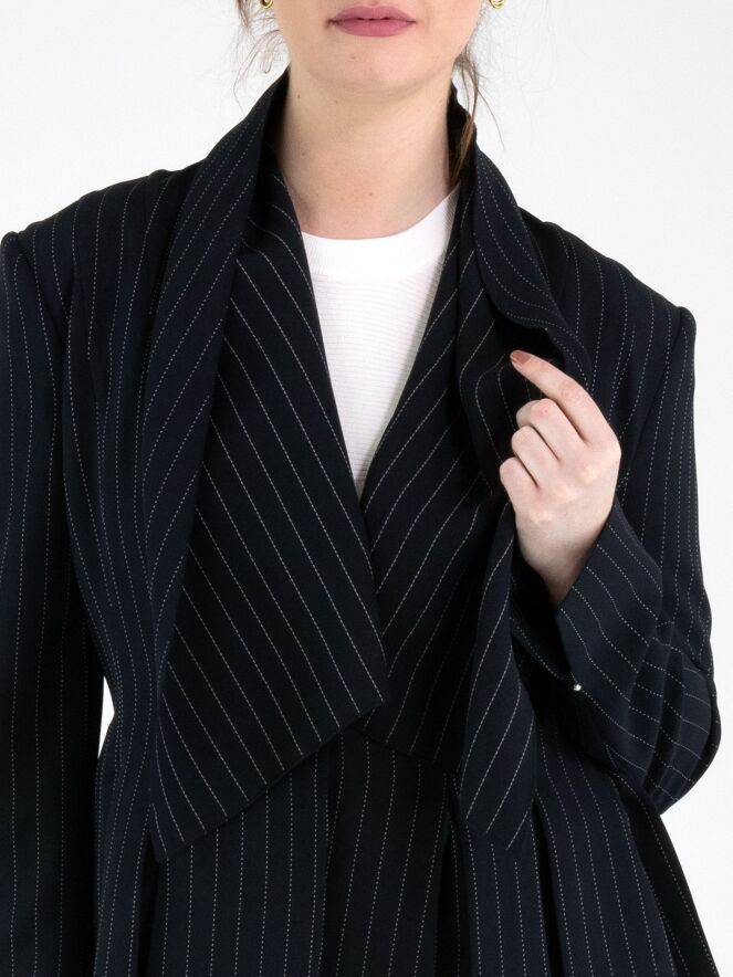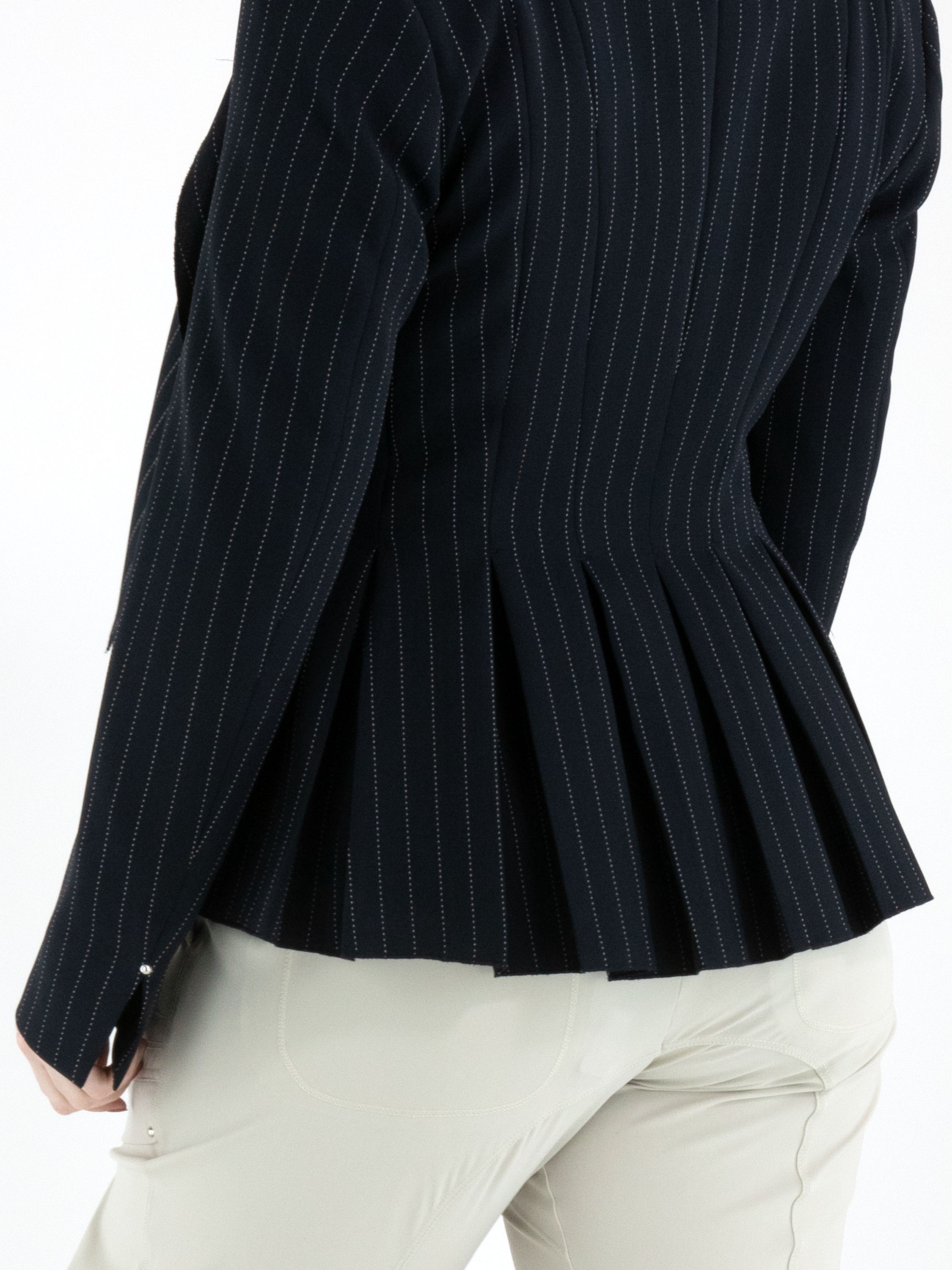 Ein Blazer von High im Kreidestreifenmuster in Marineblau mit weißer Ziernaht. Der Blazer hat einen breiten Schalkragen und einen Ein-Knopf-Verschluss. An den Enden der langen Ärmel befindet sich ein kurzer Schlitz mit einem silberfarbenen Stud. Auf Taillenhöhe sind Eingrifftaschen angebracht. Auf der Rückseite sind ausgehend von der Taille mehrere Plisseefalten gearbeitet. Dieser Blazer darf nicht gewaschen werden.