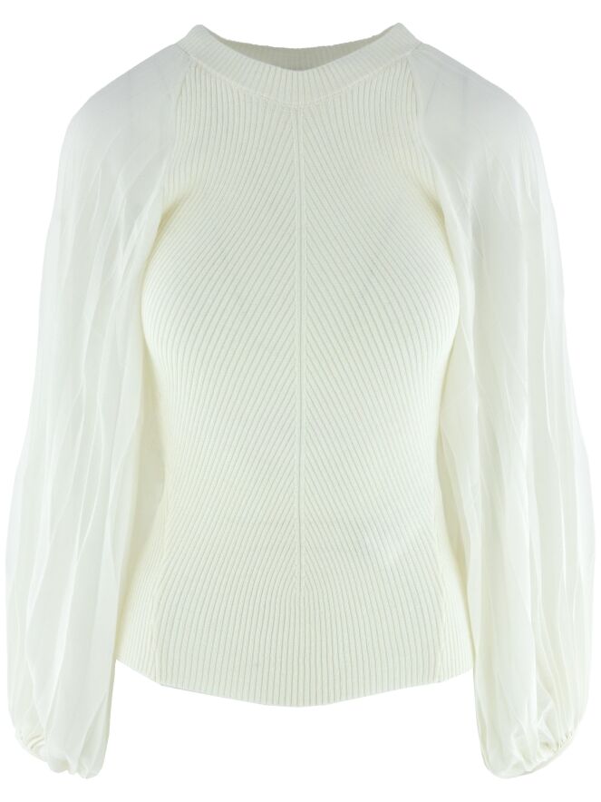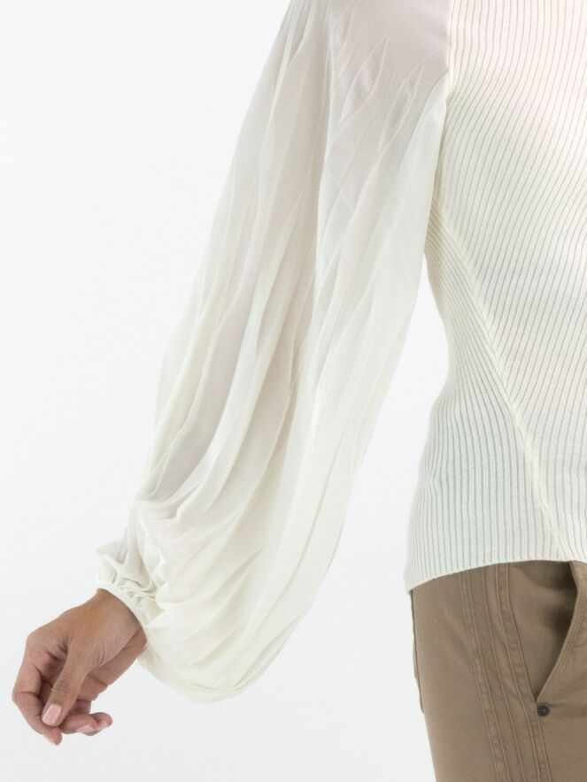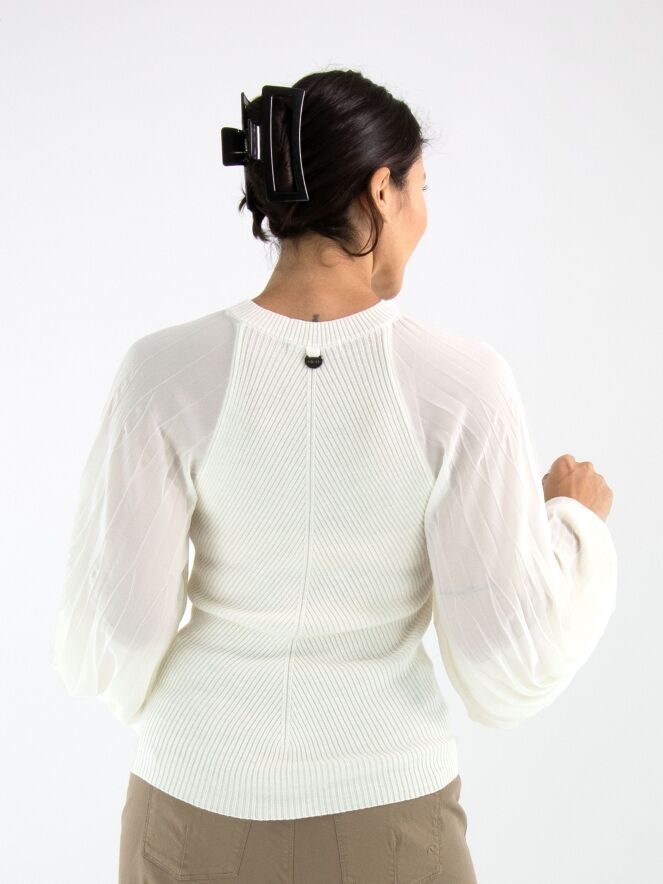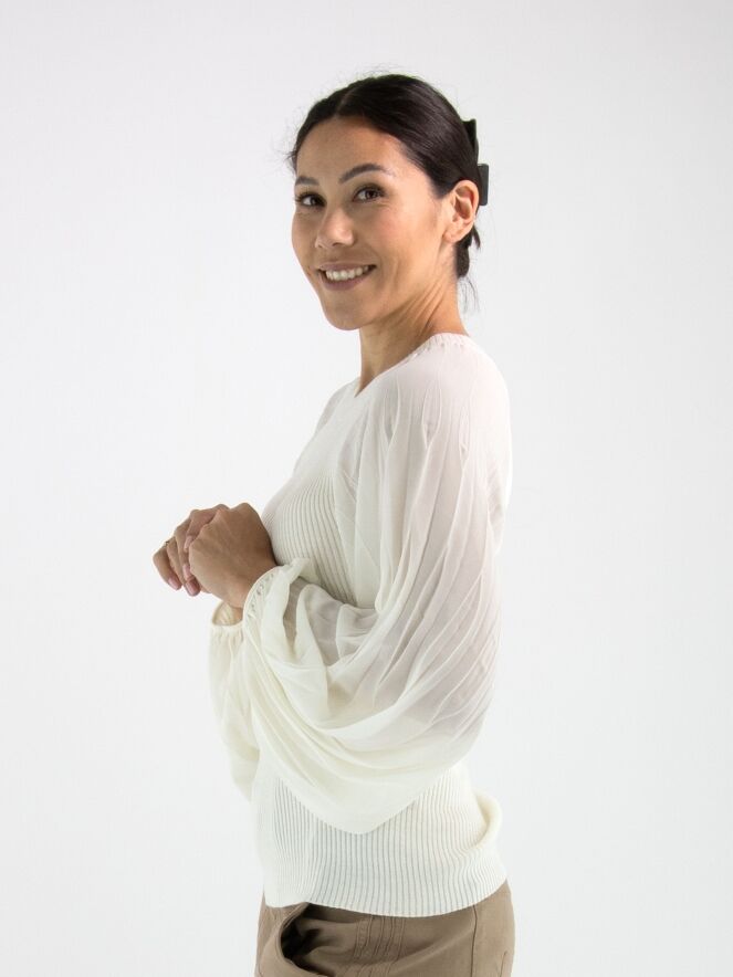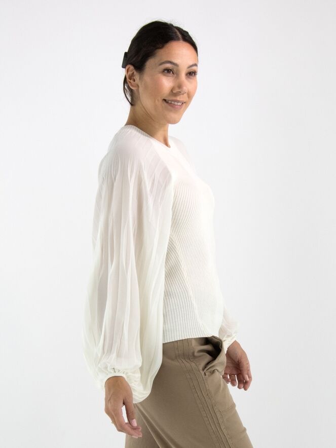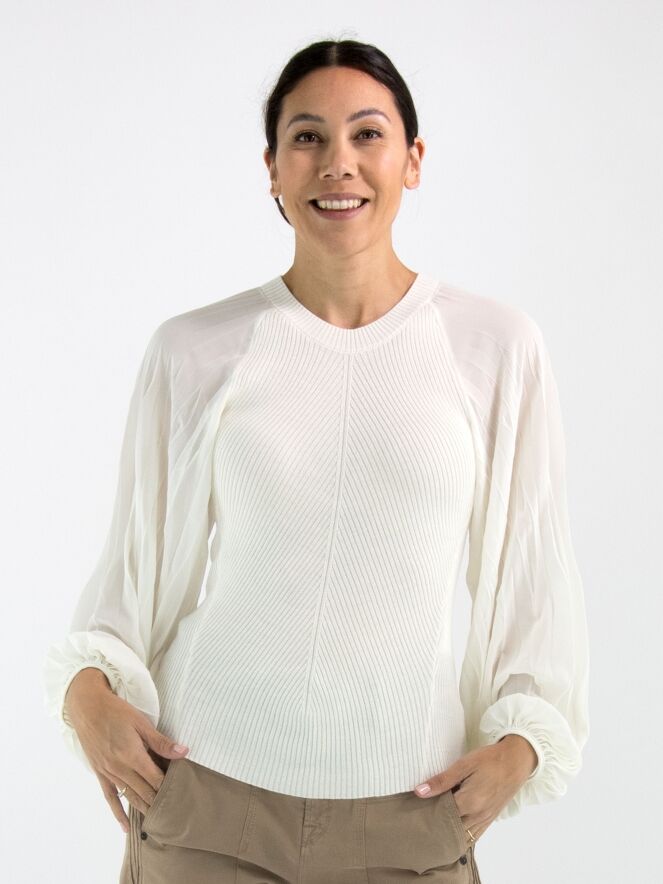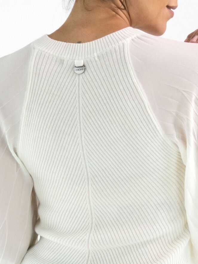 Ein fein gerippter Pullover von High in Cremeweiß. Die Rippen verlaufen von der Mitte aus in einer eleganten Fischgrätenstruktur. Die weiten Voile-Ärmel sind mit einer Biese abgeschlossen, entlang der der Stoff zart in Falten gelegt ist, was einen luftigen und femininen Effekt erzeugt. Der Pullover hat einen Rundhalsausschnitt und kann per Hand gewaschen werden.