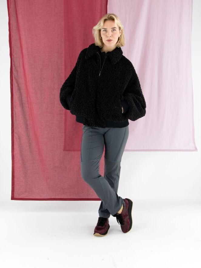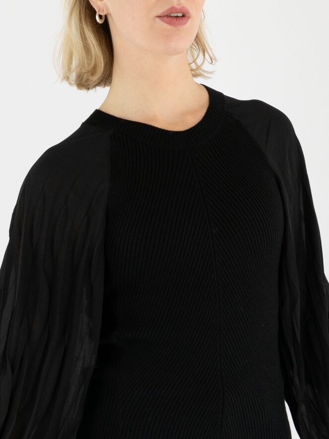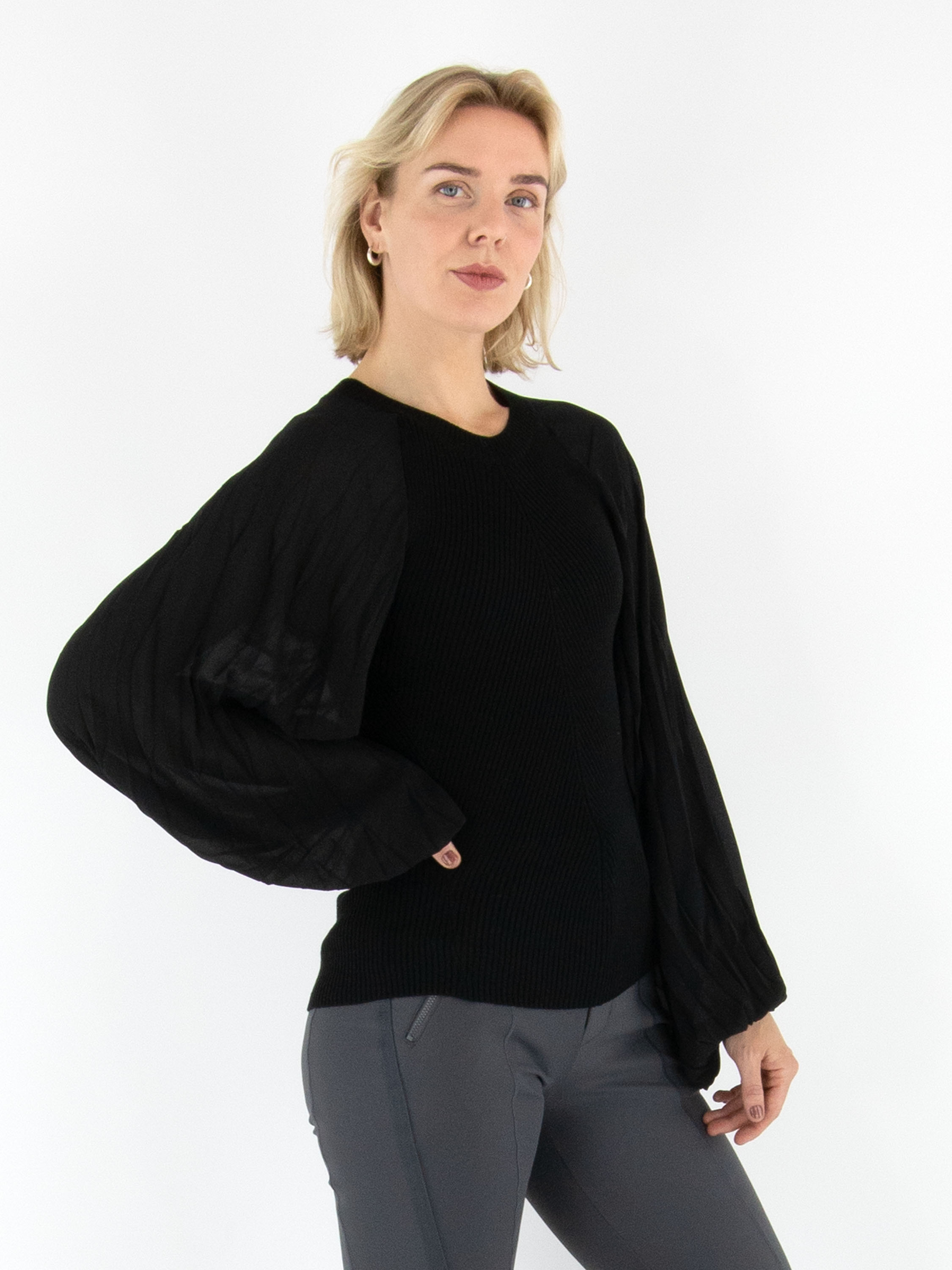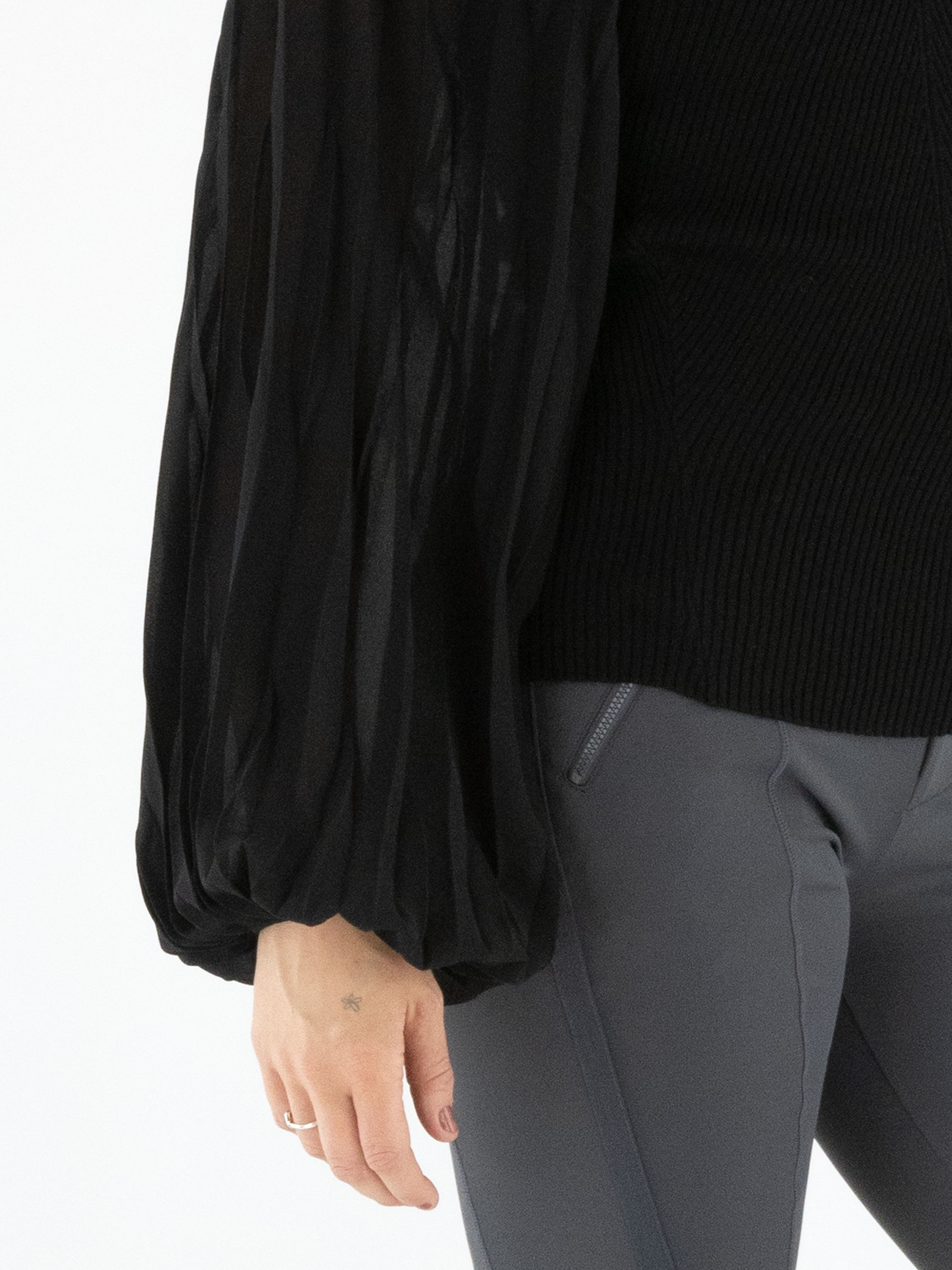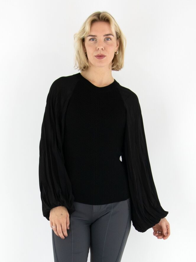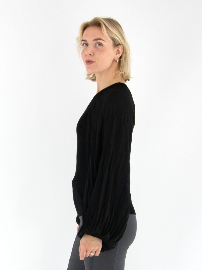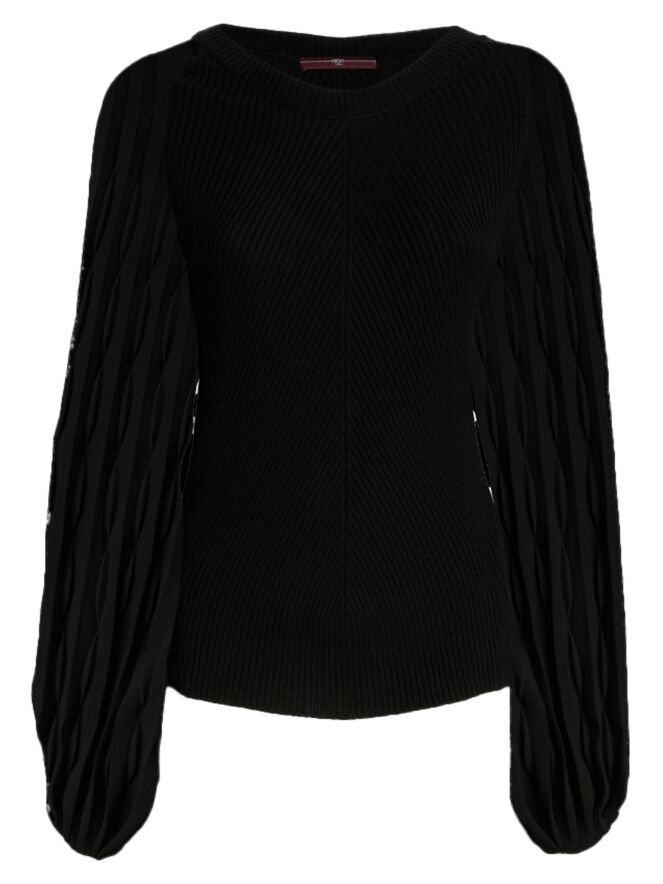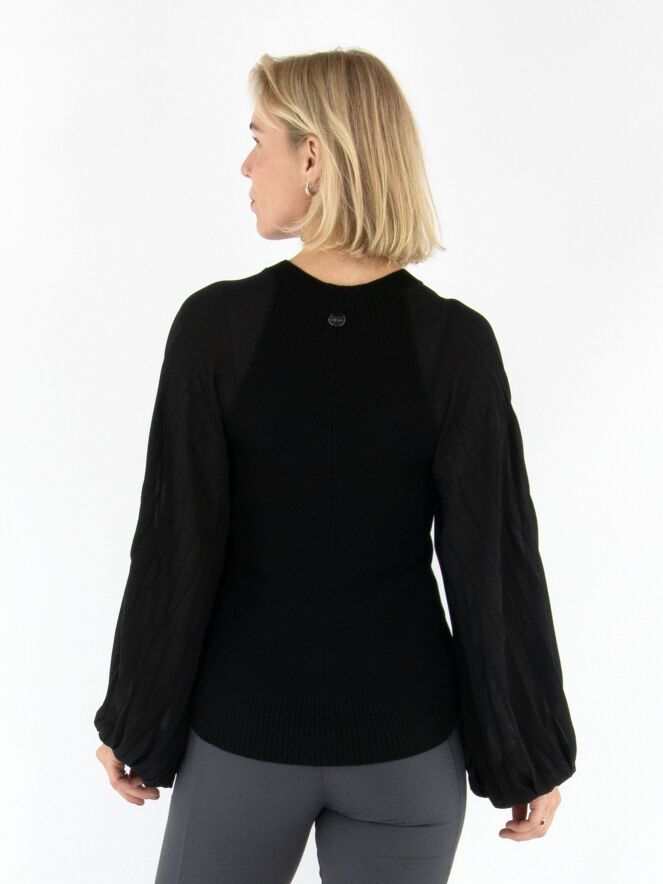 Ein fein gerippter Pullover von High in Schwarz. Die Rippen verlaufen aus der Mitte heraus in einer eleganten Fischgrätstruktur. Die weiten Voile-Ärmel enden in einer Biese, entlang der der Stoff fein gefaltet ist und so eine luftige, feminine Note verleiht. Der Pullover hat einen Rundhalsausschnitt und kann per Hand gewaschen werden.