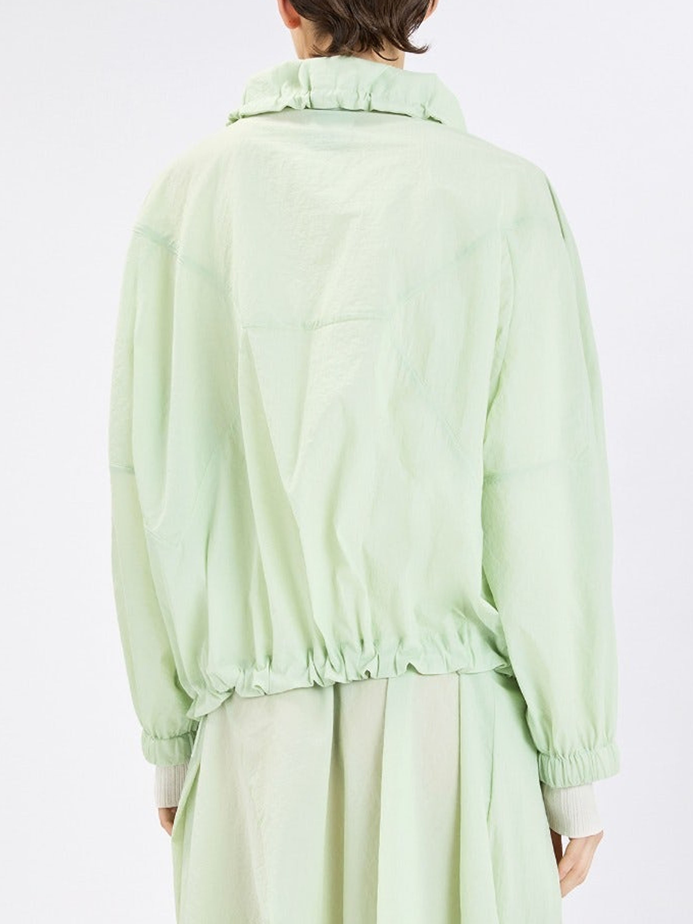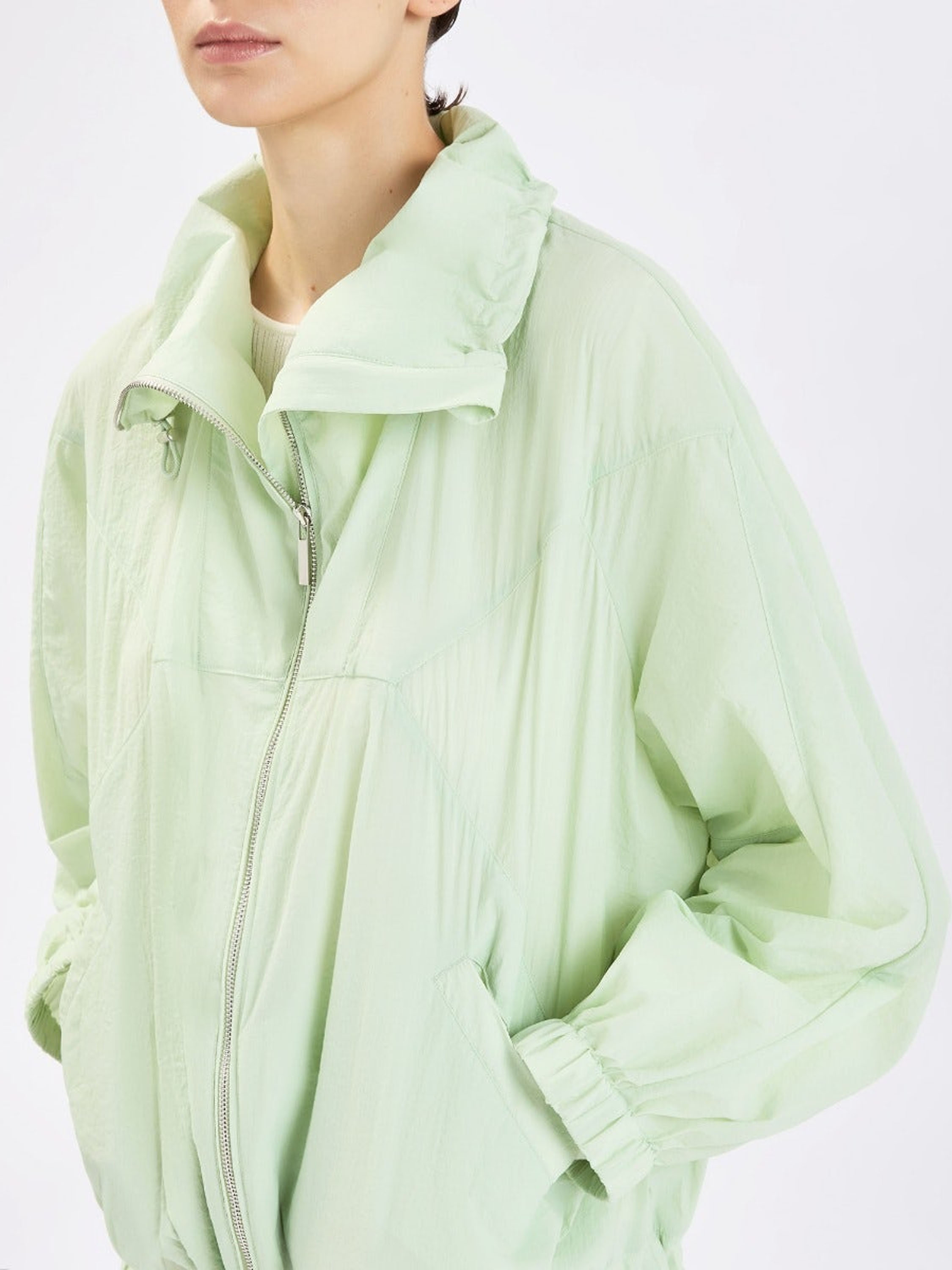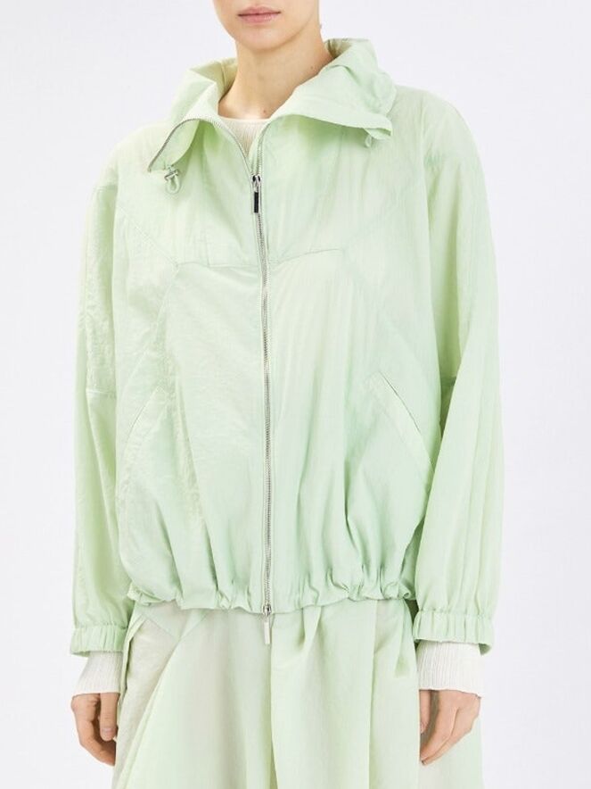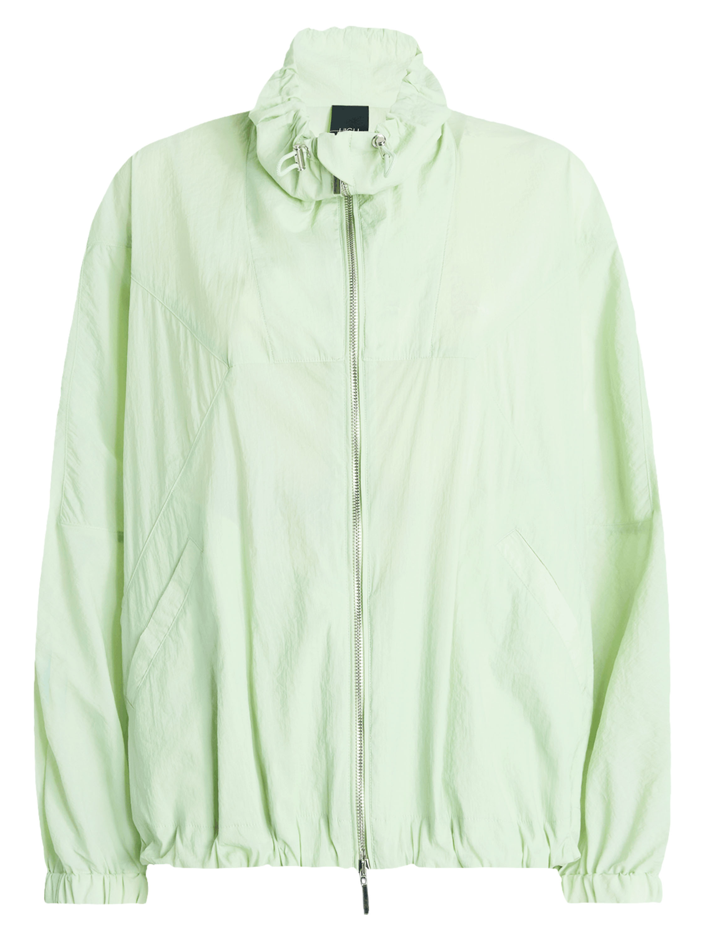 Ein Mantel von High in einem sanften Mintgrün. Entlang des Kragenrandes und am unteren Saum verläuft ein Kordelzug in Tunnelverarbeitung, mit dem ein Falteneffekt erzeugt werden kann. An den Ärmelabschlüssen befindet sich ein fein geplotteter elastischer Bund. Der Mantel hat silberfarbene Reißverschlüsse und Eingrifftaschen. Dieser Mantel kann per Hand gewaschen werden.