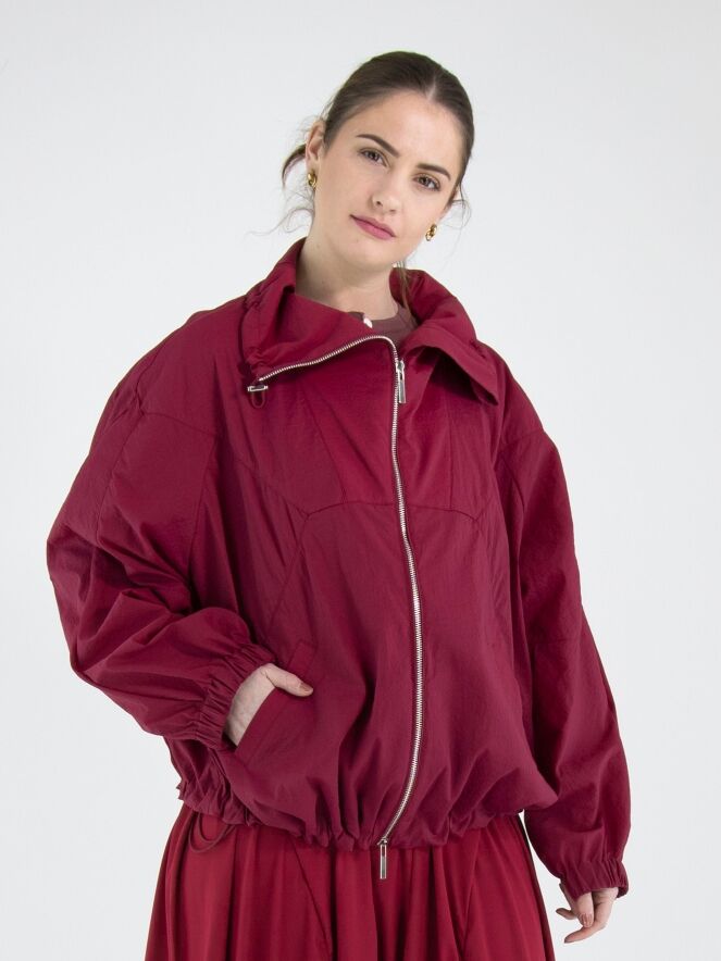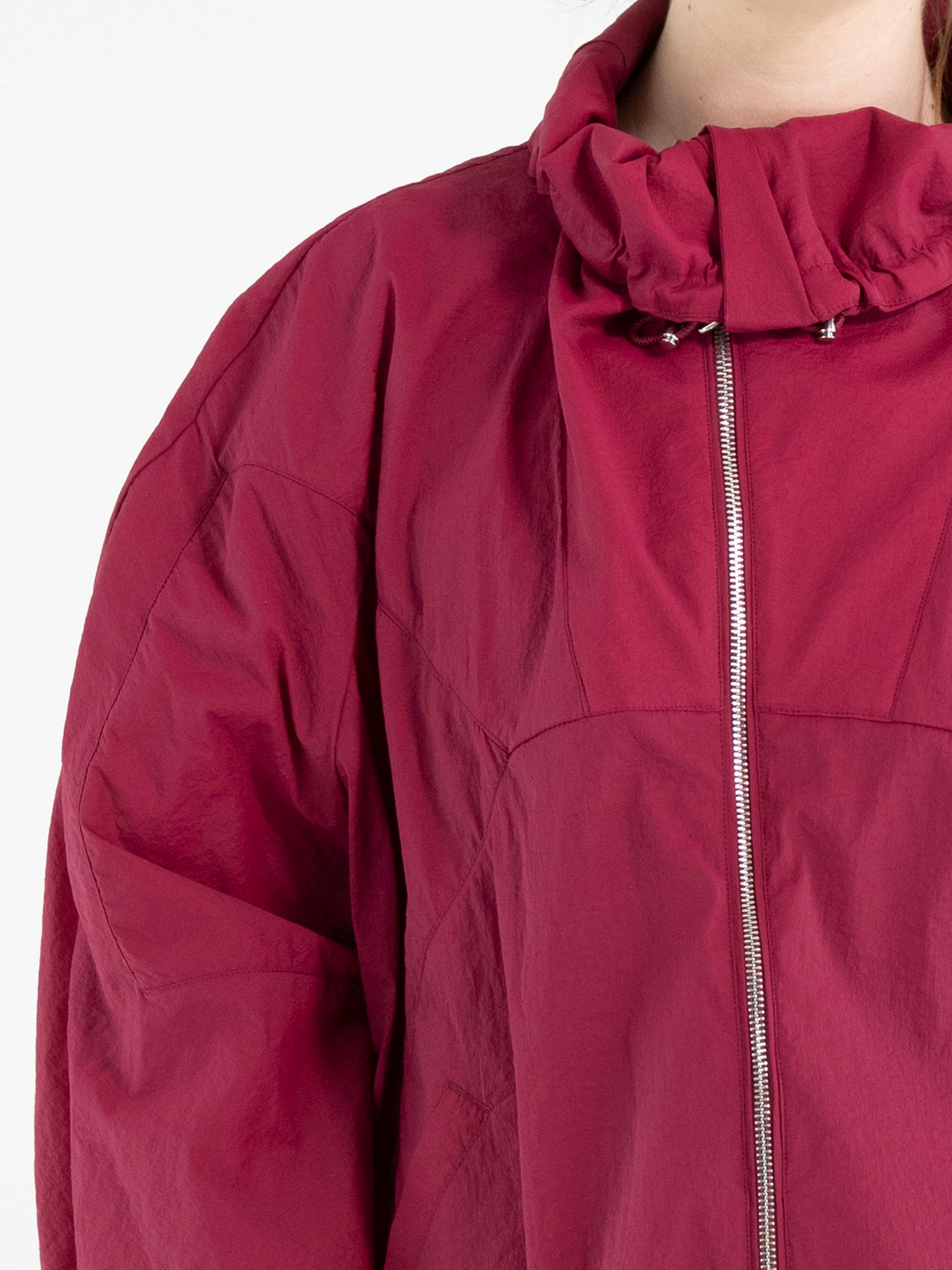 A coat from High in a raspberry red colour. Along the edge of the collar and at the hem, a drawstring runs through a tunnel construction, allowing a pleated effect to be created. The edges of the long sleeves are finished with a finely pleated elastic band. The coat features slit pockets with silver-coloured zip fastenings. This coat can be hand-washed.