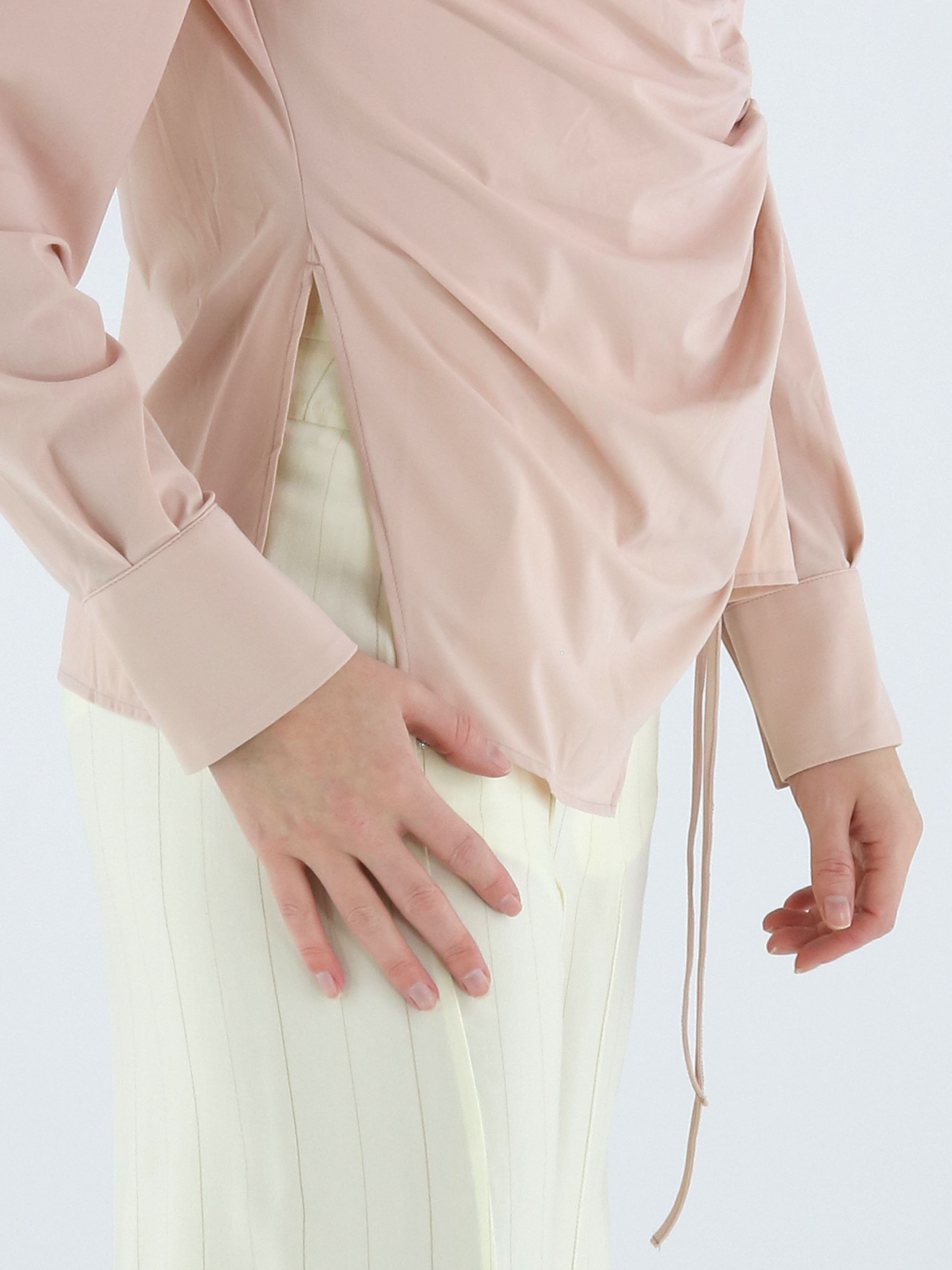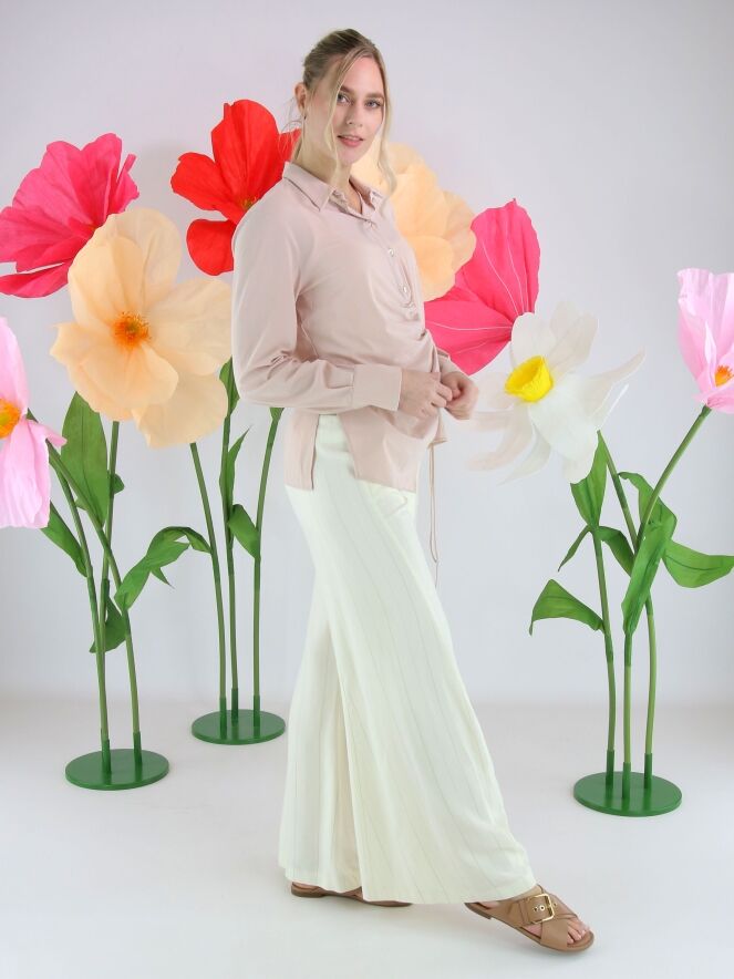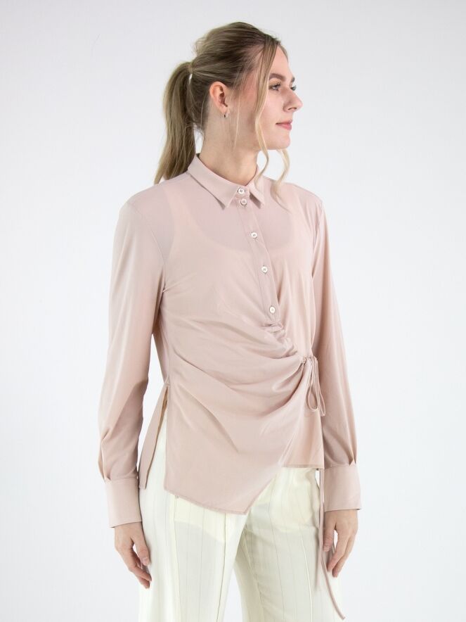 Bluse von High in einem zarten Puderrosa. Die Knopfleiste reicht vom Halsausschnitt bis unter die Brust. Ab dort sorgt ein Tunnelzugband für einen dezenten Falteneffekt, während ein zweites Band in der Taille zu einer Schleife gebunden werden kann. Dadurch entsteht eine verspielte, asymmetrische Silhouette. Diese exklusive Designerbluse kann bei 30 Grad gewaschen werden.