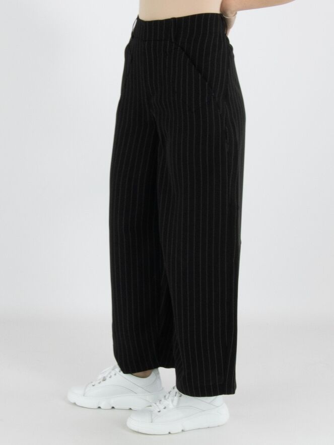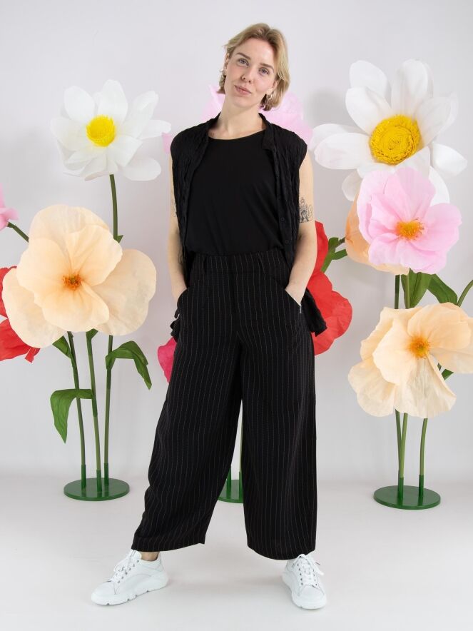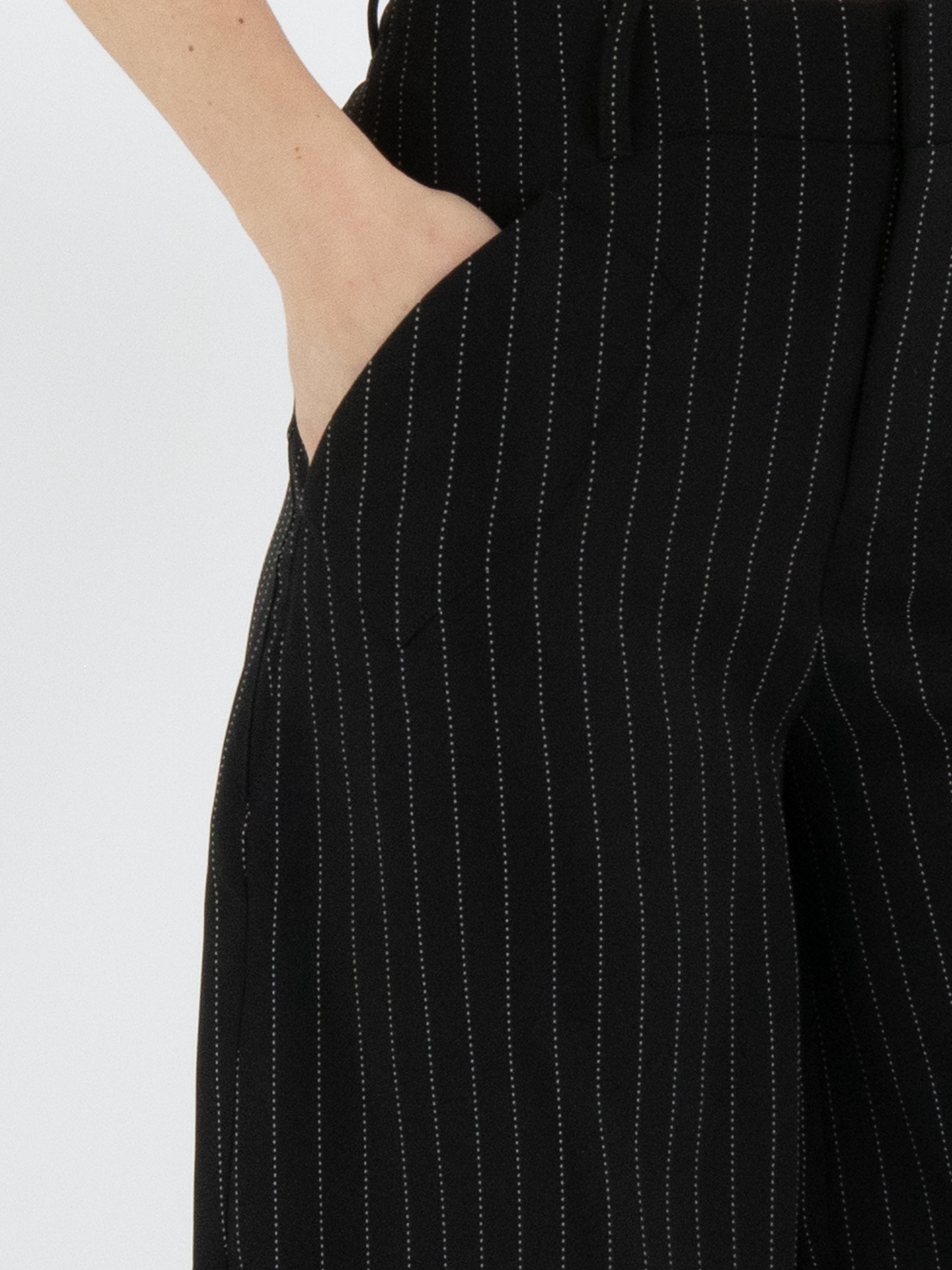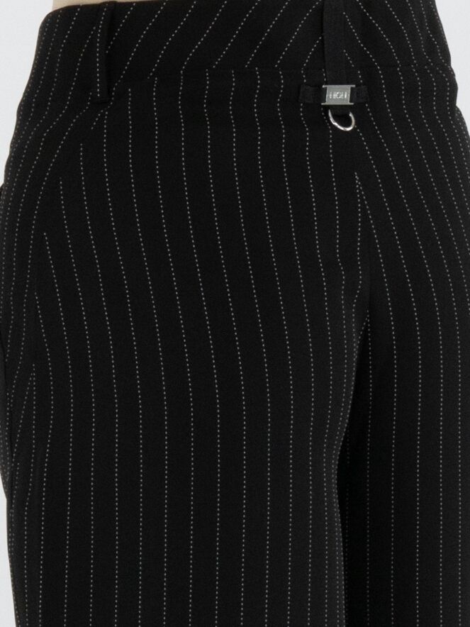 Eine Kreidestreifenhose von High Tech in Schwarz mit weißen Nähten. Auf Kniehöhe befindet sich eine horizontale Naht. Die Hose hat Eingrifftaschen mit diagonal geschnittenen Kanten. Diese Hose kann per Hand gewaschen werden.