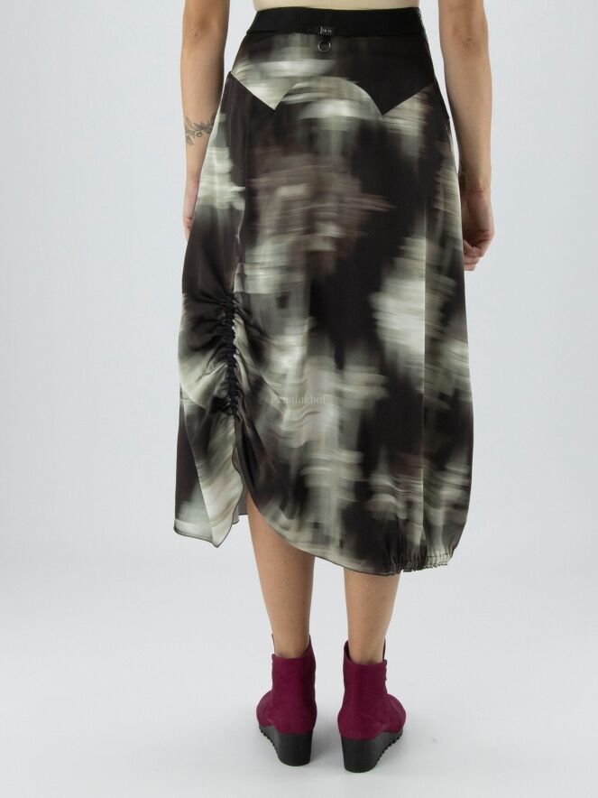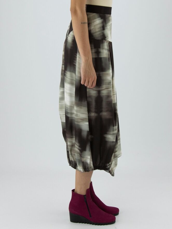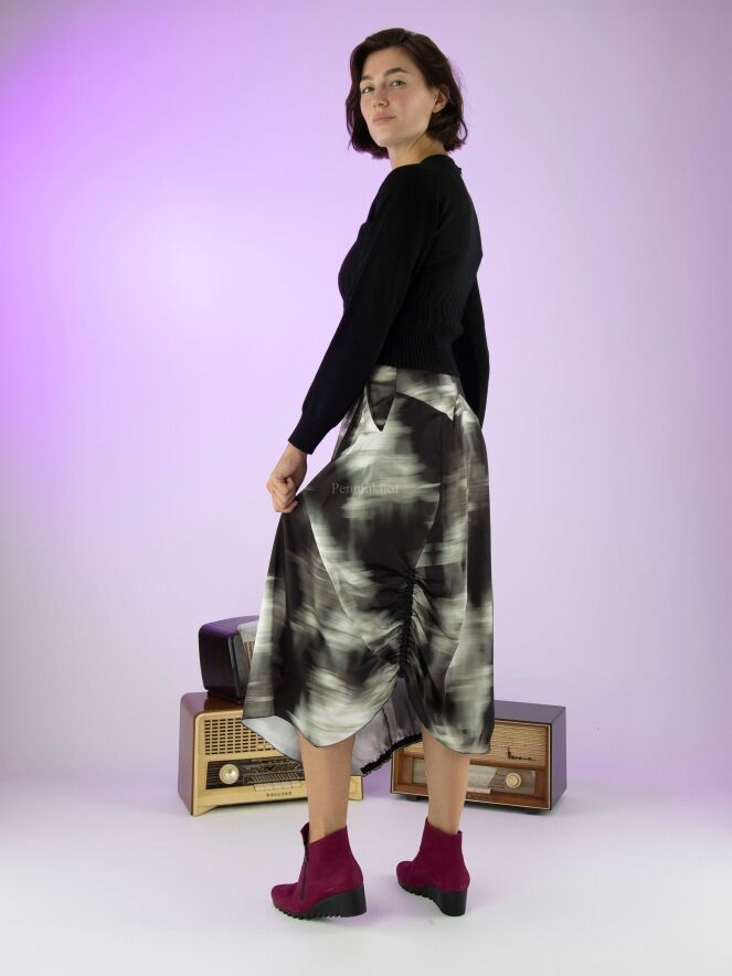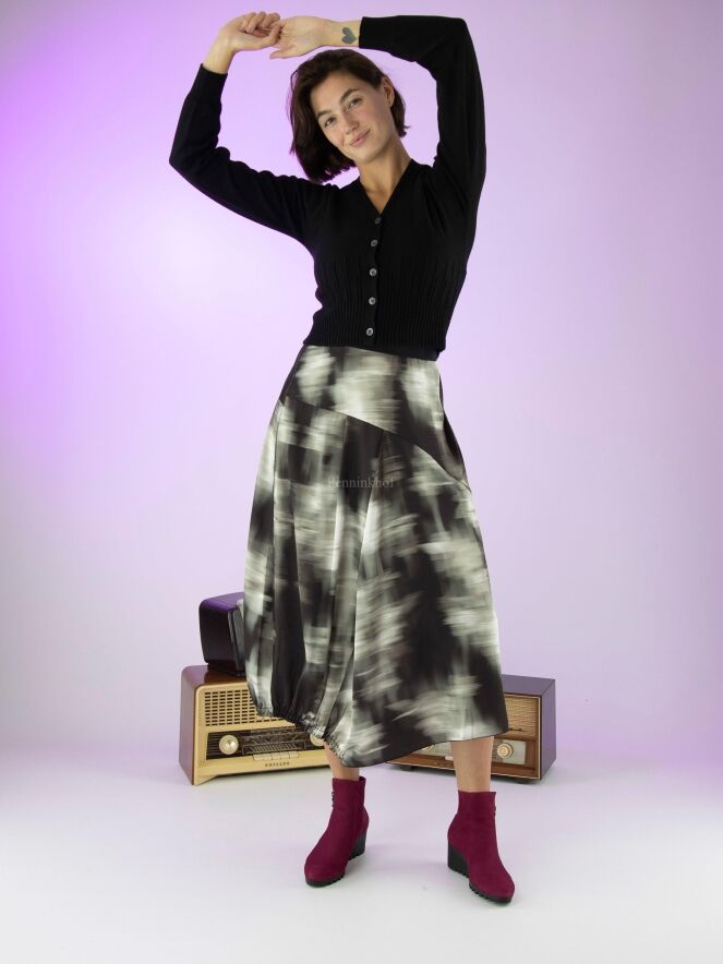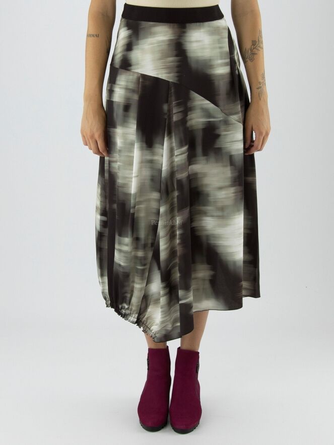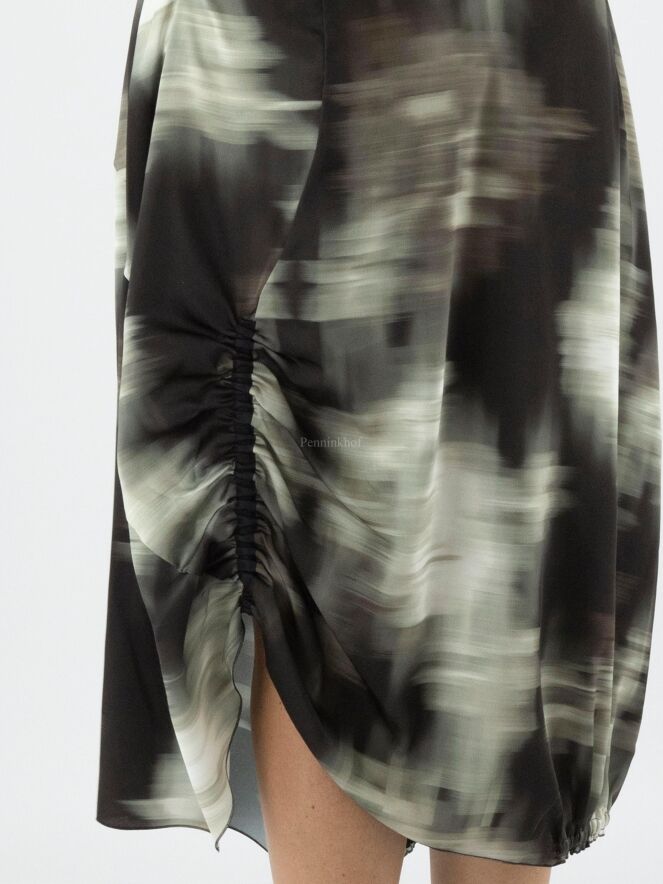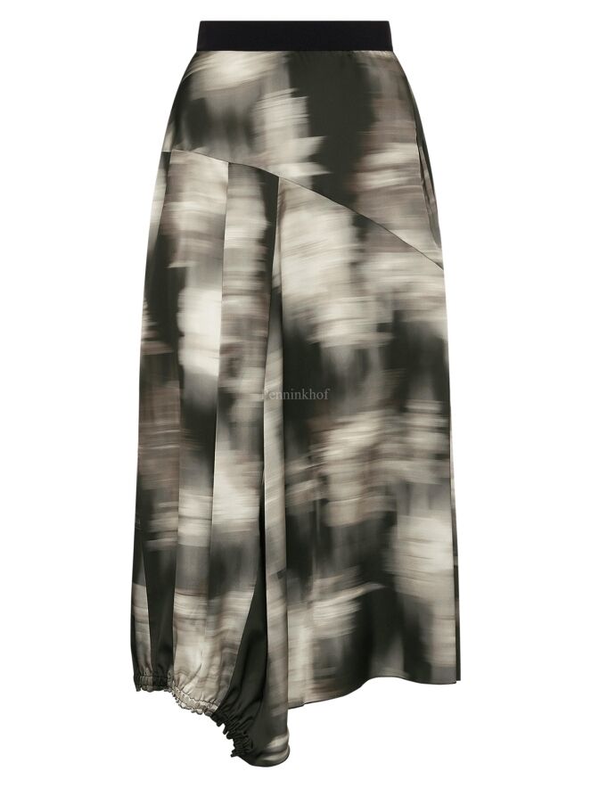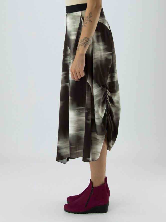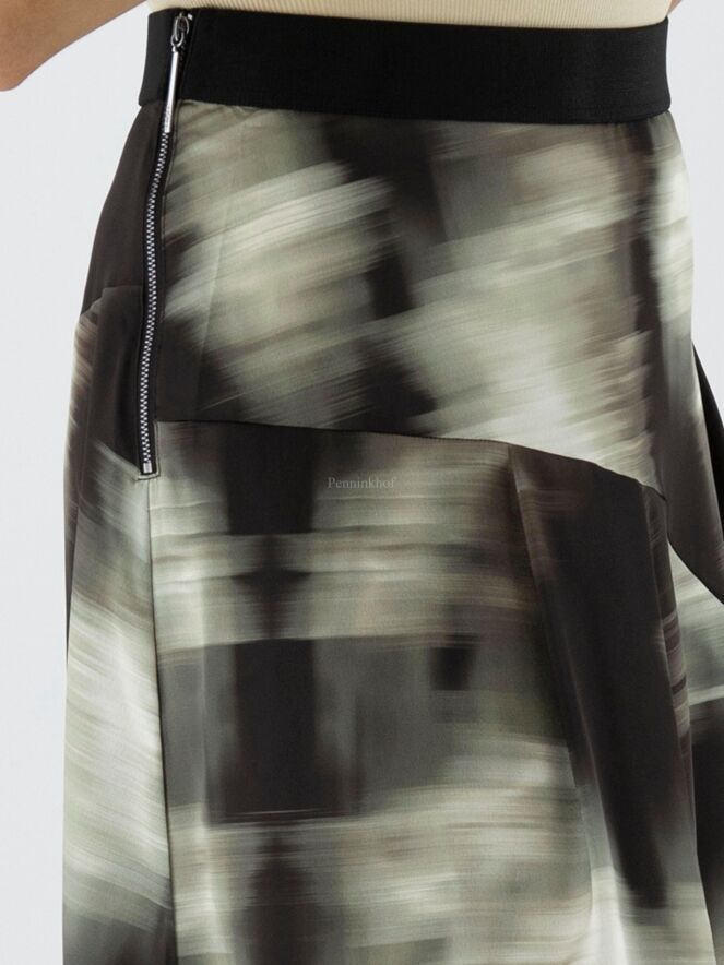 Ein Rock von High mit einem grafischen Druck in den Farben Olivgrün, Schwarz und Cremeweiß. In der Taille befindet sich ein Gummiband. Auf der Rückseite befindet sich auf der linken Seite eine vertikale, fein plissierte Naht von Kniehöhe abwärts. Auf der rechten Seite befindet sich ein Reißverschluss in der Taille und auf der linken Seite eine Einschubtasche. Dieser Rock kann mit der Hand gewaschen werden.