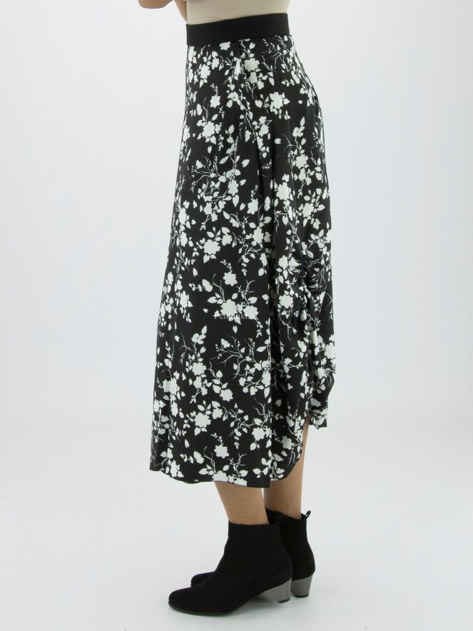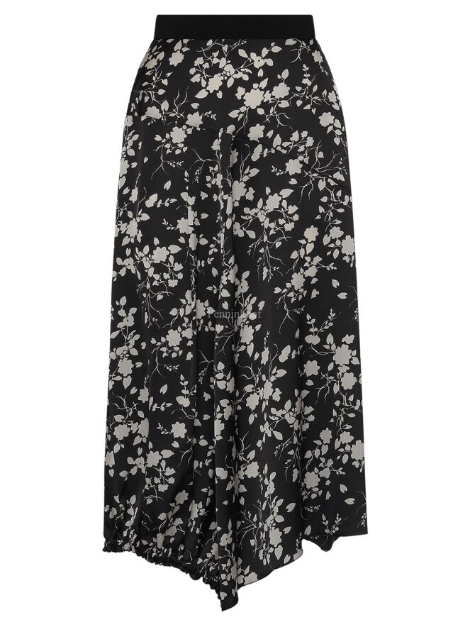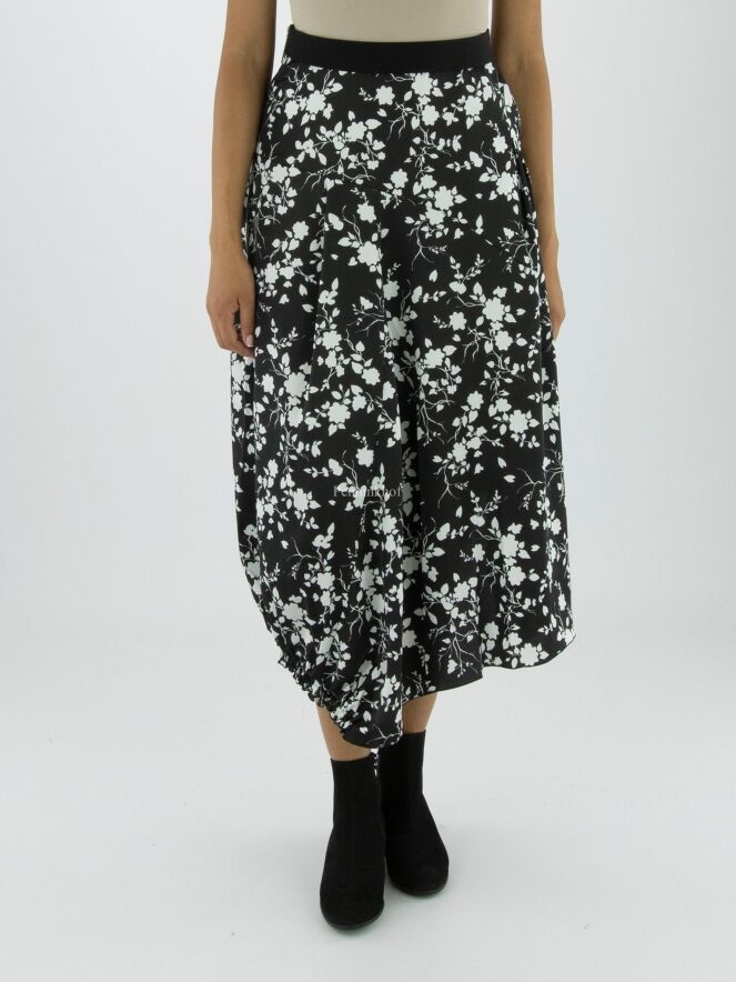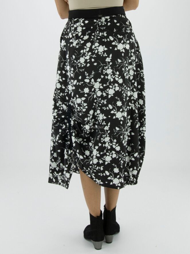 Ein Rock von High mit einem grafischen Blumendruck in den Farben Marineblau und Weiß. In der Taille befindet sich ein Gummiband. Auf der Rückseite befindet sich auf der linken Seite eine vertikale, fein plissierte Naht ab Kniehöhe abwärts. Auf der rechten Seite befindet sich ein Reißverschluss in der Taille und auf der linken Seite eine Einschubtasche. Dieser Rock kann mit der Hand gewaschen werden.