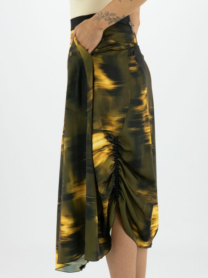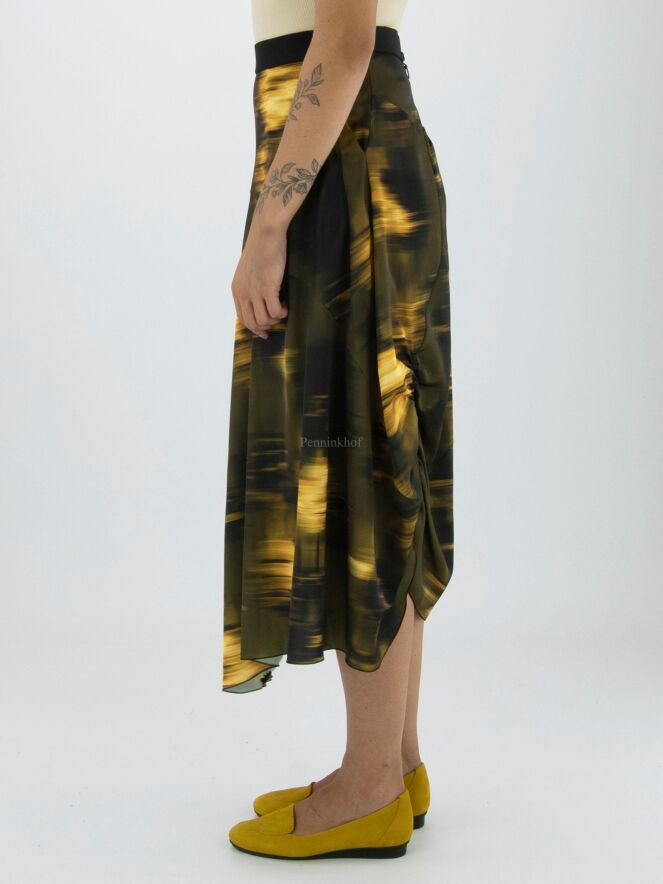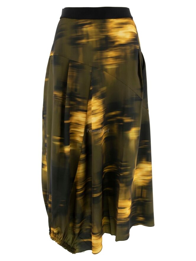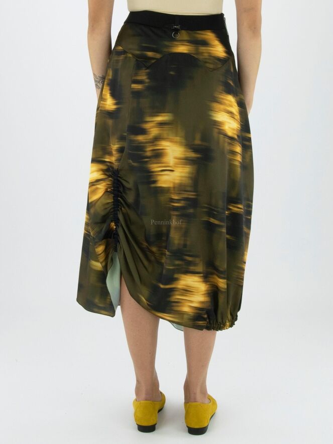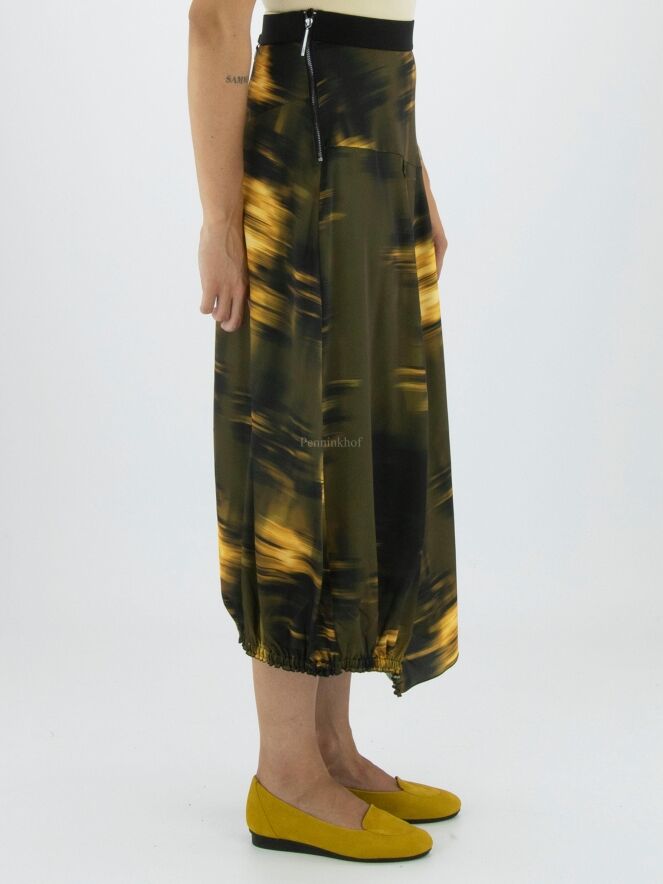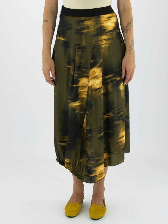 Ein Rock von High mit einem grafischen Druck in den Farben Olivgrün, Ockergelb und Schwarz. In der Taille befindet sich ein Gummiband. Auf der Rückseite befindet sich auf der linken Seite eine vertikale, feine Plissee-Naht ab Kniehöhe abwärts. Auf der rechten Seite befindet sich ein Reißverschluss in der Taille und auf der linken Seite eine Einschubtasche. Dieser Rock kann mit der Hand gewaschen werden.