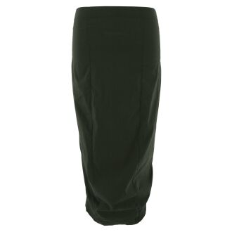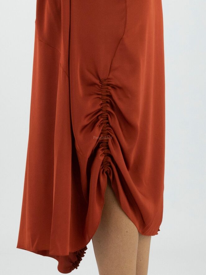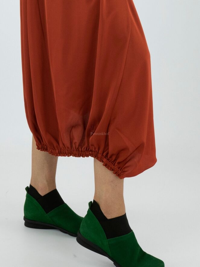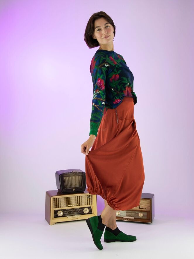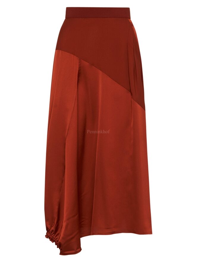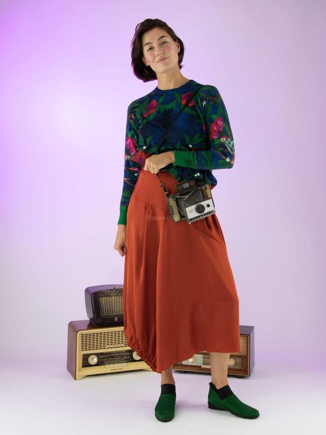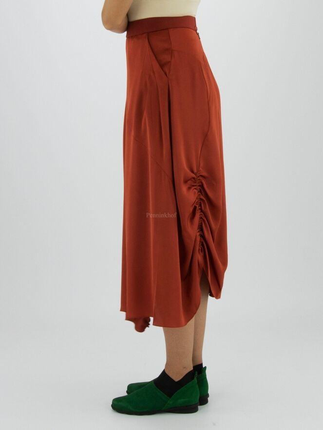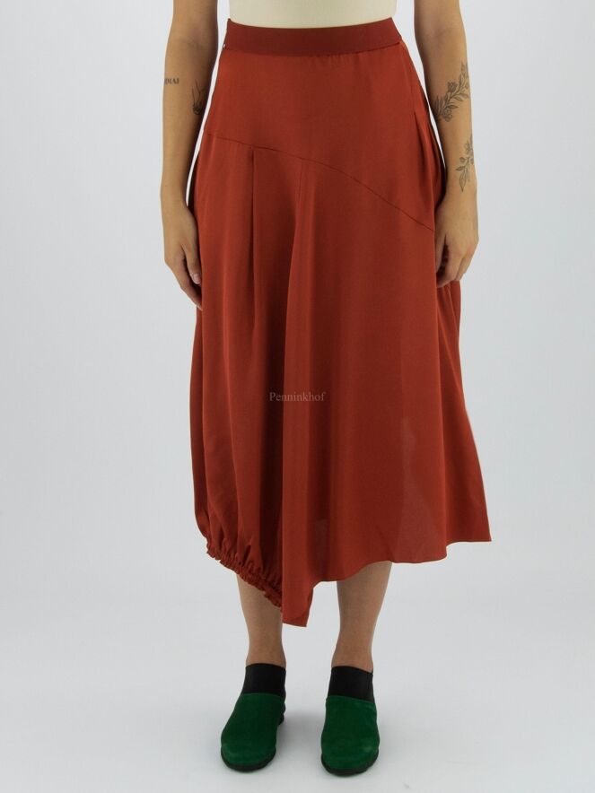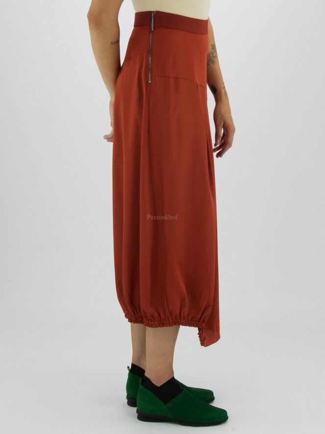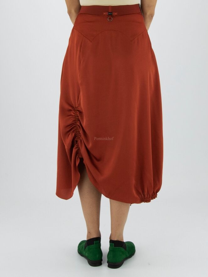 Ein Rock von High in einer Rostfarbe. Er hat einen Gummizug in der Taille. Auf der Rückseite befindet sich auf der linken Seite eine vertikale Naht mit feinen Falten, die von der Kniehöhe abwärts verläuft. Auf der rechten Seite befindet sich ein Reißverschluss in der Taille und auf der linken Seite eine Schlupftasche. Dieser Rock kann mit der Hand gewaschen werden.