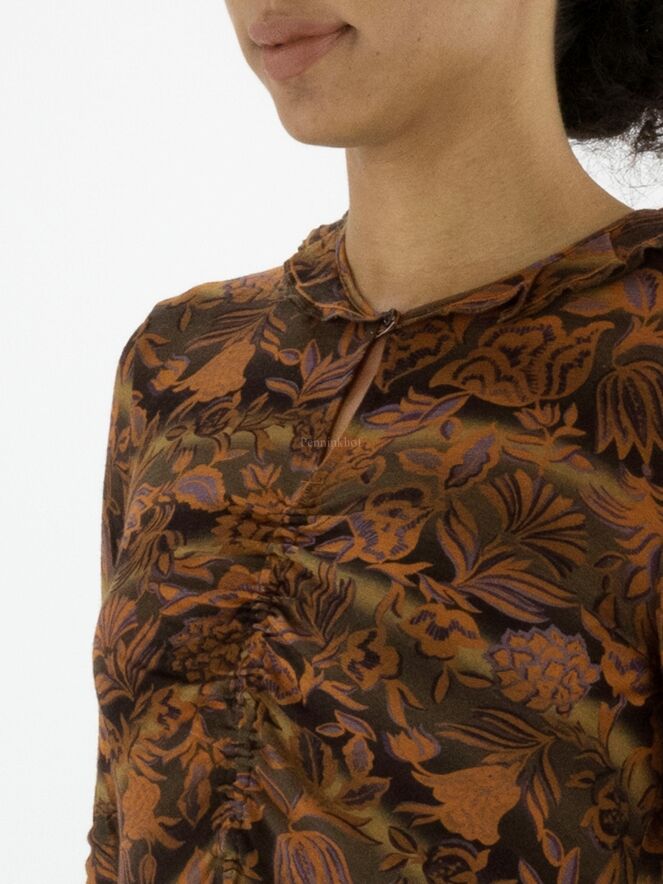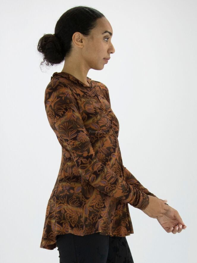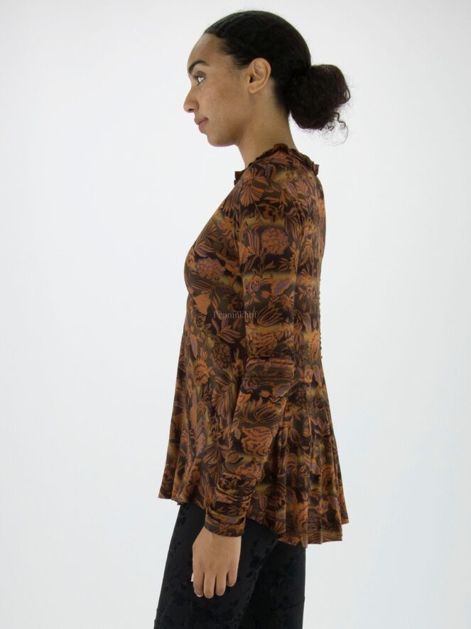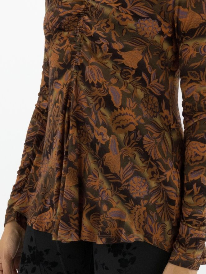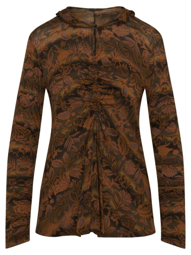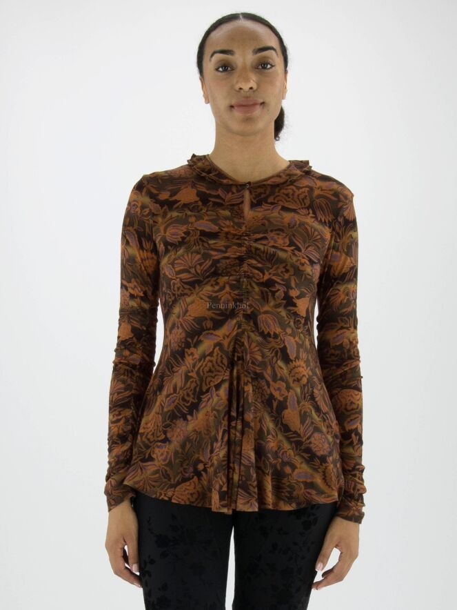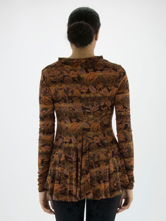 Ein Shirt von High mit einem Blumendruck in verschiedenen Grün- und Orangetönen mit lila Details. Das Shirt hat einen Rundhalsausschnitt mit einem kurzen Rundkragen, der an einigen Stellen in Falten gelegt ist. Die Nähte am unteren Ende der langen Ärmel sind in feine Falten gelegt. Ab der Taille hat das Shirt eine A - Linie. Dieses Shirt kann mit der Hand gewaschen werden.
