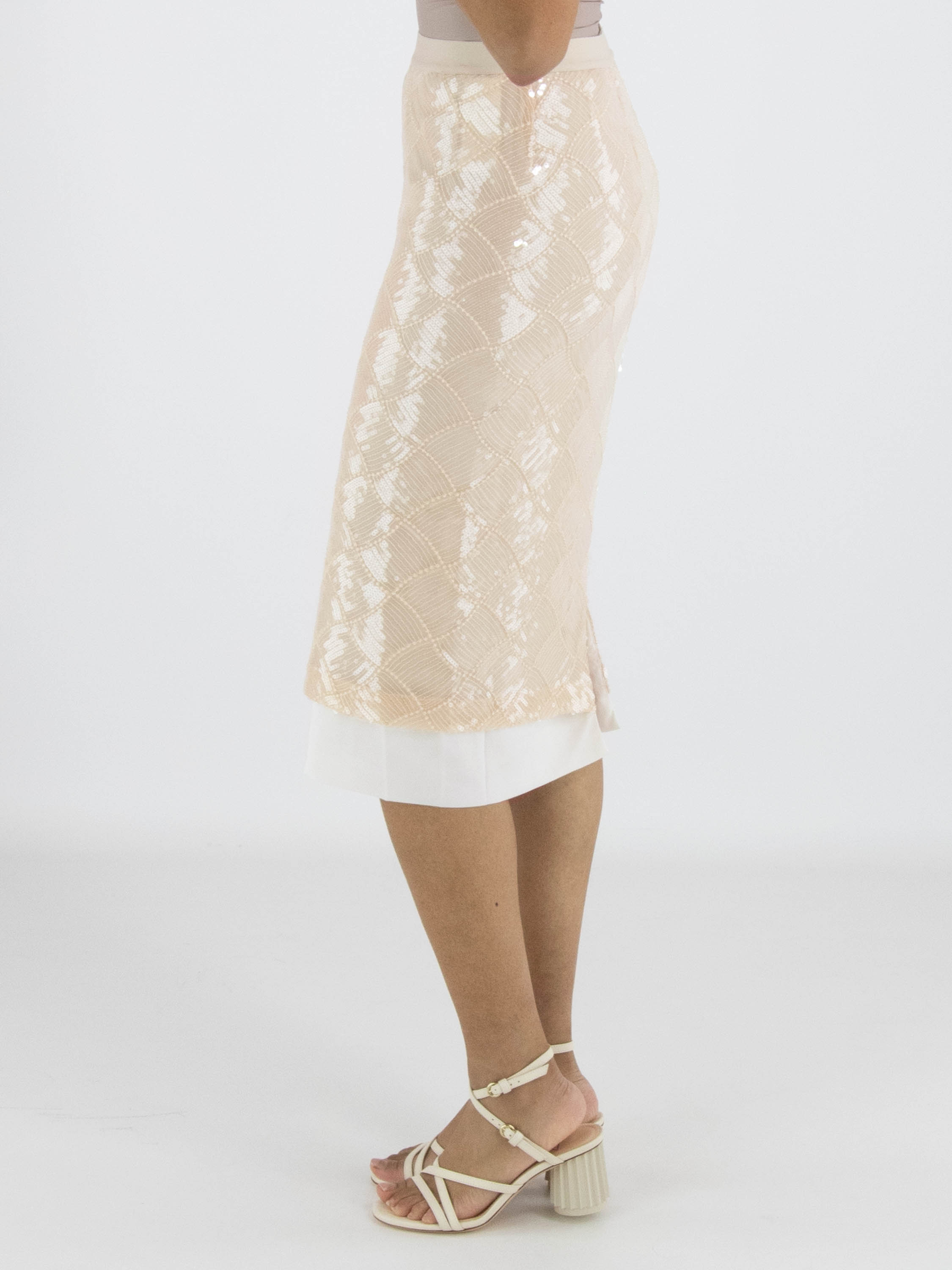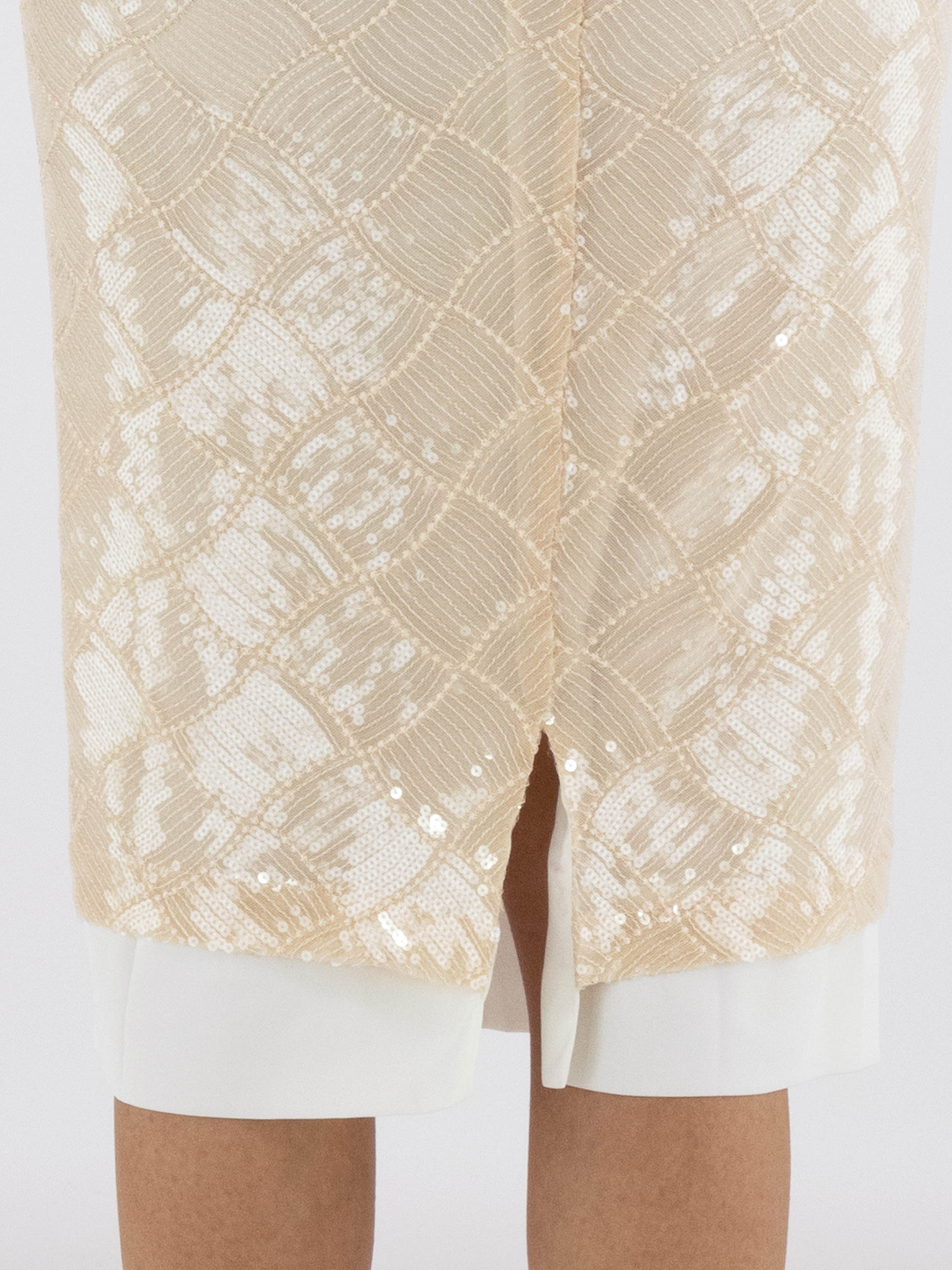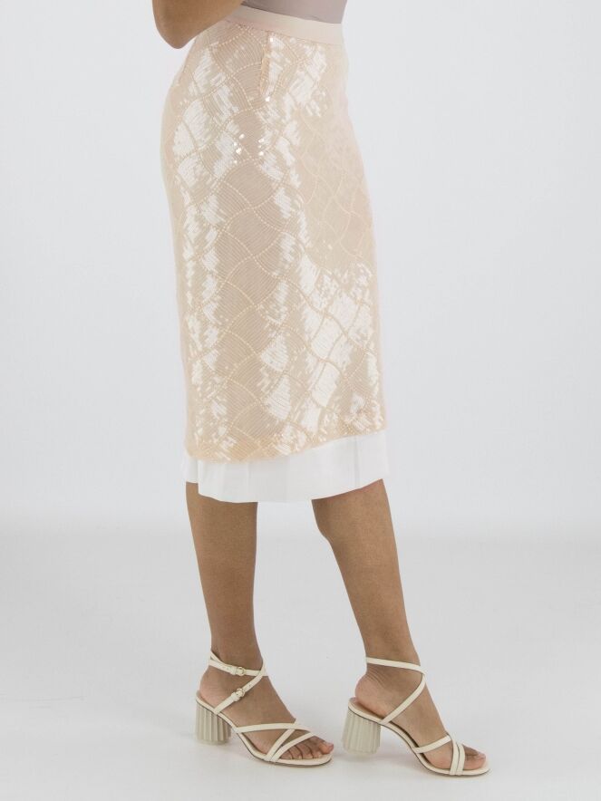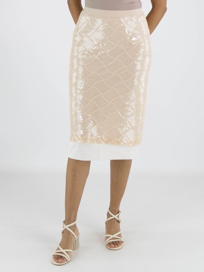 Ein Rock von High Lab in Vanillefarbe. Der Stoff zeigt ein wellenförmiges diagonales Karomuster, wobei in den Nähten transparente Pailletten eingearbeitet sind, die einen schimmernden Effekt erzeugen. In der Taille befindet sich ein elastischer Bund. Der Unterrock ragt 5 cm unter den Rock hervor. Am unteren Abschluss befindet sich an beiden Seiten ein Schlitz mit rund geschnittenem Saum. Dieser Rock kann per Hand gewaschen werden.