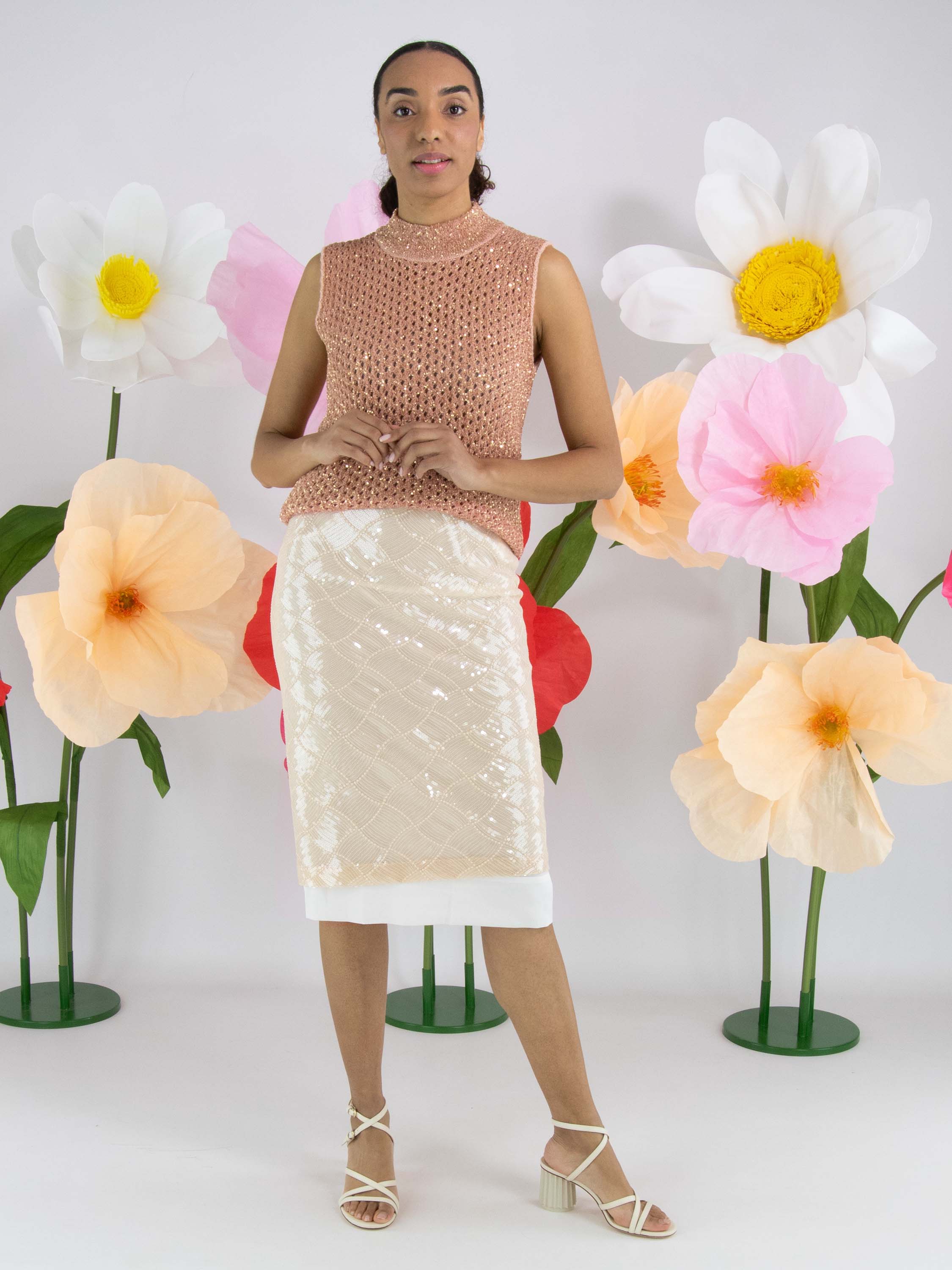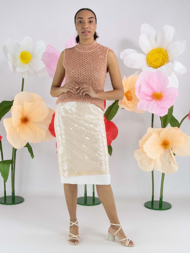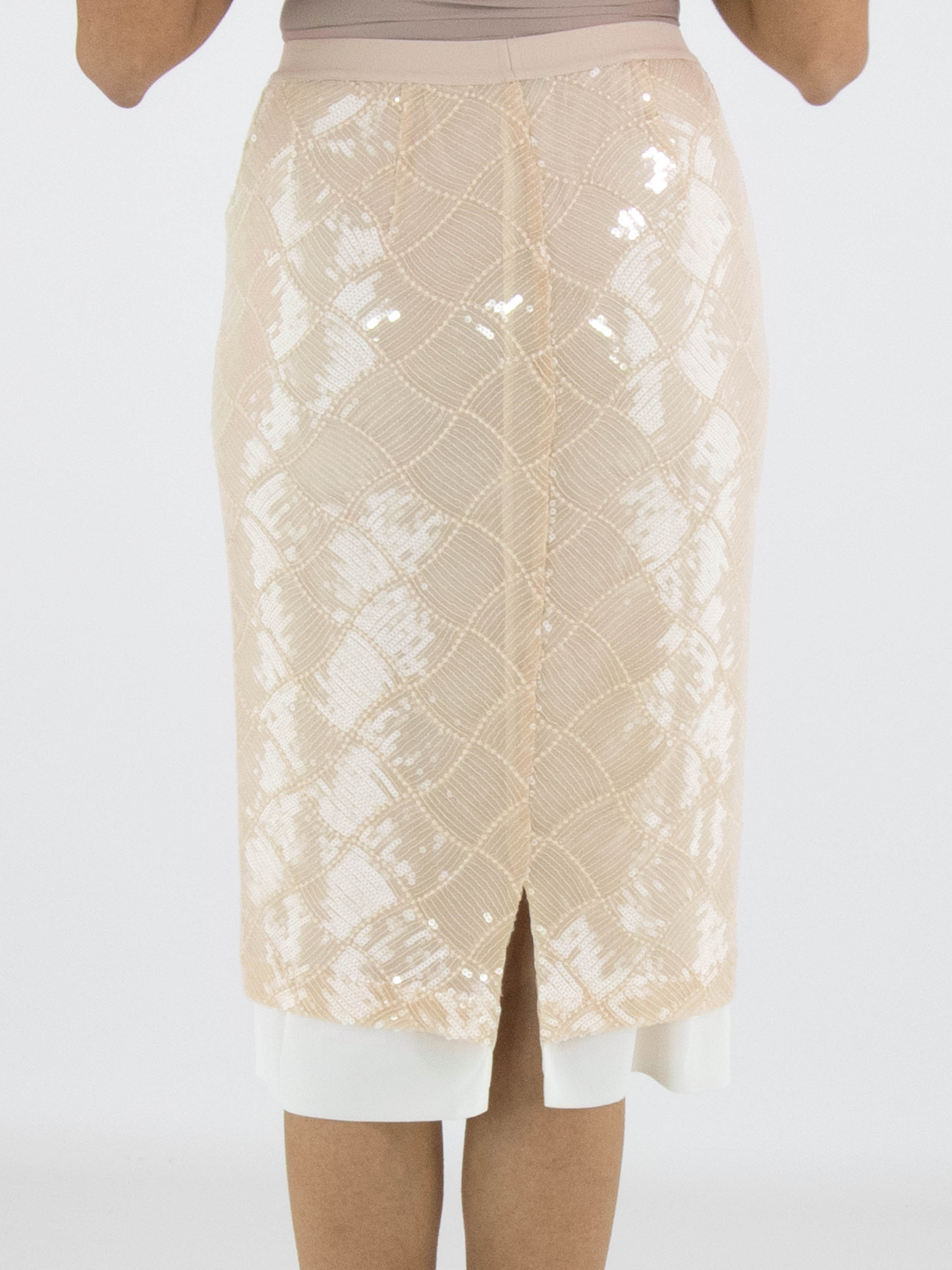 Ein Rock von High Lab in Vanillefarbe. Der Stoff zeigt ein wellenförmiges diagonales Karomuster, wobei in den Nähten transparente Pailletten eingearbeitet sind, die einen schimmernden Effekt erzeugen. In der Taille befindet sich ein elastischer Bund. Der Unterrock ragt 5 cm unter den Rock hervor. Am unteren Abschluss befindet sich an beiden Seiten ein Schlitz mit rund geschnittenem Saum. Dieser Rock kann per Hand gewaschen werden.