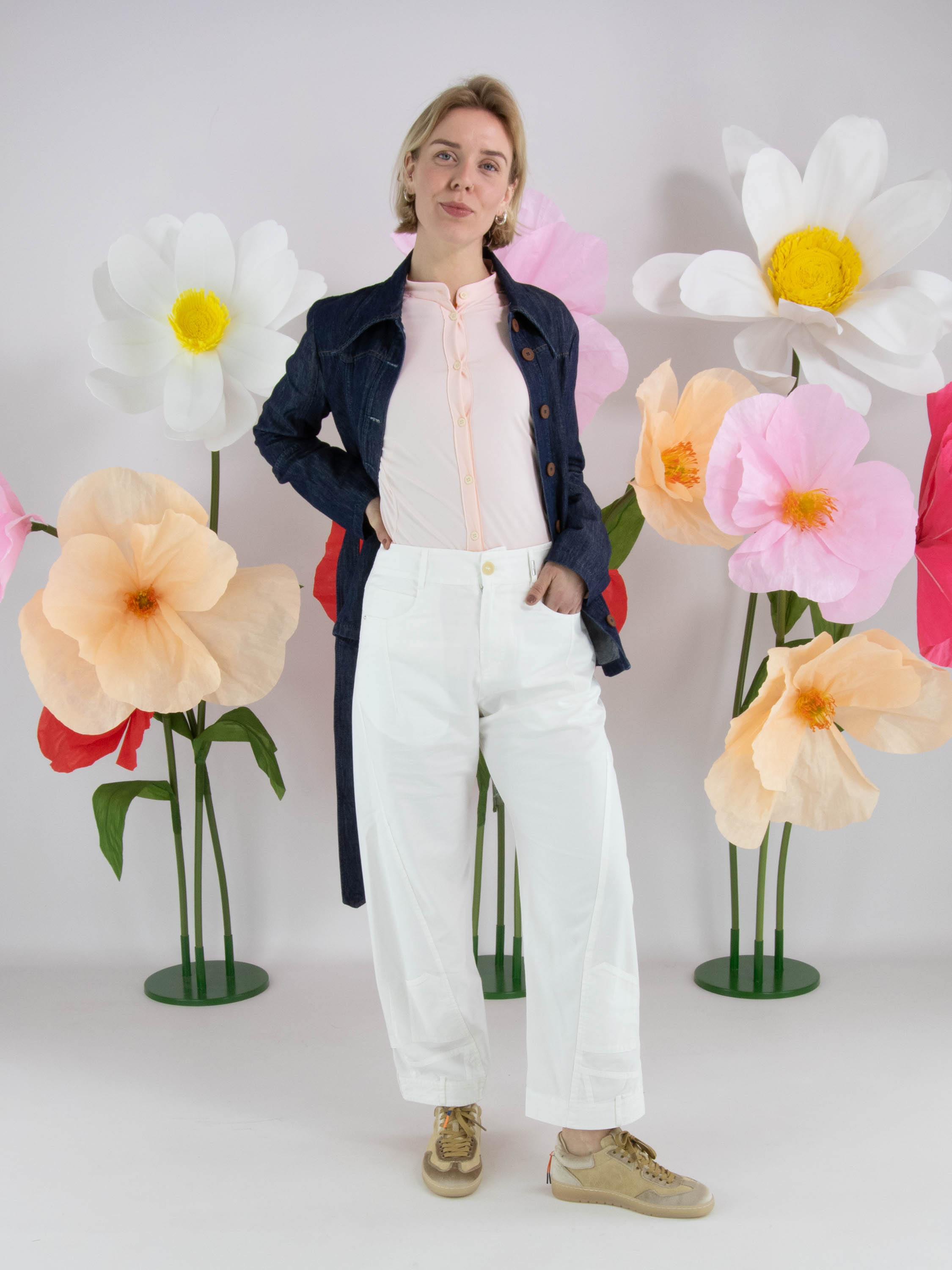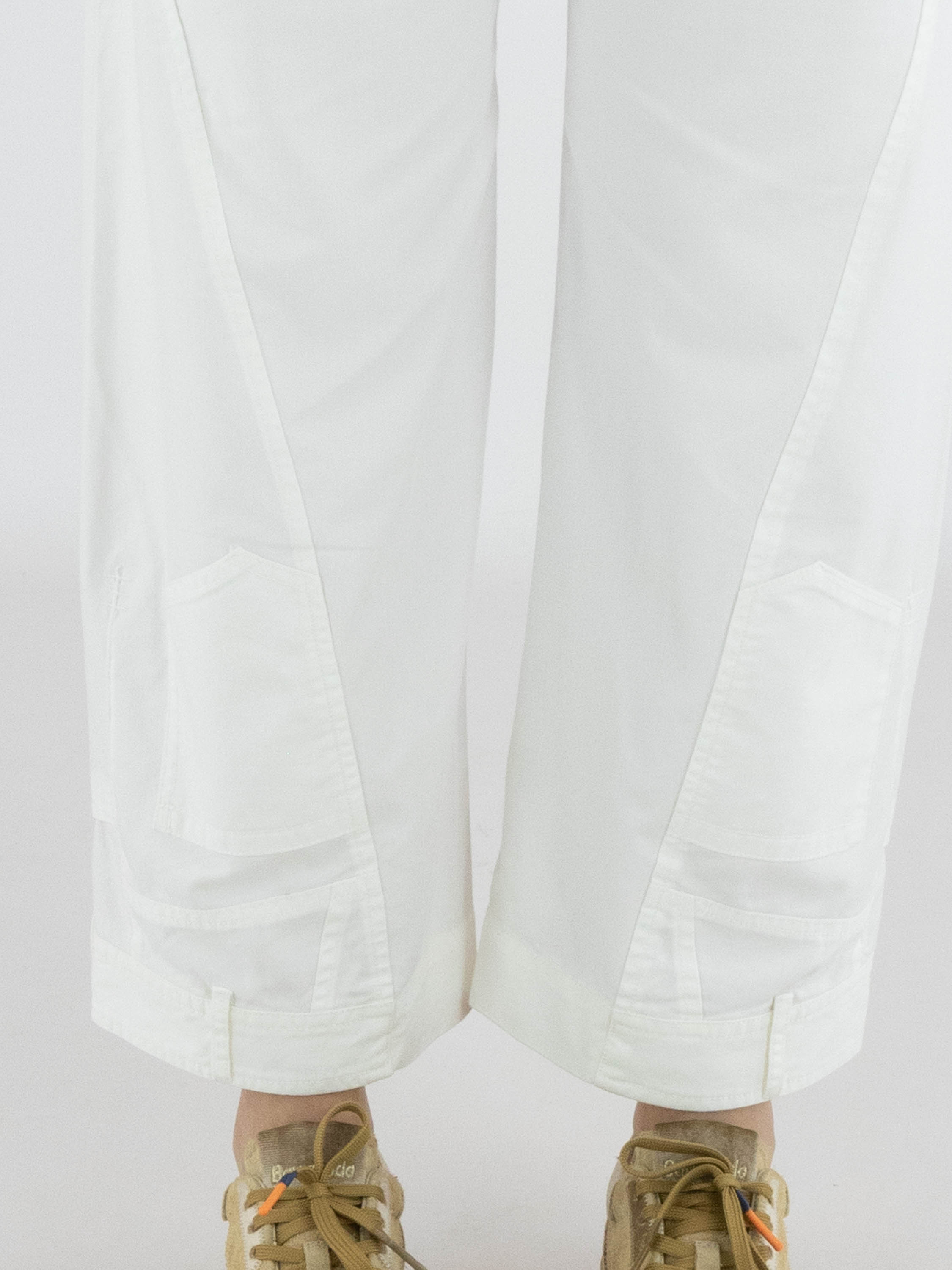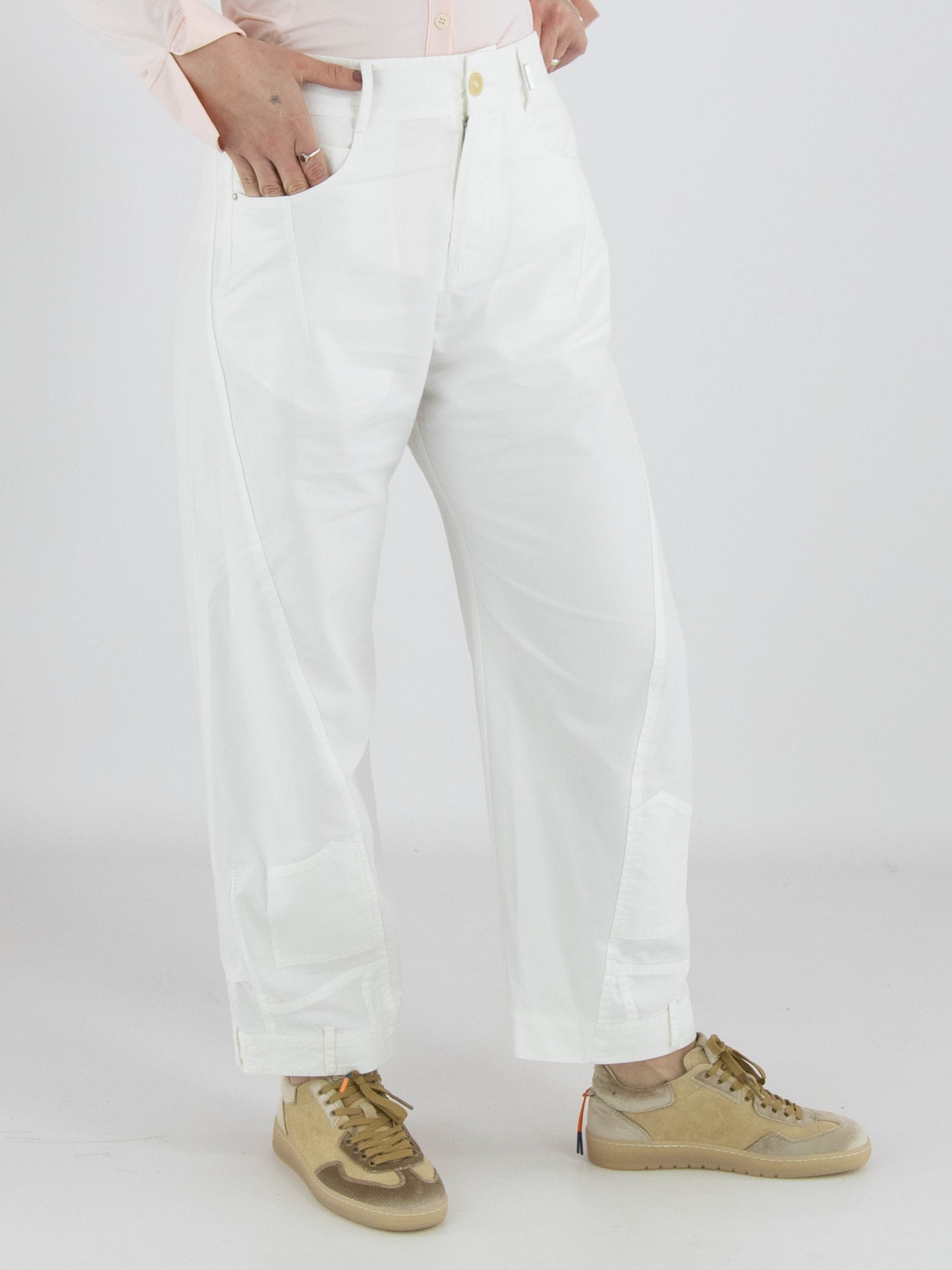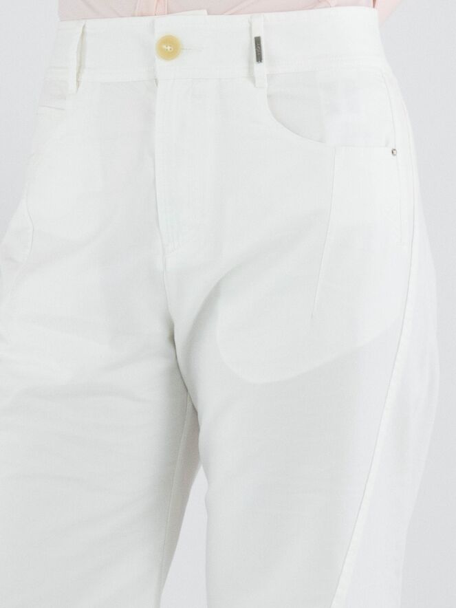 Eine Hose von High aus einem sommerlichen Baumwollstoff in Cremeweiß. Die Hose ist im 5-Pocket-Stil gefertigt. Am unteren Beinabschluss ist an einem Hosenbein eine umgekehrte dekorative Tasche mit Bund verarbeitet, am anderen Hosenbein eine umgekehrte Eingrifftasche mit Bund. Diese Design-Jeans kann bei 30 Grad gewaschen werden.