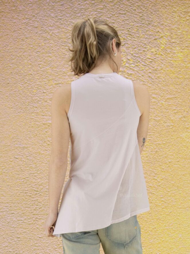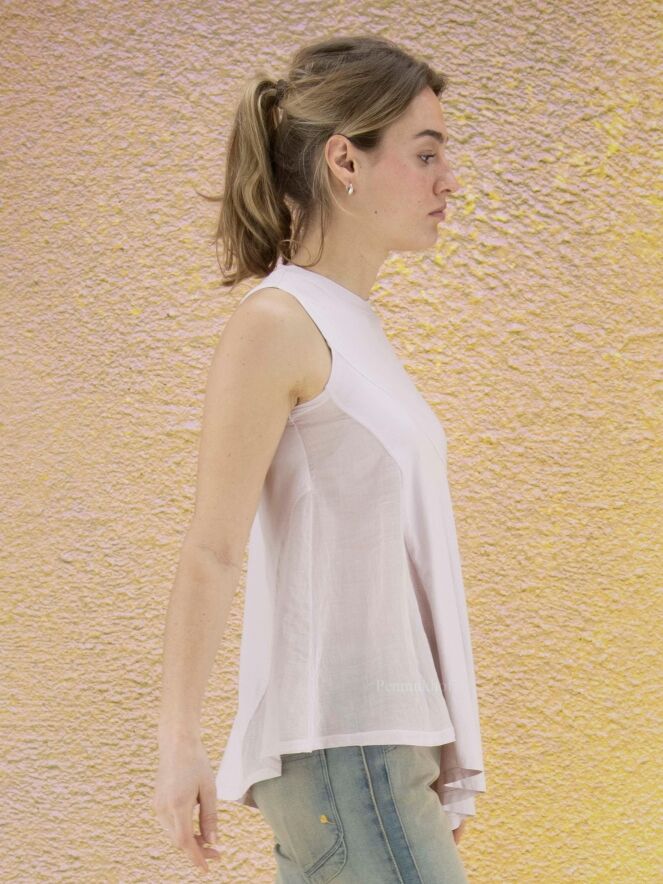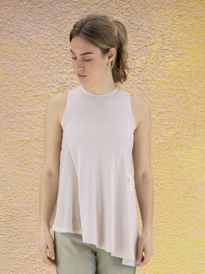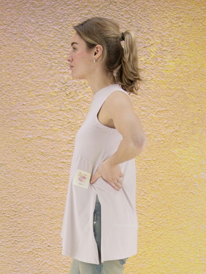 Ein lila Top der Designermarke High. Die linke Seite ist leicht transparent. Ein hoher Schlitz akzentuiert die rechte Seite. Die Unterseite des Oberteils ist diagonal geschnitten. Das Oberteil hat eine A-Linie und kann von Hand gewaschen werden.