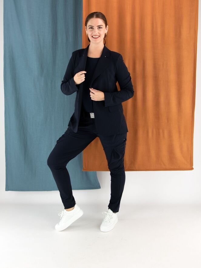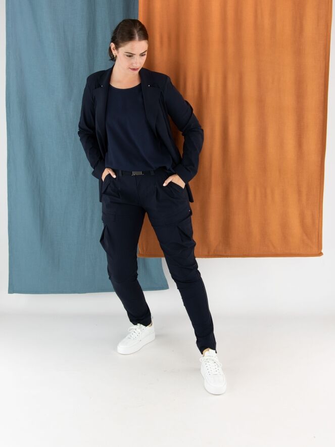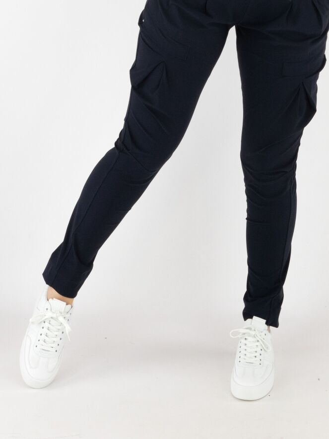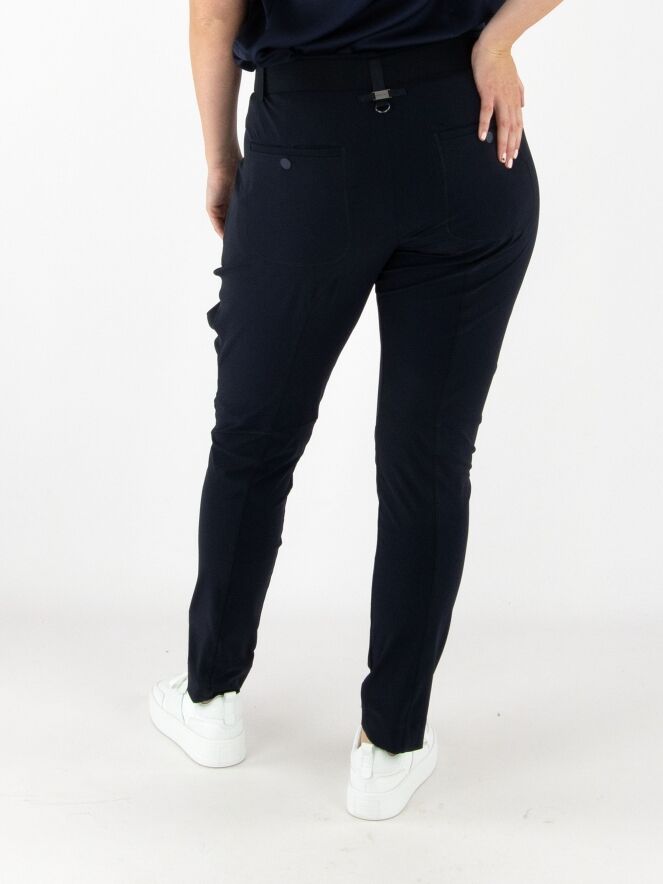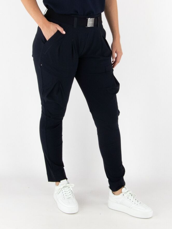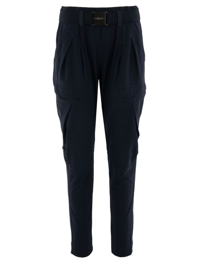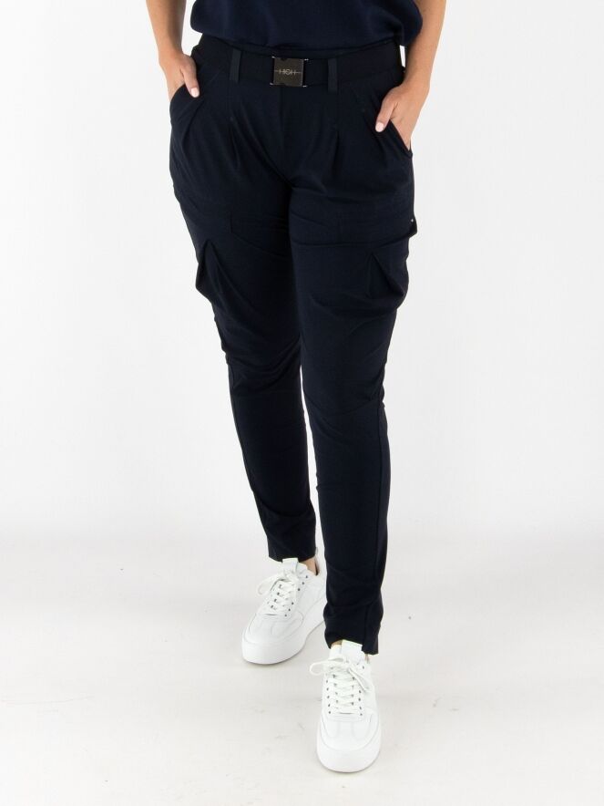 Hose von High in Marineblau. In der Taille befindet sich ein schwarzer elastischer Gürtel mit rechteckiger silberfarbener Schnalle. Unter dem Bund verlaufen einige Falten. An der Außenseite des Oberschenkels verläuft eine Bundfalte. Die Hose hat Eingrifftaschen und sollte von Hand gewaschen werden.