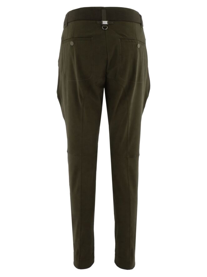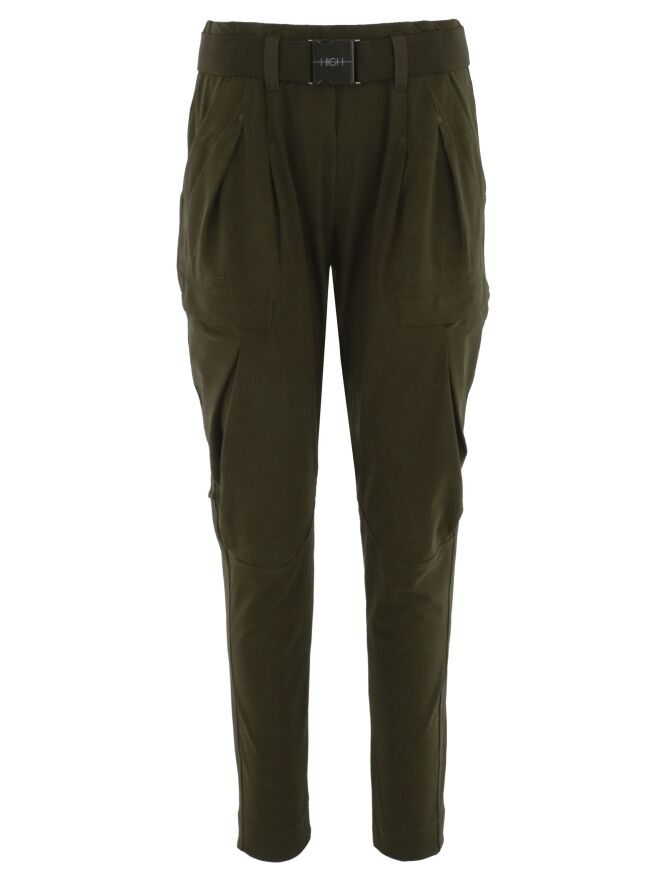Hose von High in Olivgrün. In der Taille befindet sich ein olivgrüner elastischer Gürtel mit rechteckiger silberfarbener Schnalle, darunter einige Bundfalten. An der Außenseite des Oberschenkels verläuft eine Bundfalte. Die Hose hat Eingrifftaschen und sollte von Hand gewaschen werden.