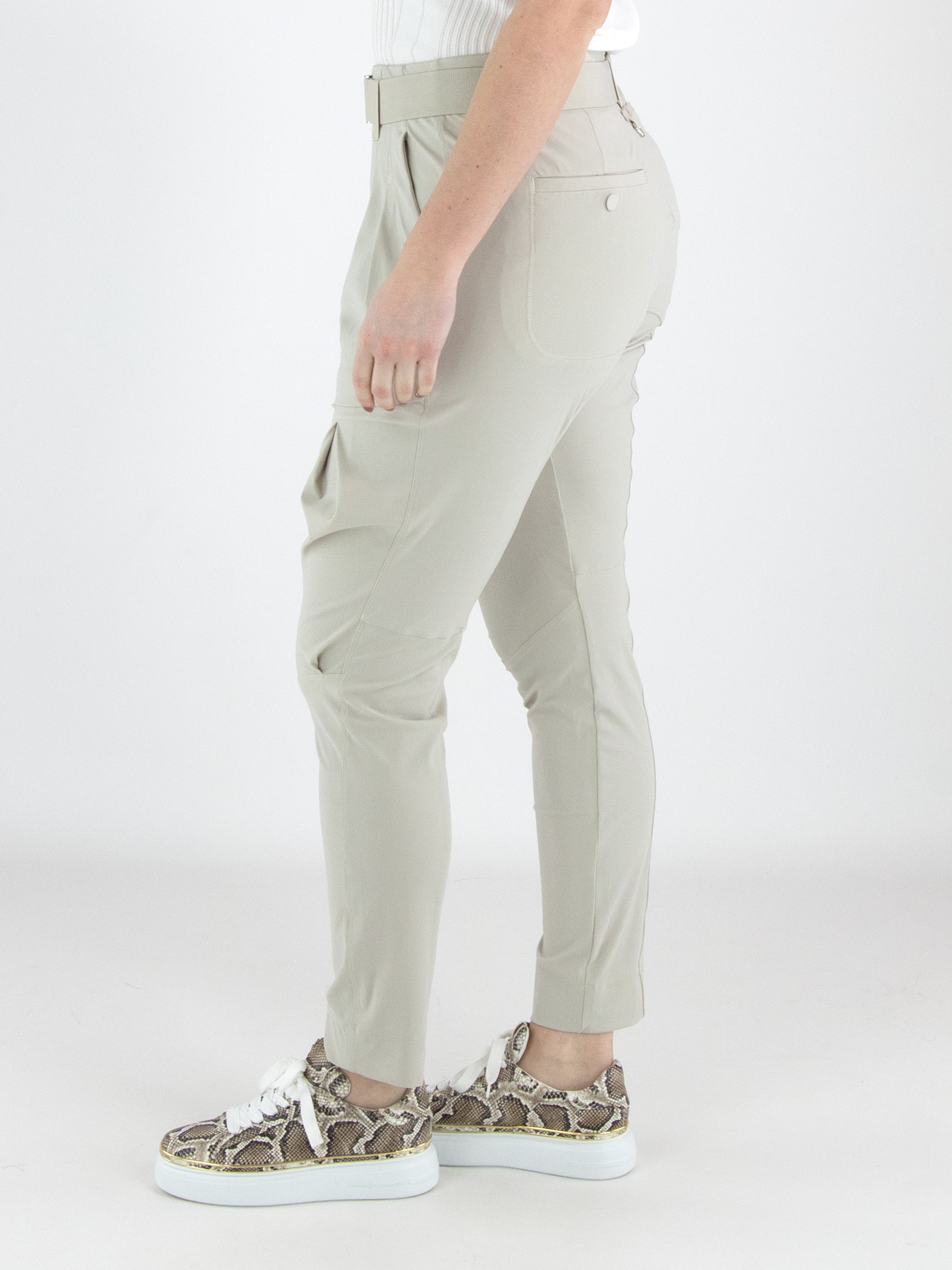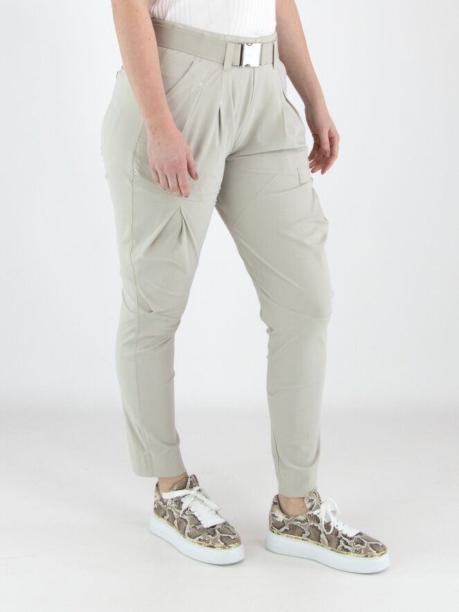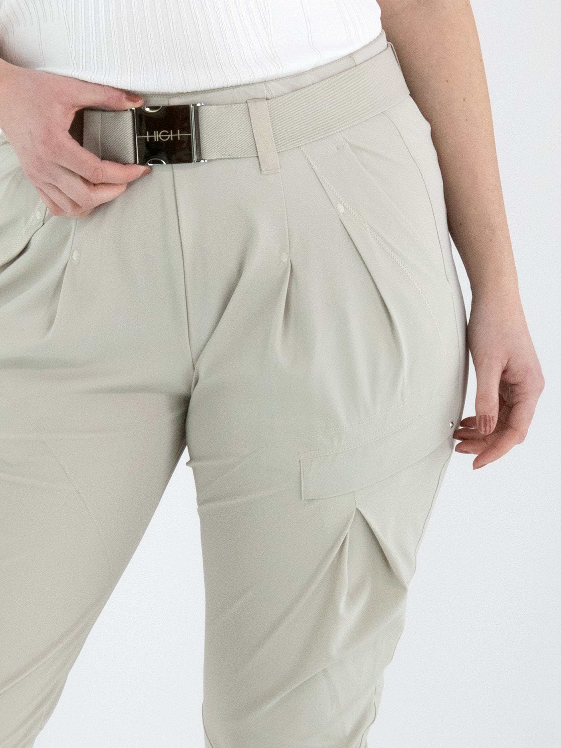 Eine Hose von High in der Farbe Kit. Der Bund ist mit einem elastischen Gürtel mit rechteckiger silberfarbener Schnalle gearbeitet, darunter befinden sich mehrere Bundfalten. Auch an der Außenseite des Oberschenkels verläuft eine Bundfalte. Die Hose verfügt über Seitentaschen und kann von Hand gewaschen werden.