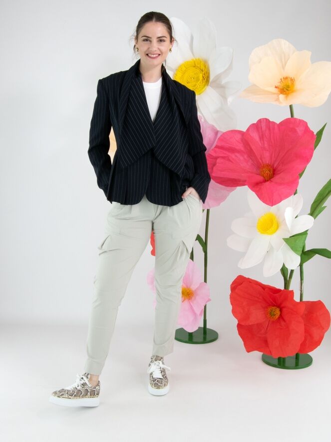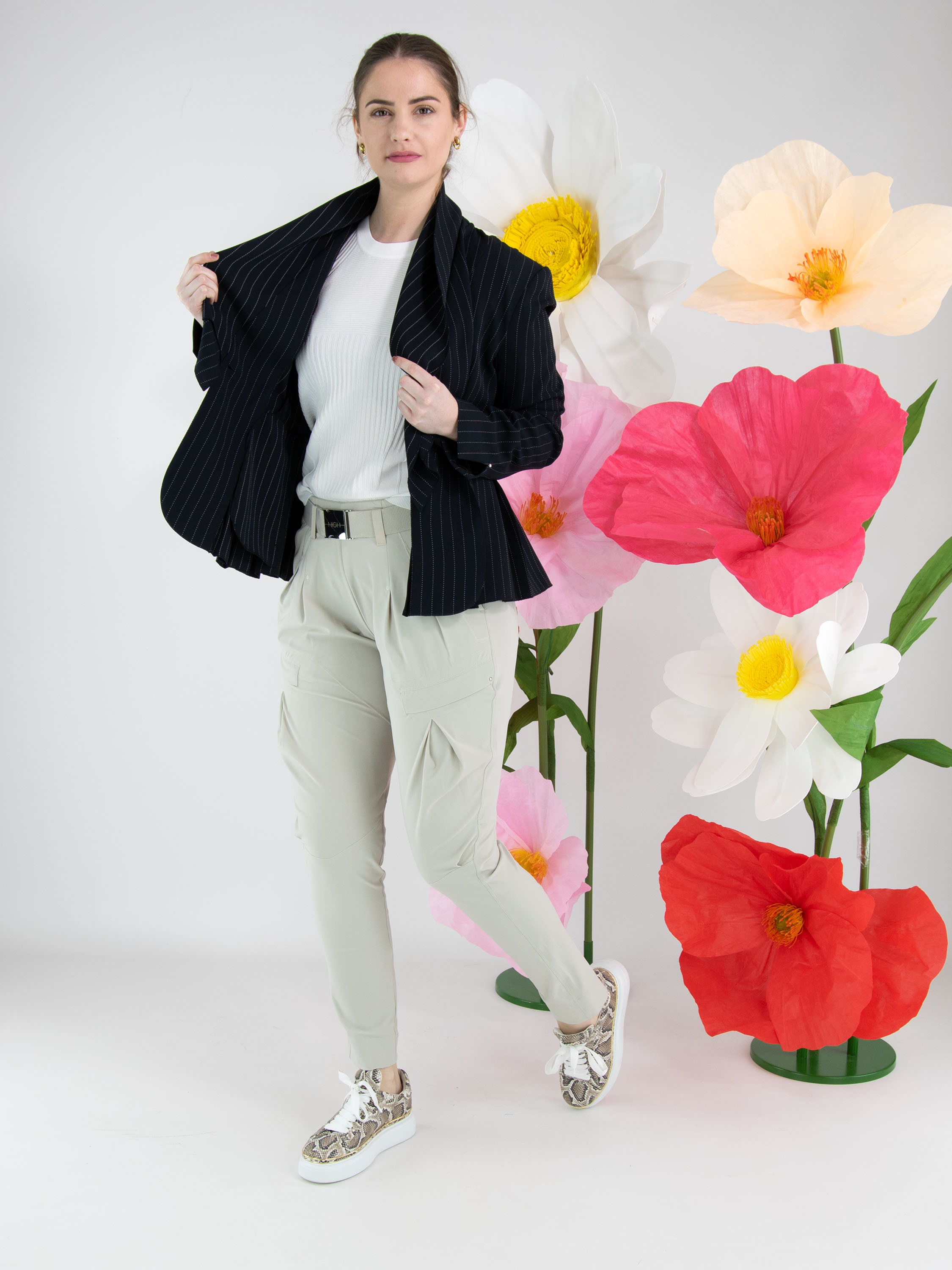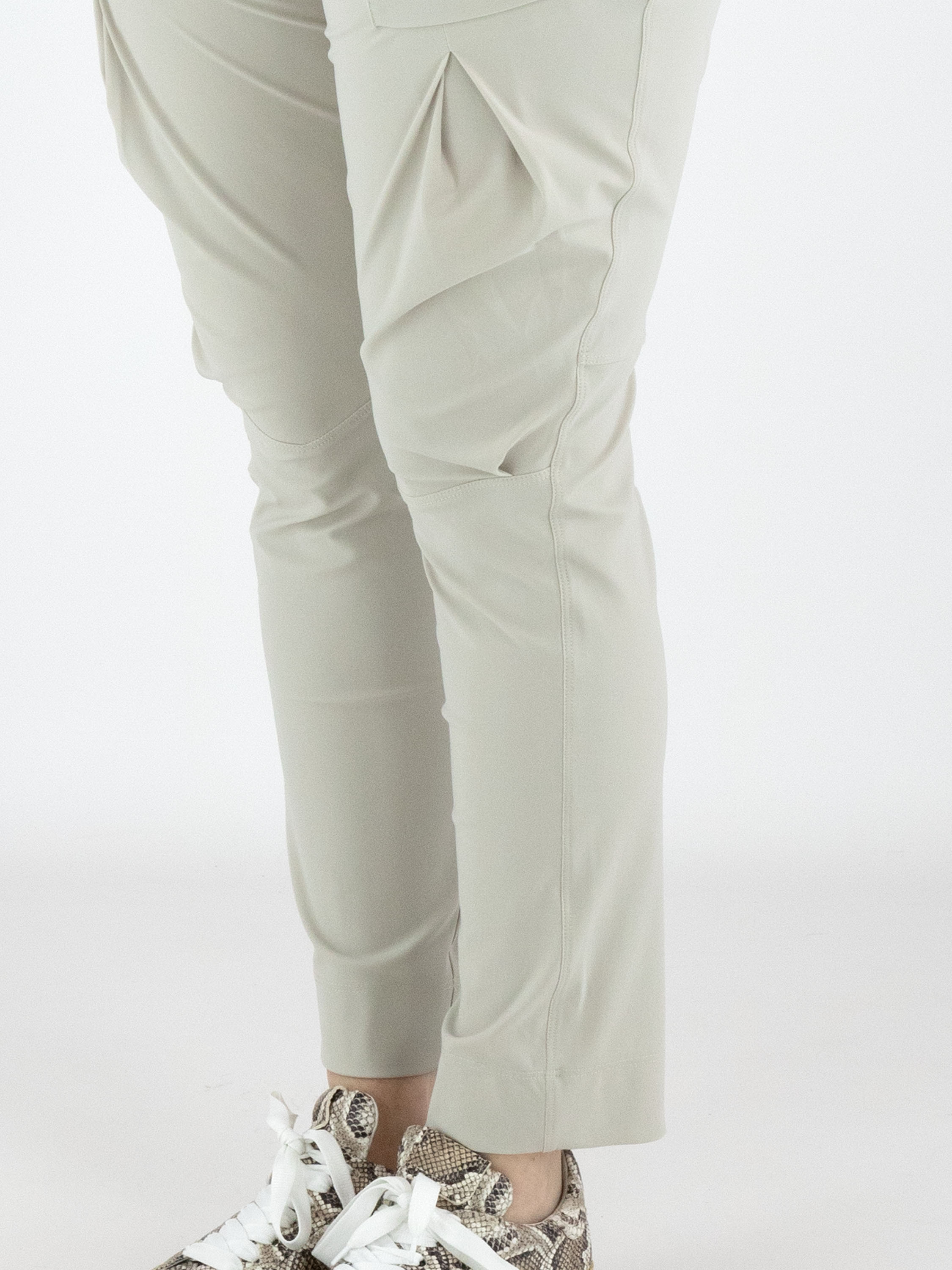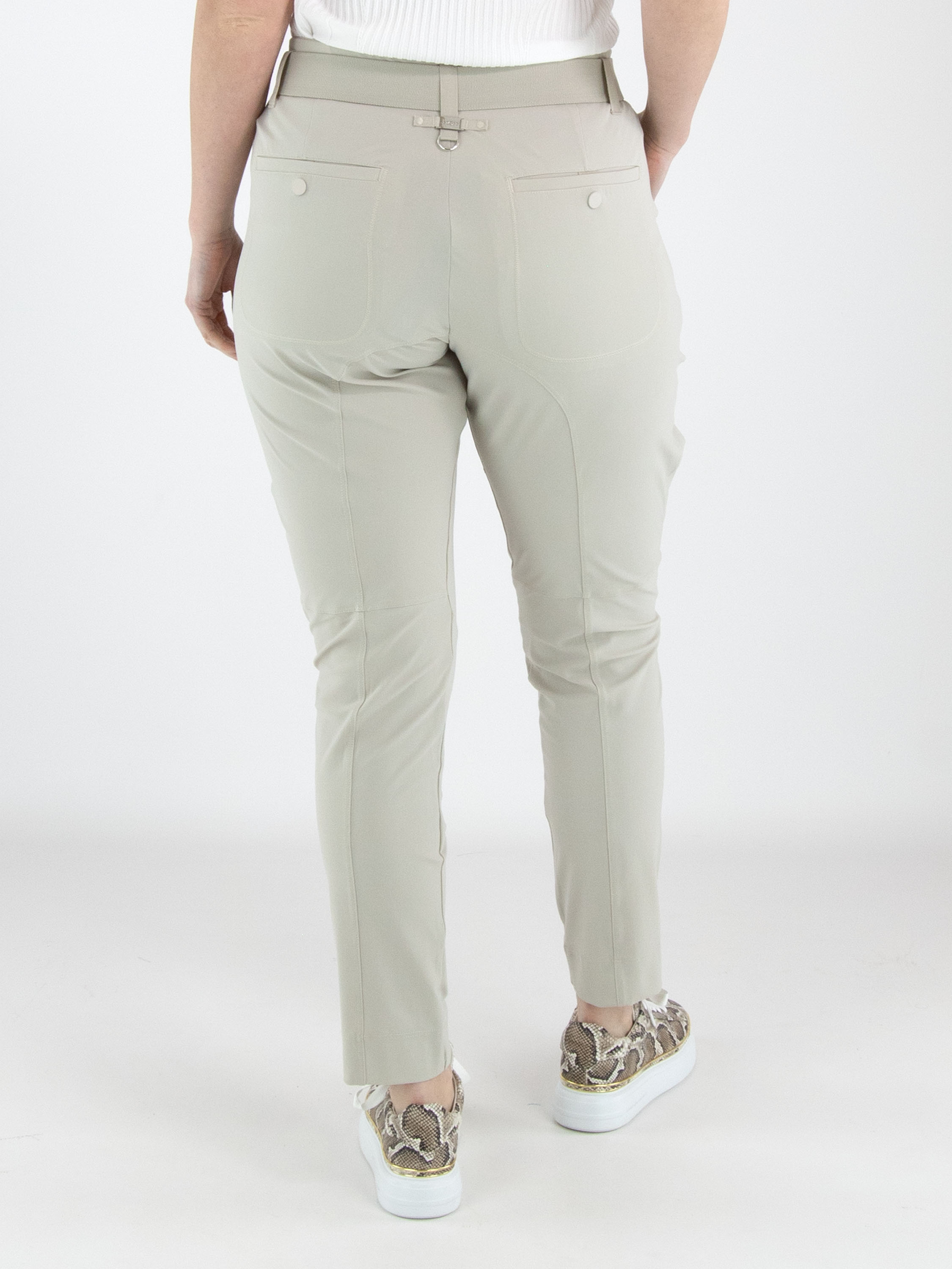 Eine Hose von High in der Farbe Kit. Der Bund ist mit einem elastischen Gürtel mit rechteckiger silberfarbener Schnalle gearbeitet, darunter befinden sich mehrere Bundfalten. Auch an der Außenseite des Oberschenkels verläuft eine Bundfalte. Die Hose verfügt über Seitentaschen und kann von Hand gewaschen werden.