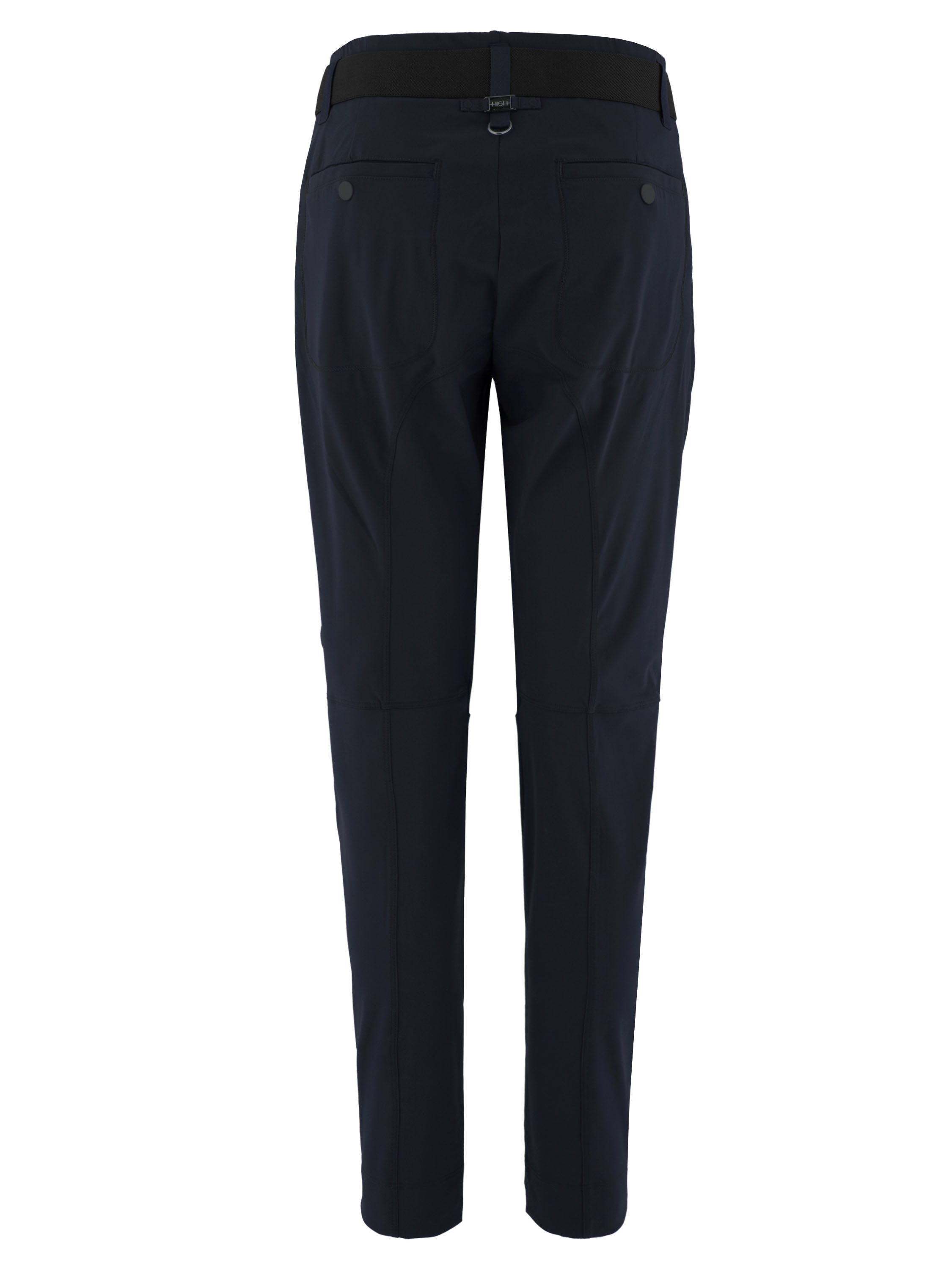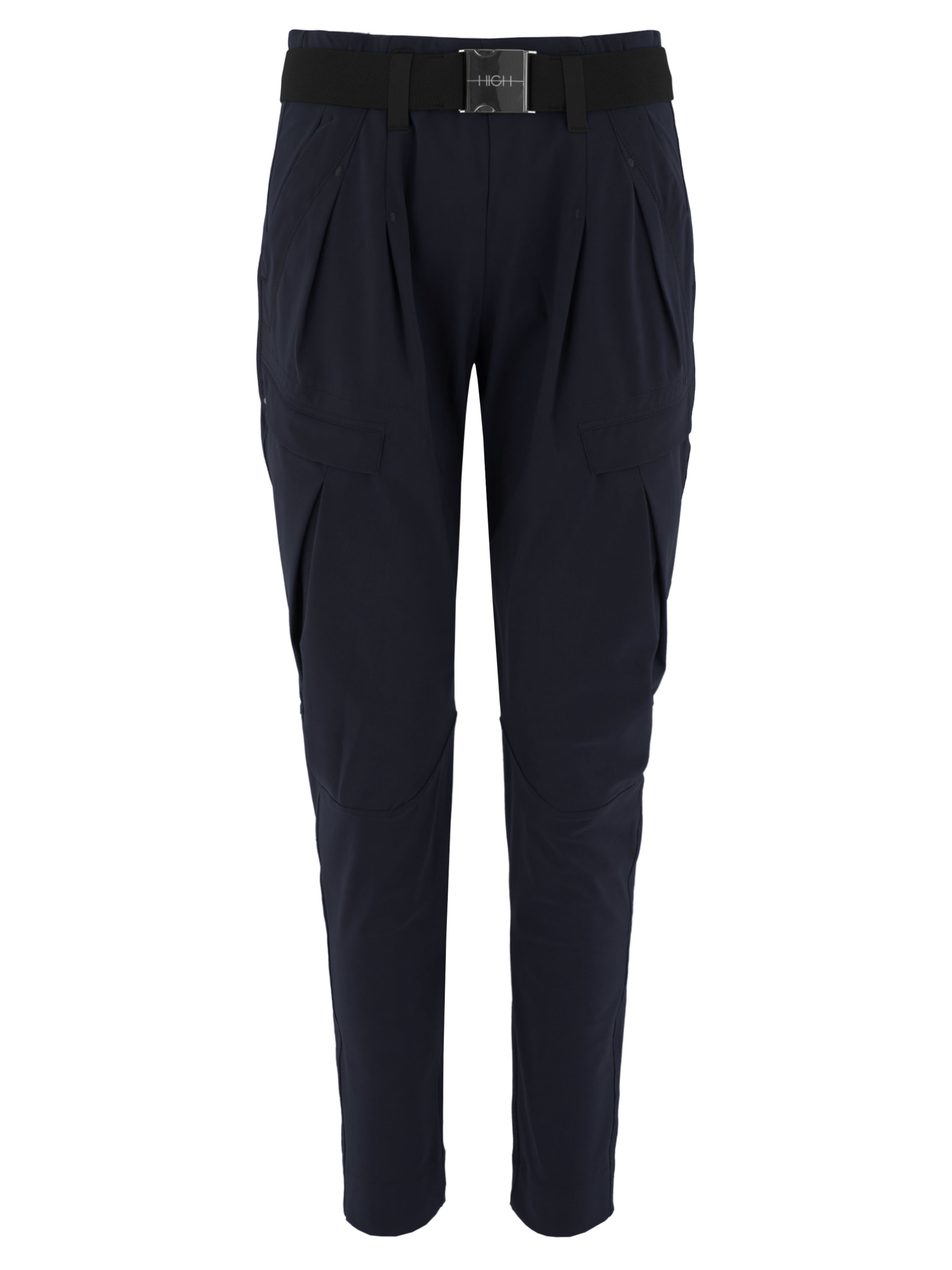 Eine Hose von High in Marineblau. Der Bund ist mit einem elastischen Gürtel mit rechteckiger silberfarbener Schnalle versehen, darunter befinden sich mehrere Bundfalten. Entlang der Außenseite des Oberschenkels verläuft eine Bundfalte. Die Hose verfügt über Seitentaschen und kann von Hand gewaschen werden.
