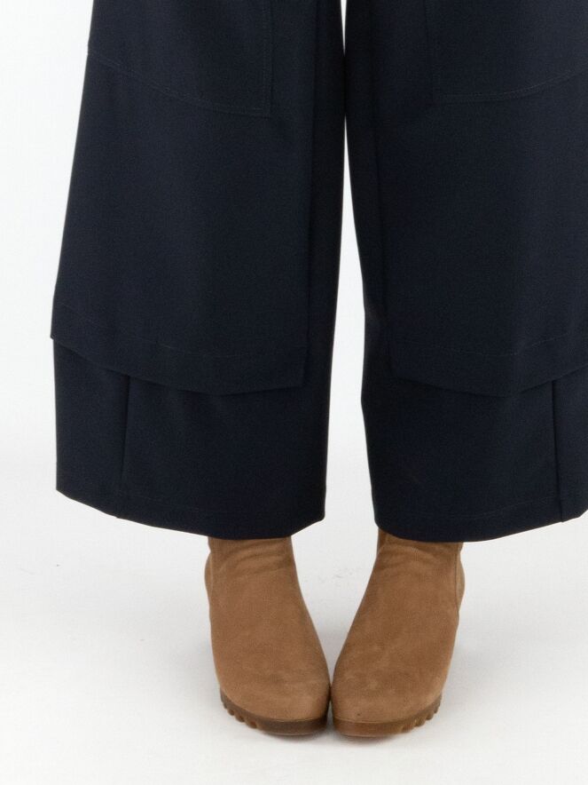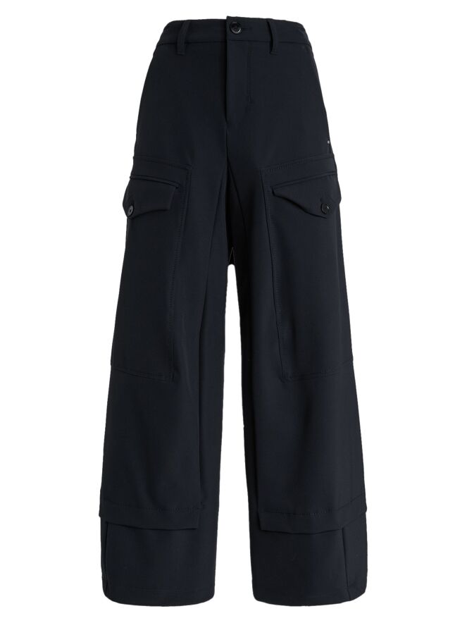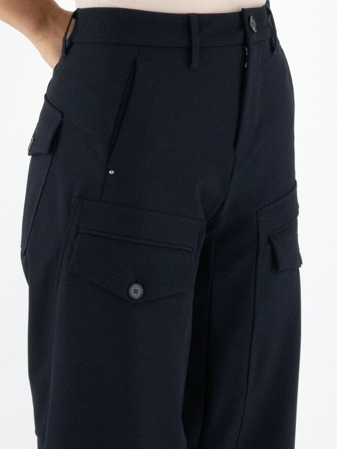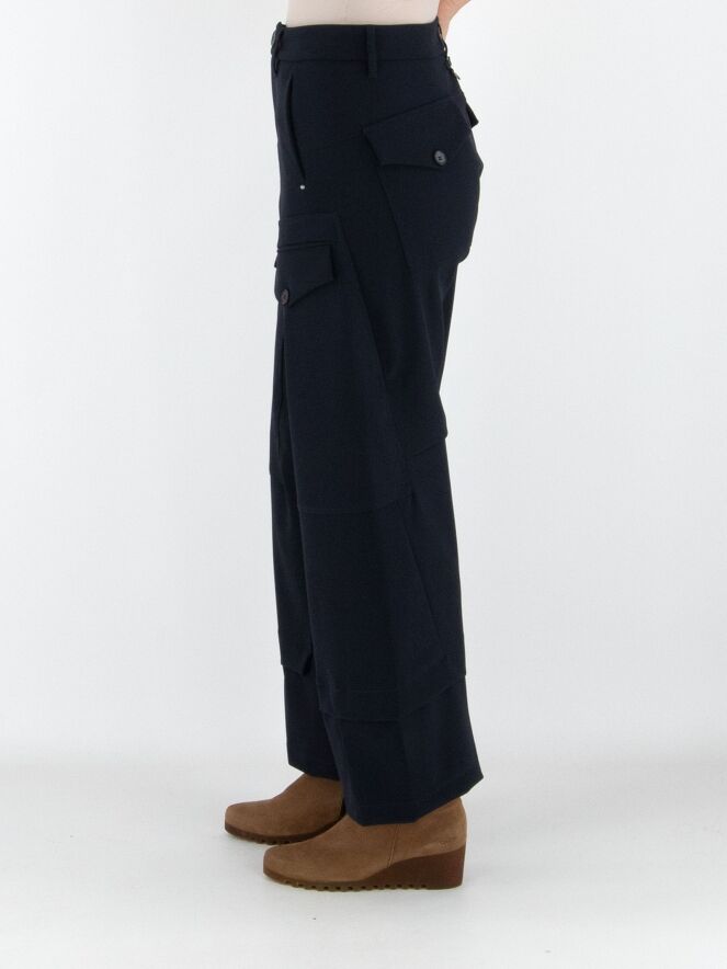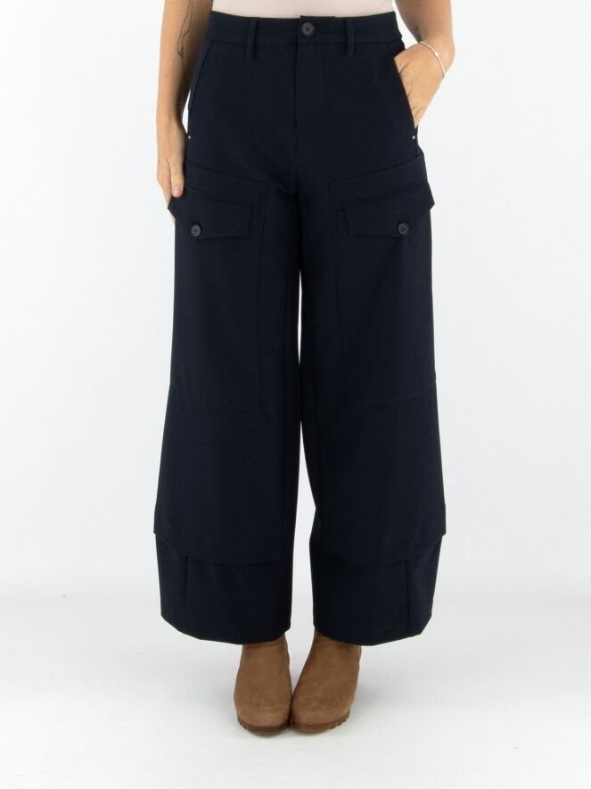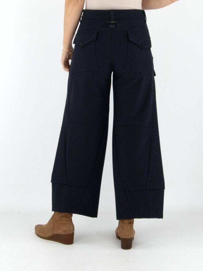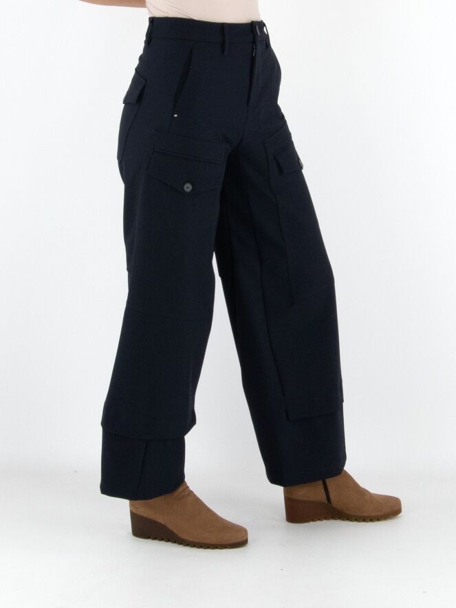Hose von High in Marineblau. Auf den Oberschenkeln befinden sich zwei Taschen mit Umschlag und Knopfverschluss, die der Hose einen sportlich-modernen Look verleihen. Unterhalb der Taille sind praktische Eingrifftaschen. Am Saum sorgt eine Überschlagblende für den Effekt einer zweiten Stofflage. Diese Hose kann bei 30 Grad gewaschen werden.