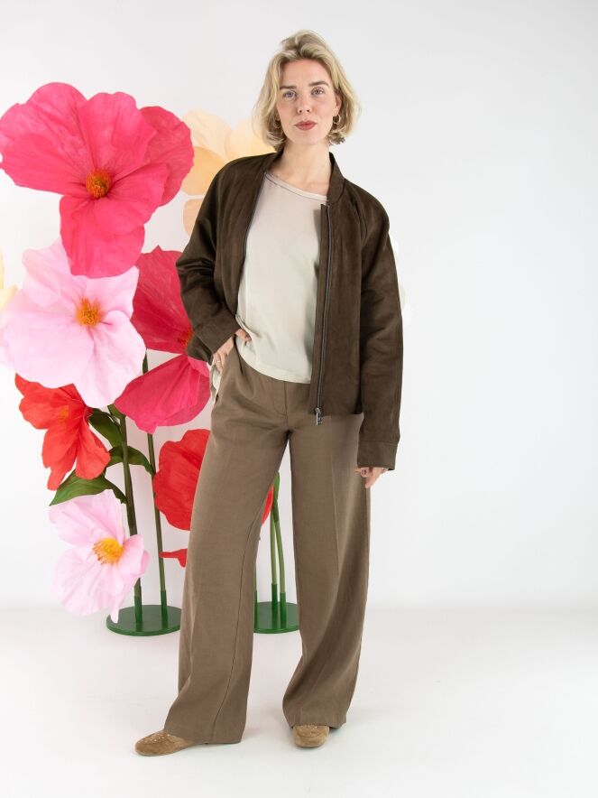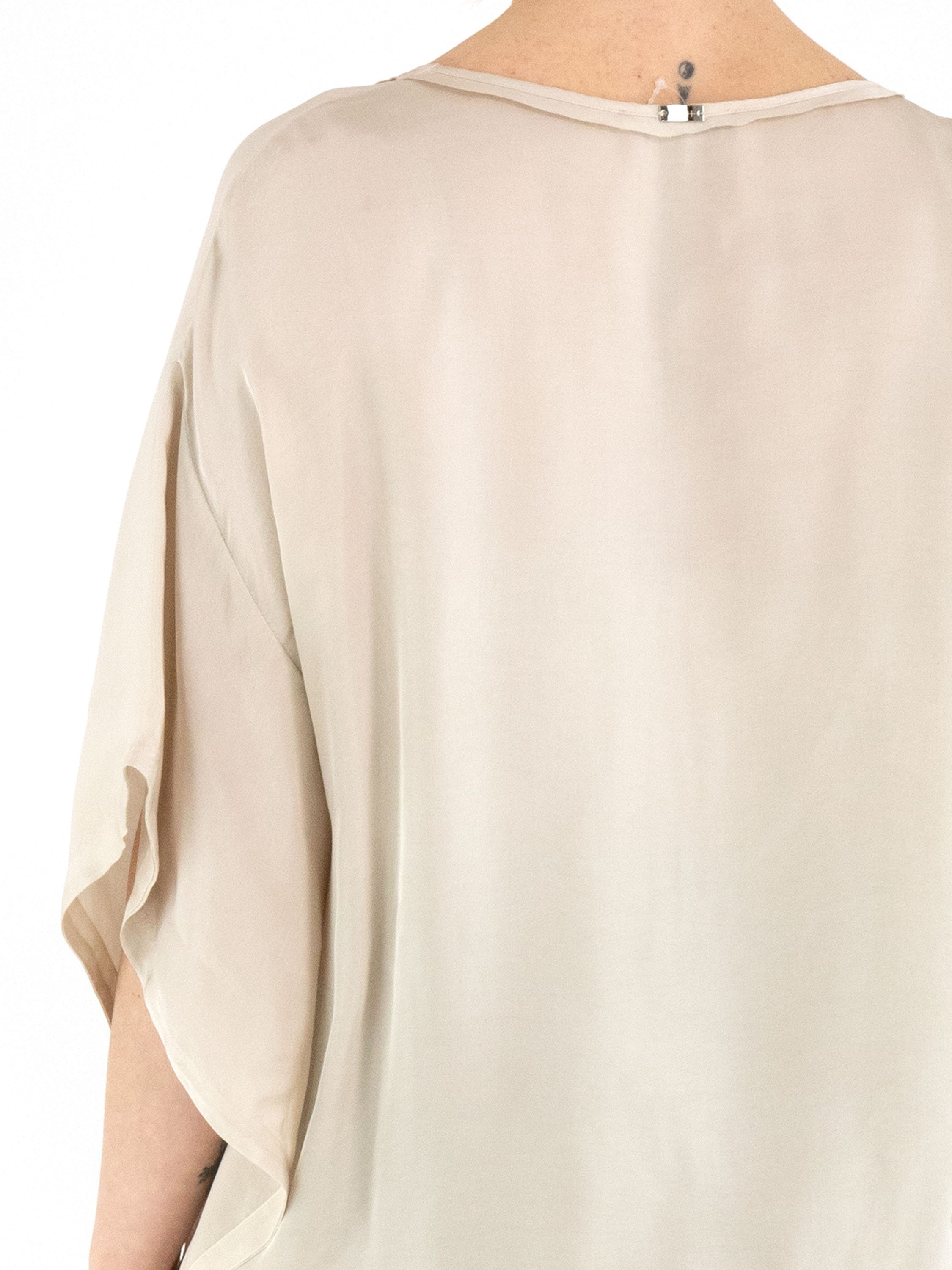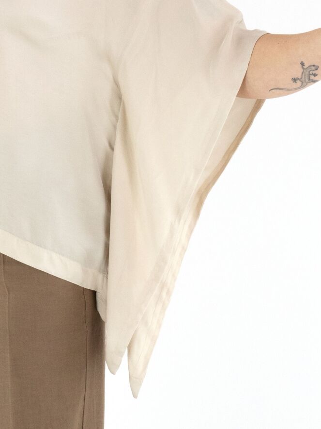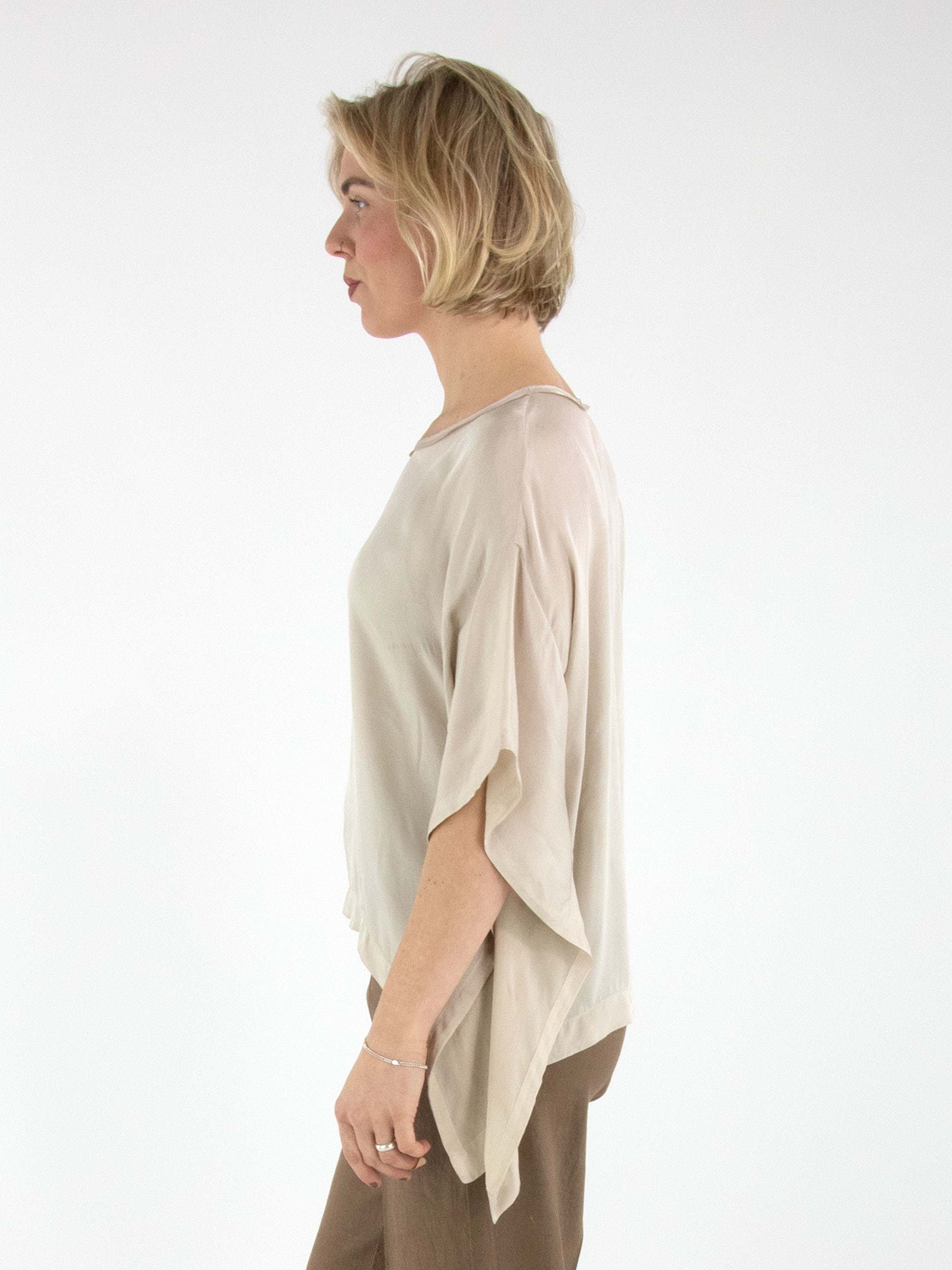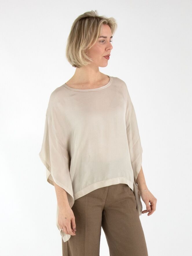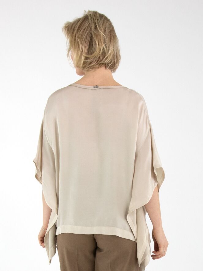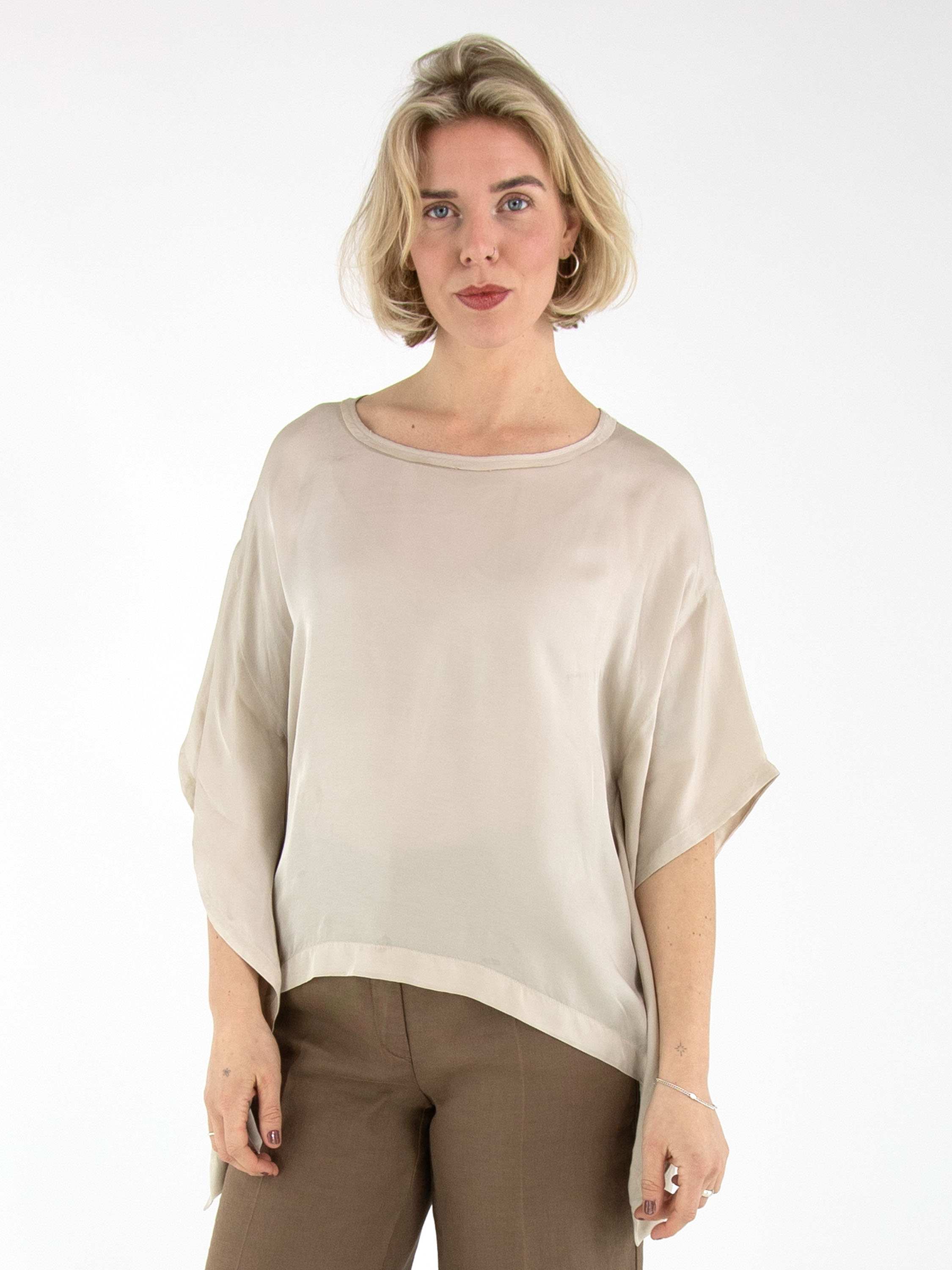 Ein mattes Satinschirt von High in Beige. Das Shirt hat einen Rundhalsausschnitt und Fledermausärmel. Dieses Shirt kann bei 30 Grad gewaschen werden.