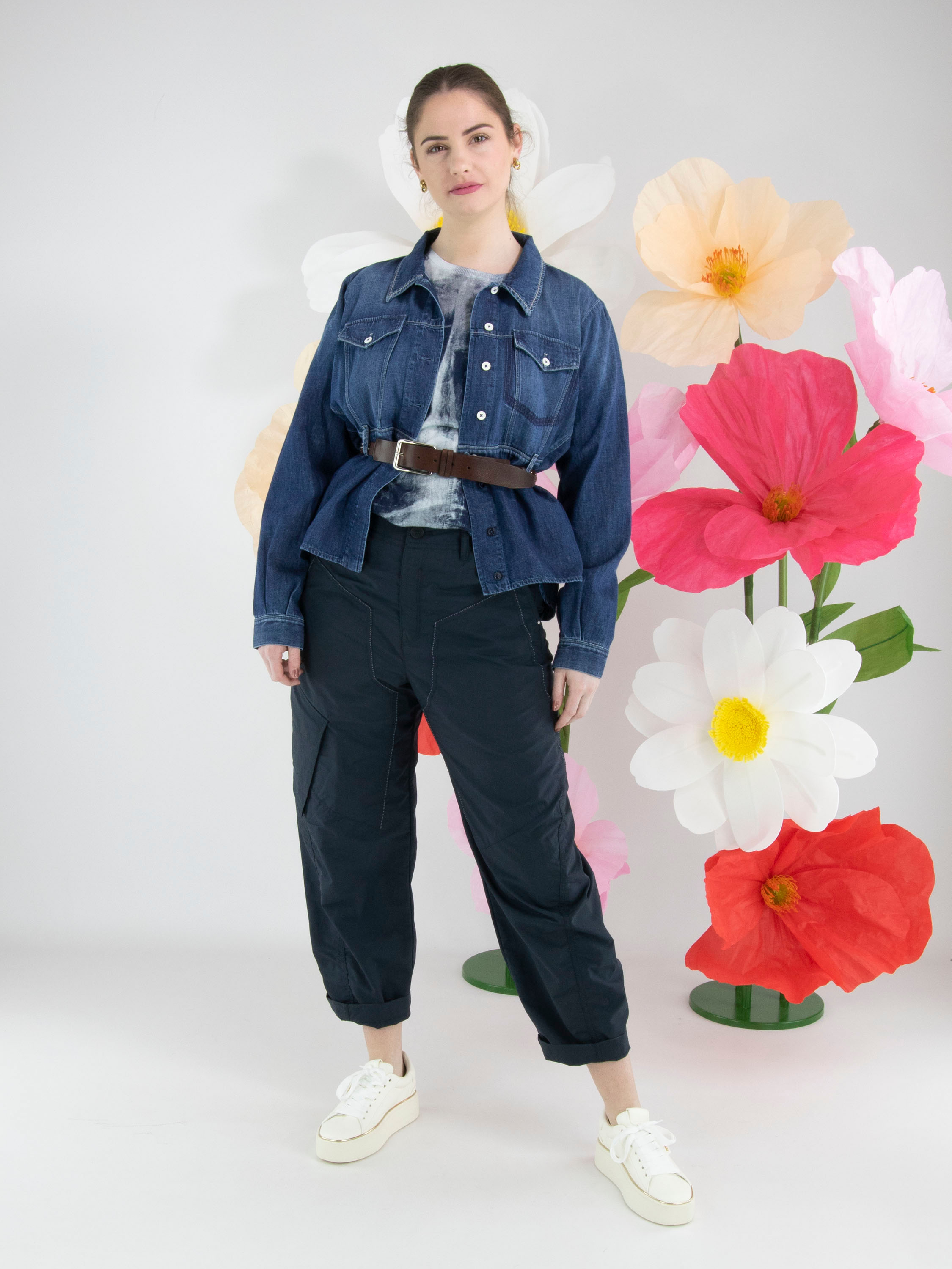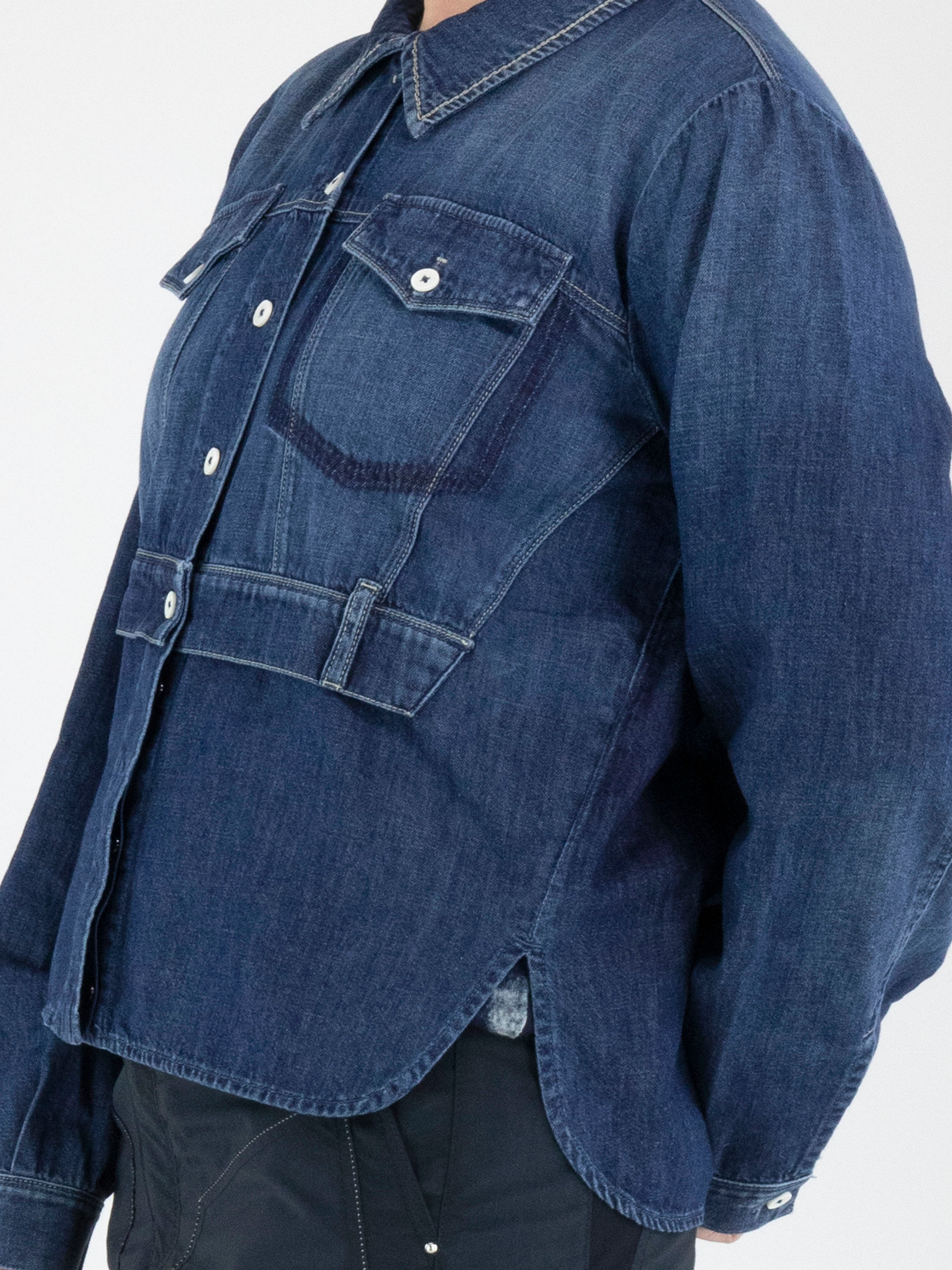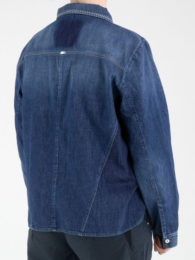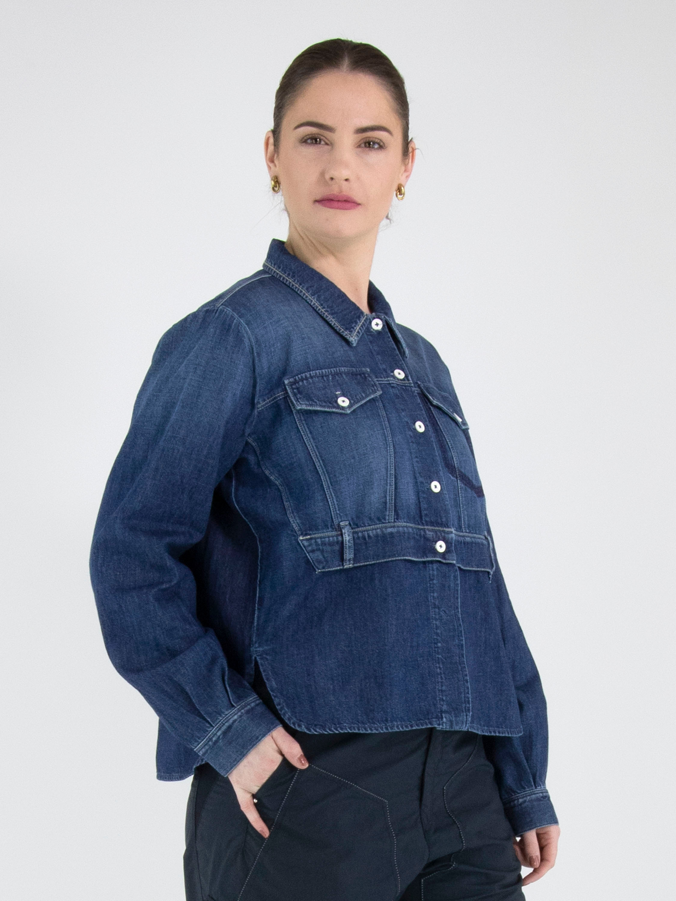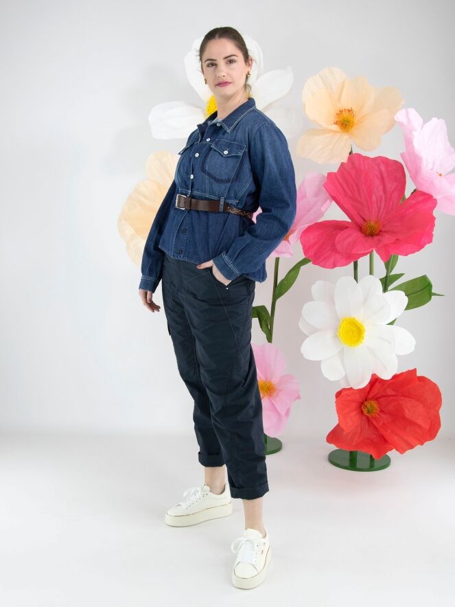 Eine Jeansbluse von High in einer klassischen Jeansfarbe. Auf der Vorderseite befinden sich zwei dekorative Brusttaschen und auf Taillenhöhe eine überlappende Stoffpartie mit Gürtelschlaufen. Am unteren Saum befindet sich an beiden Seiten ein kurzer Schlitz. Diese Bluse kann bei 30 Grad gewaschen werden.