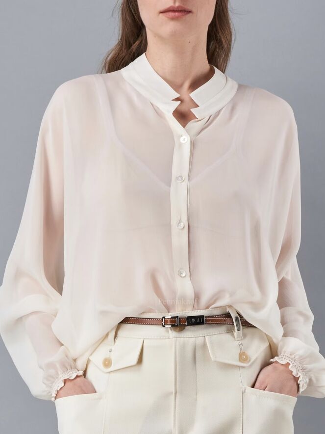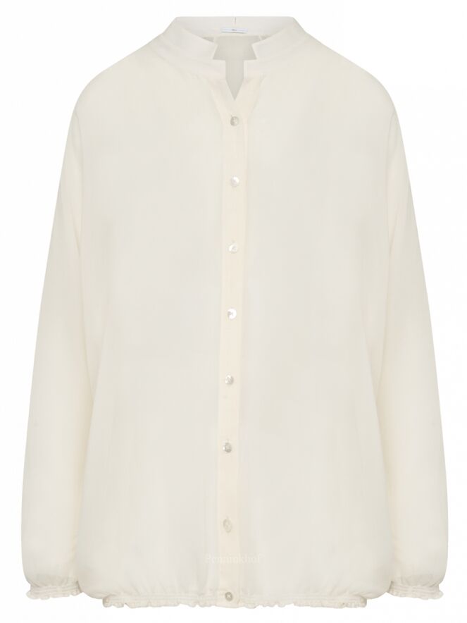 Eine edle transparente Bluse der Designermarke High in Cremeweiß. Der Abschluss der langen Ärmel und der untere Saum sind mit einem gerafften elastischen Bündchen versehen. Diese Bluse darf nicht gewaschen werden.