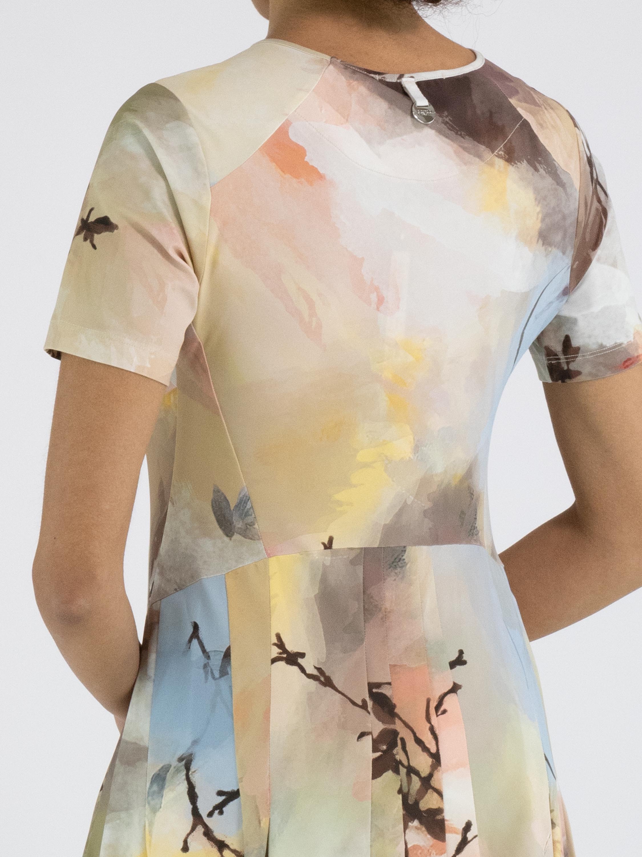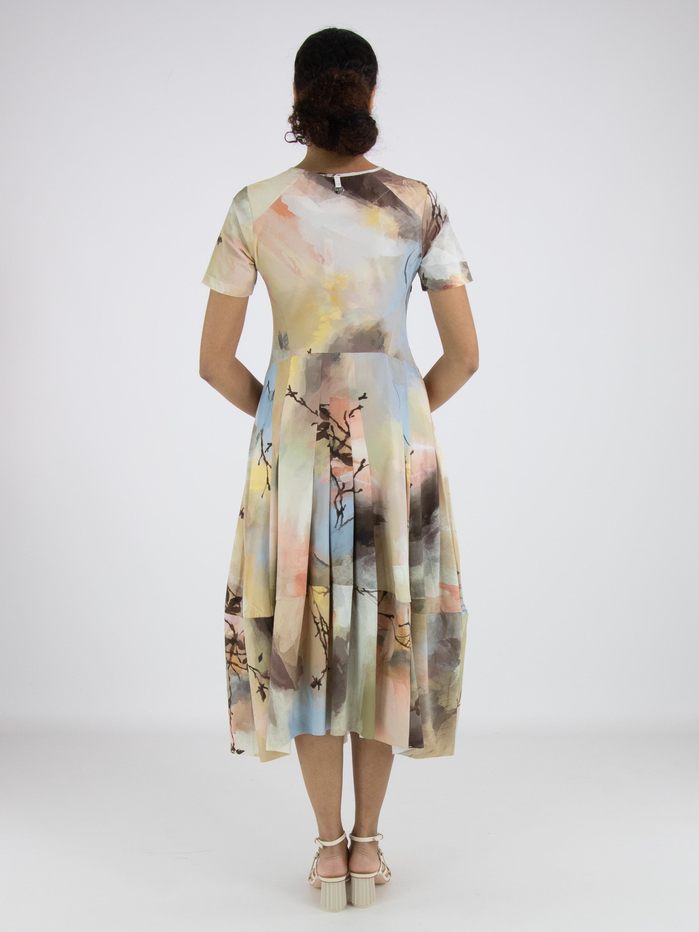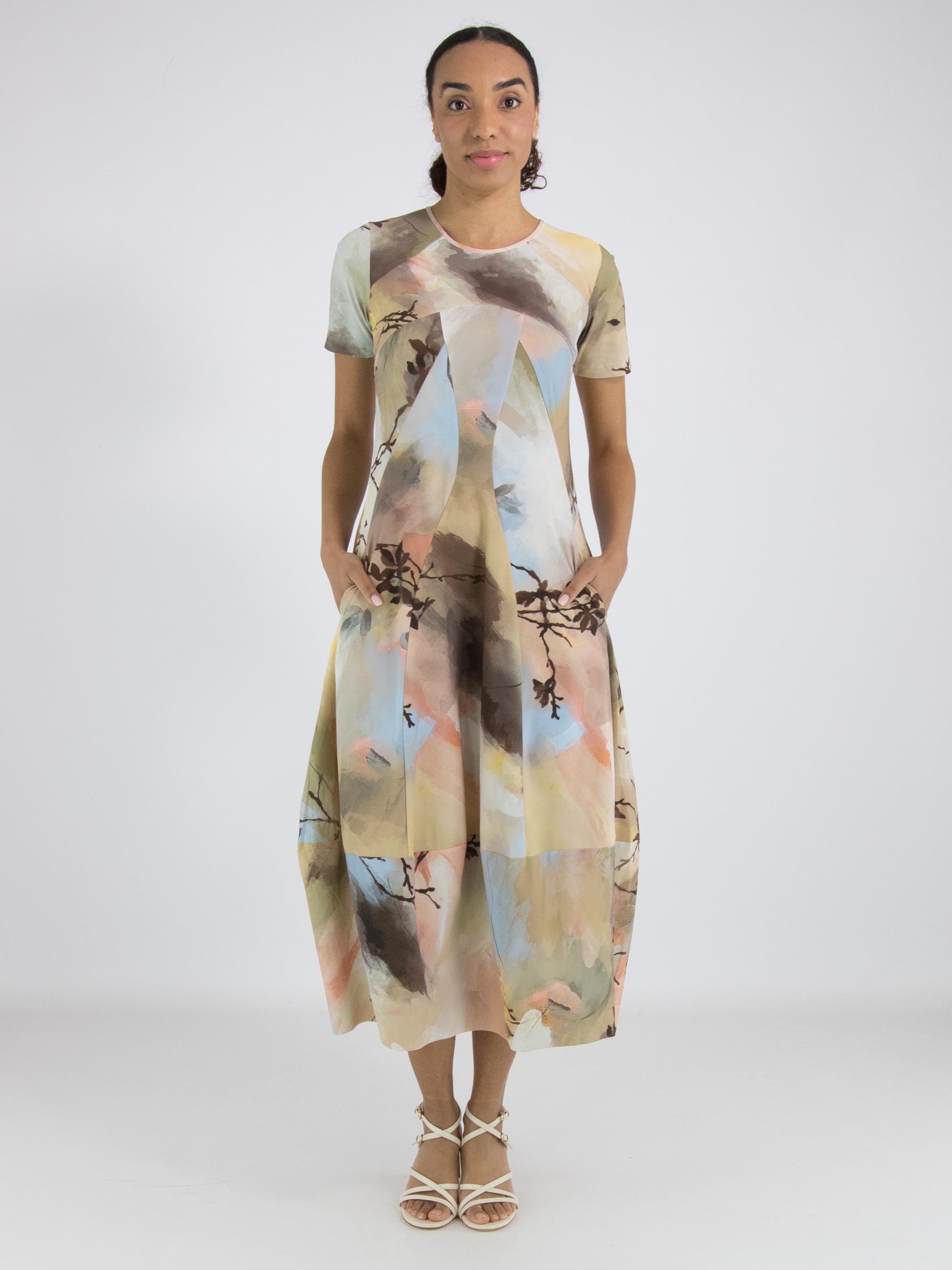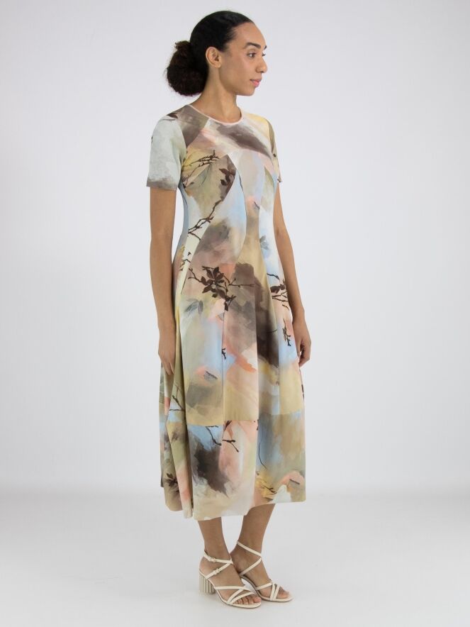 Ein Kleid von High Tech mit einem grafischen Multicolor-Aquarelldruck in den Hauptfarben Taupe, Pastellblau und Lachs in mehreren Nuancen. Das Kleid hat einen Rundhalsausschnitt und kurze Ärmel. Auf Taillenhöhe befinden sich Eingrifftaschen. Ab der Taille hat das Kleid eine Ballonform. Dieses Kleid kann bei 30 Grad gewaschen werden.