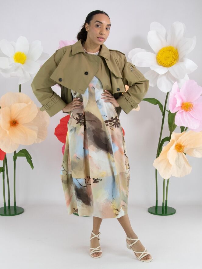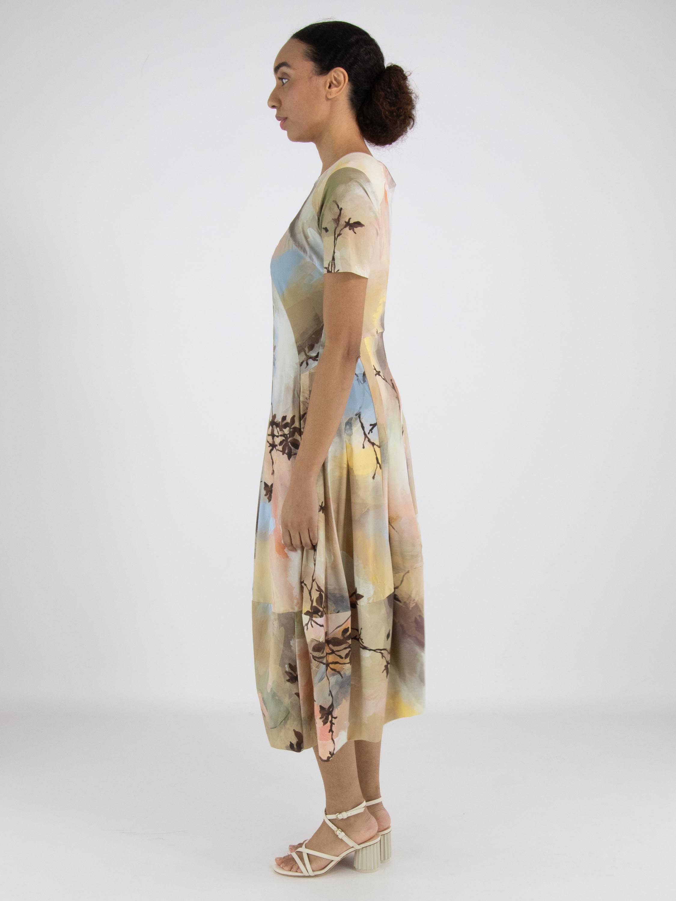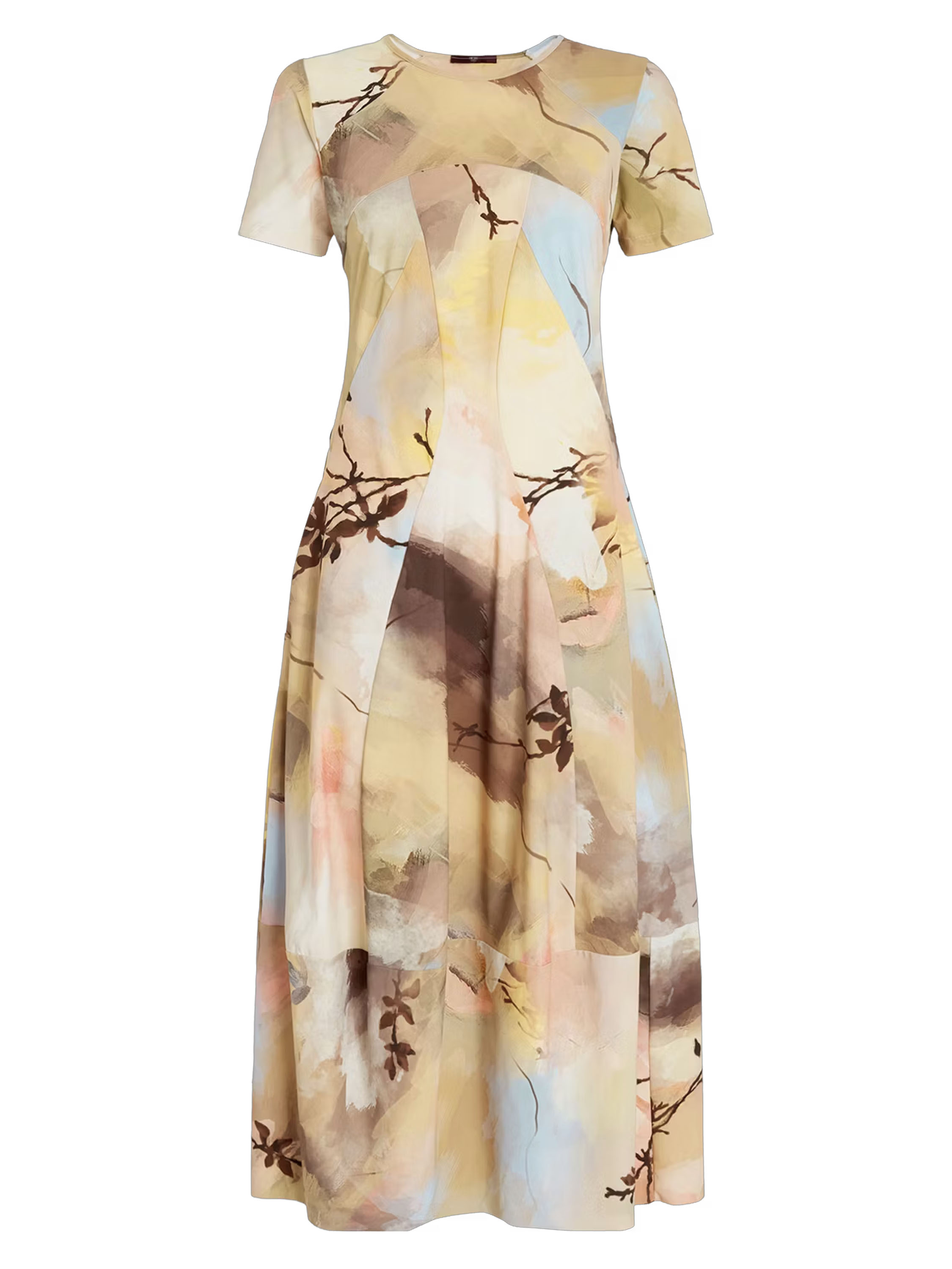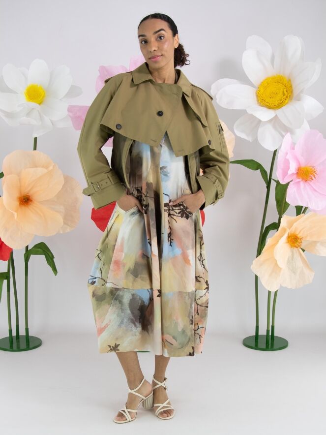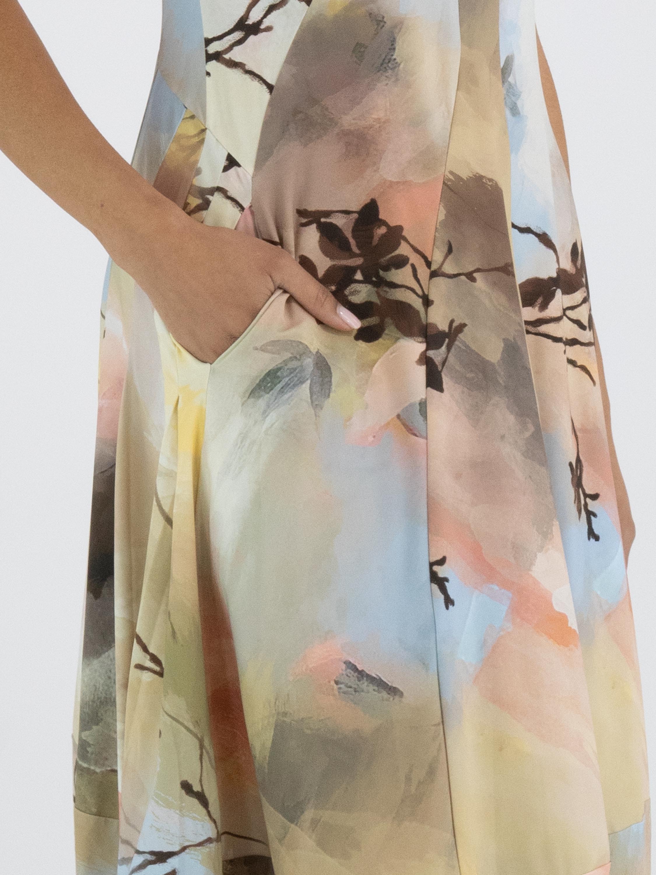 Ein Kleid von High Tech mit einem grafischen Multicolor-Aquarelldruck in den Hauptfarben Taupe, Pastellblau und Lachs in mehreren Nuancen. Das Kleid hat einen Rundhalsausschnitt und kurze Ärmel. Auf Taillenhöhe befinden sich Eingrifftaschen. Ab der Taille hat das Kleid eine Ballonform. Dieses Kleid kann bei 30 Grad gewaschen werden.