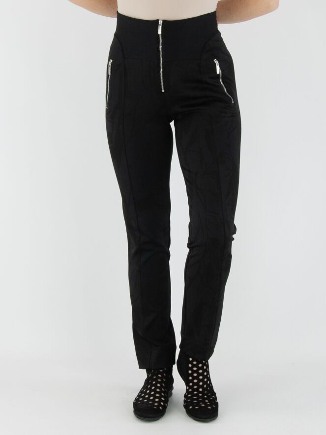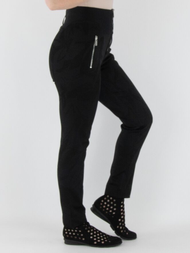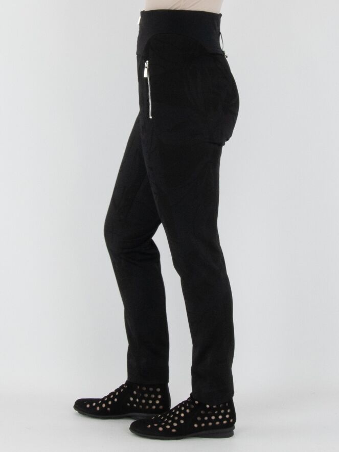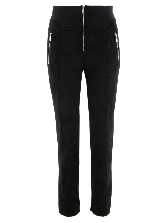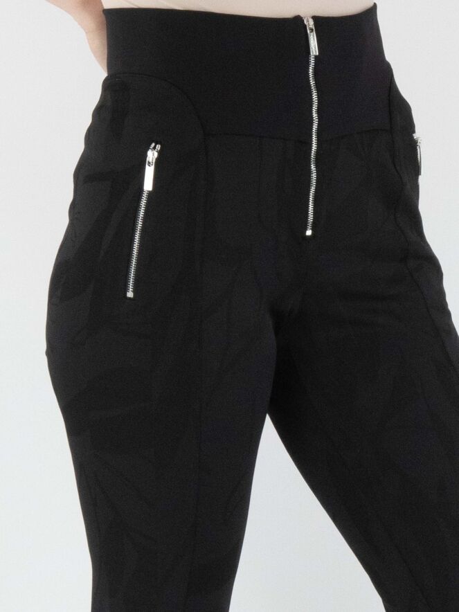 Eine hoch geschnittene Hose von High in Schwarz mit einem grafischen Blattmuster in den Stoff eingearbeitet. Der Bund hat ein breites, fein geripptes Strickbündchen mit einem Reißverschluss in der Mitte. Diese Hose sollte per Hand gewaschen werden.
