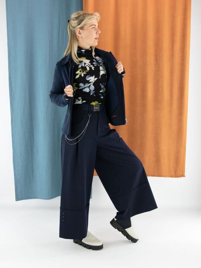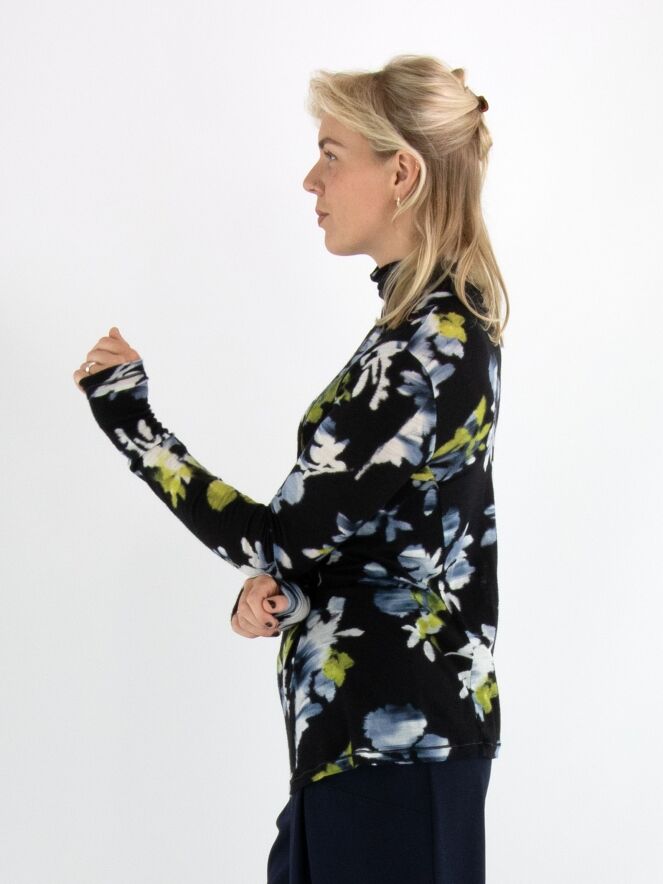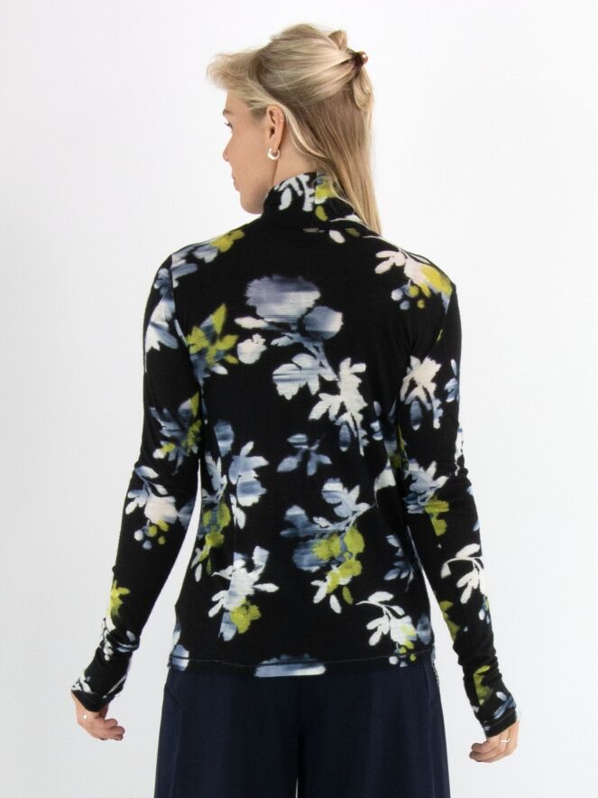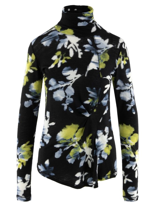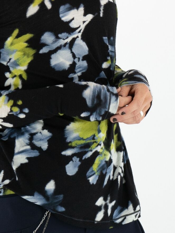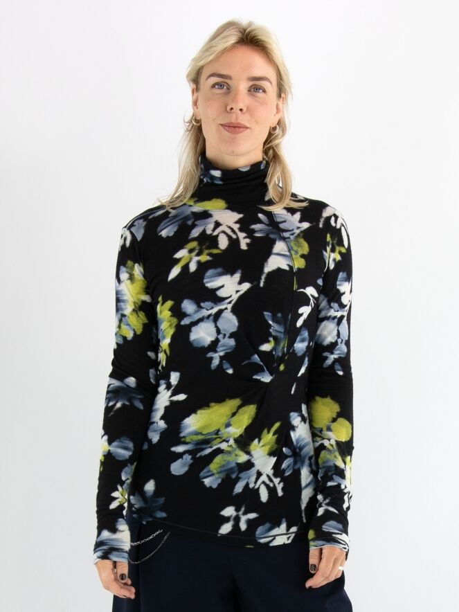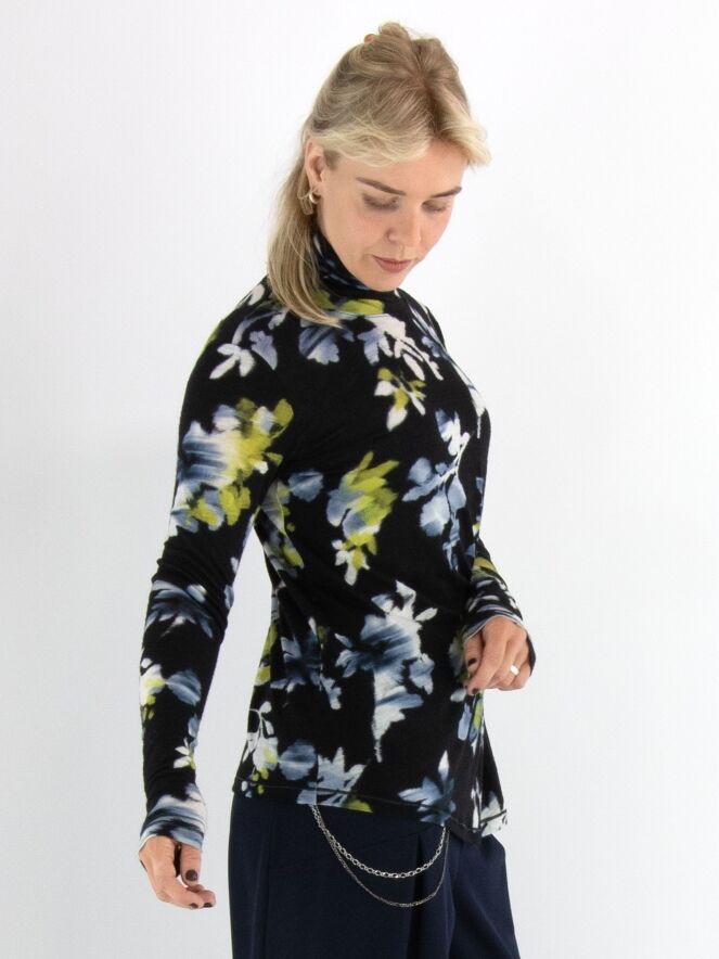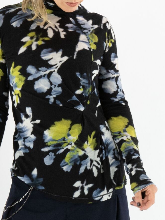 Ein Shirt von High mit einem grafischen Blumenmuster in Gelb, Weiß und Hellblau auf marineblauem Hintergrund. Das Shirt hat einen fallenden Rollkragen und lange Ärmel. Dieses Shirt sollte von Hand gewaschen werden.