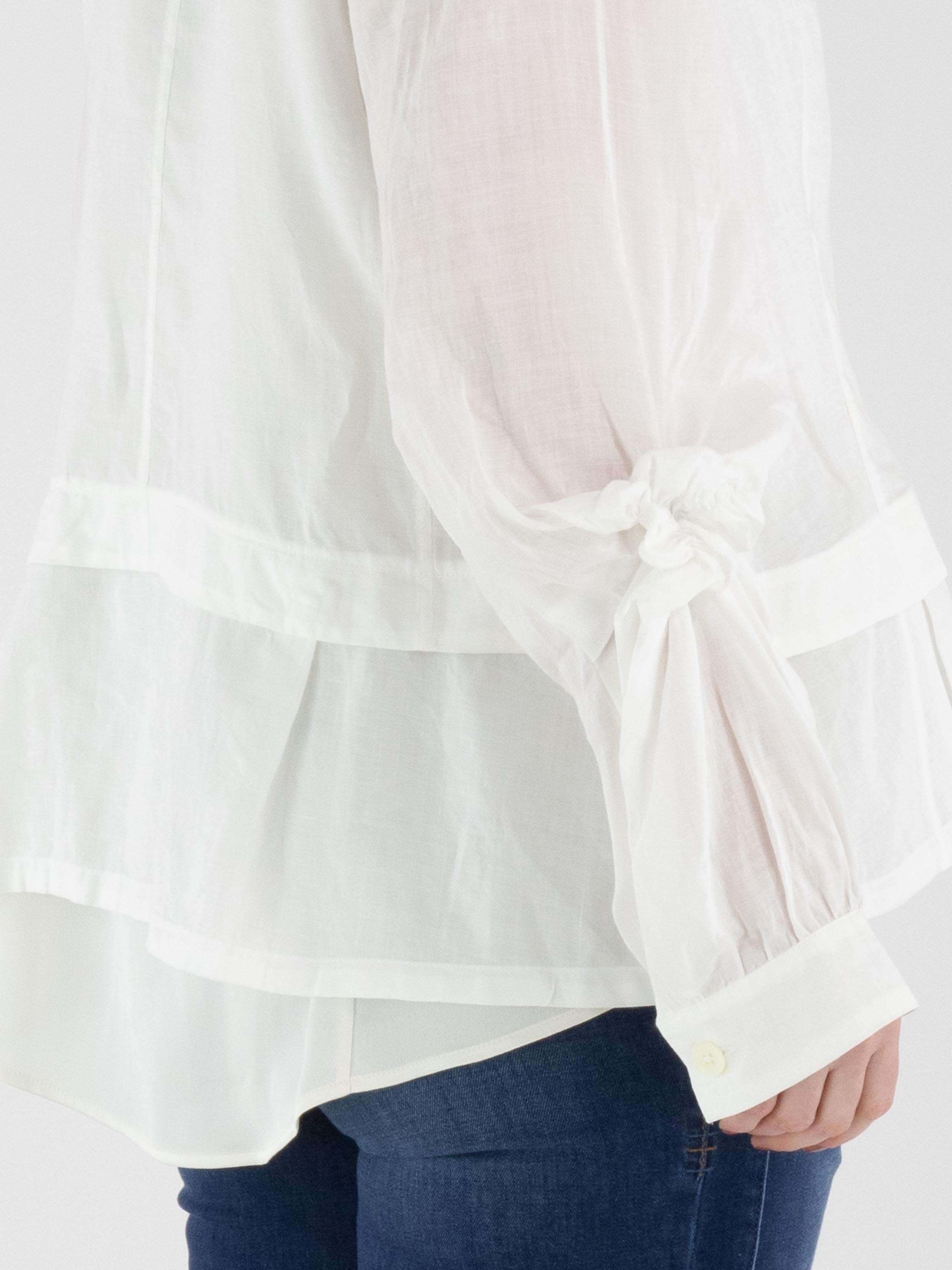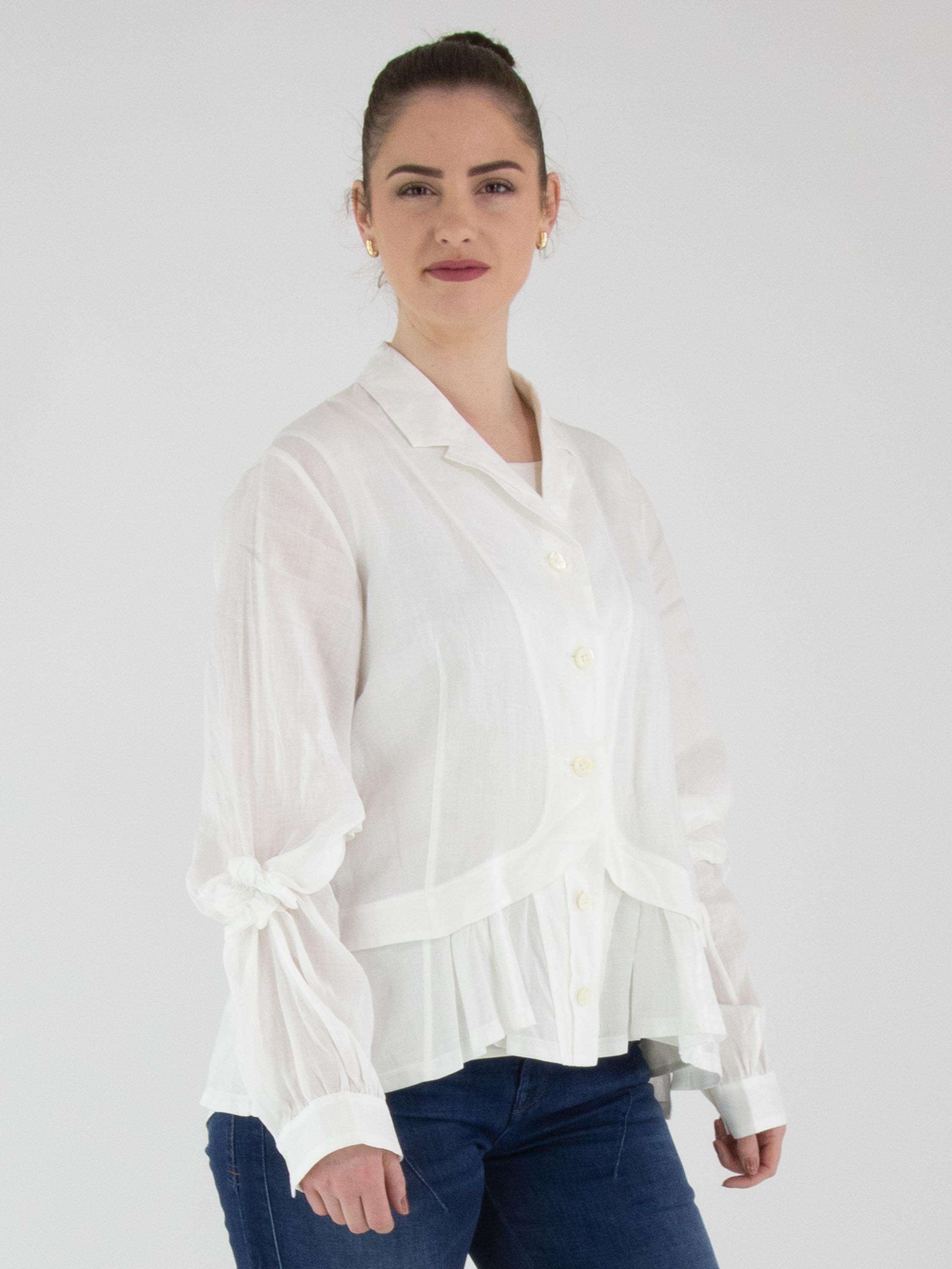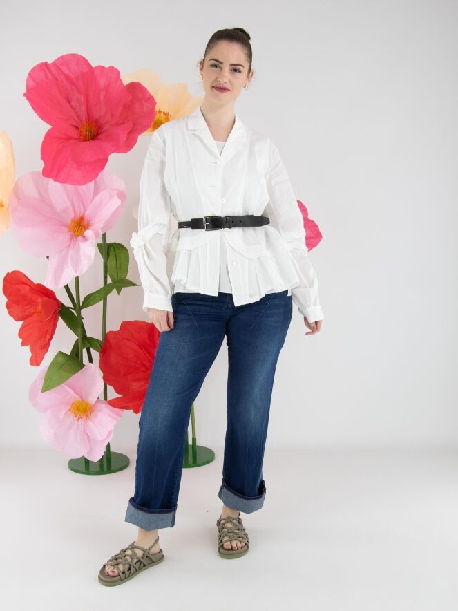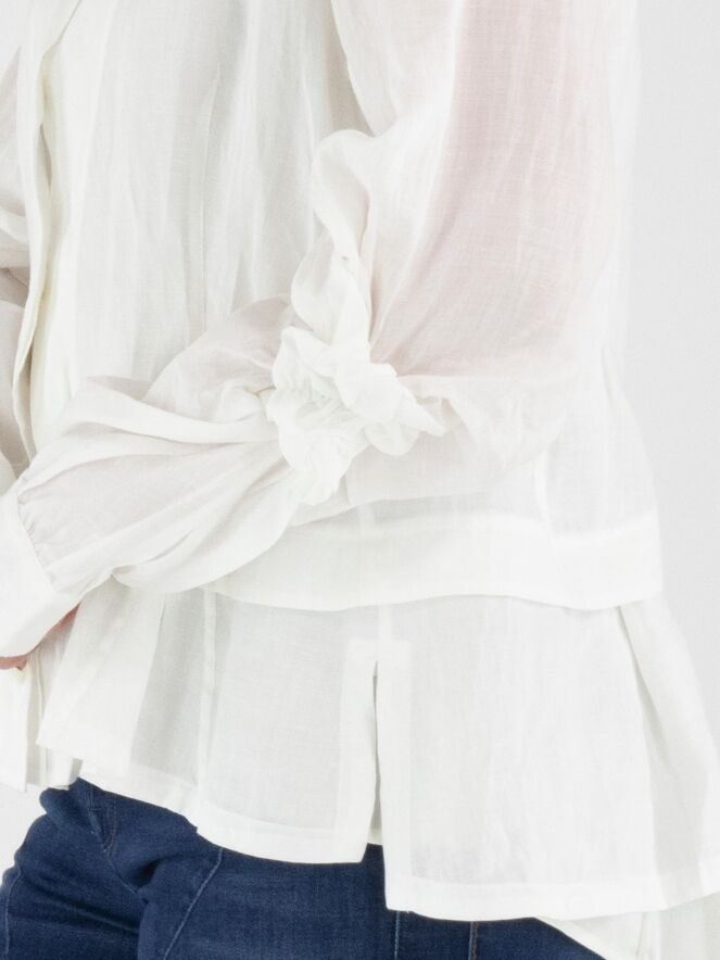 Eine Bluse von High in Weiß. In den Kragen ist eine kurze Plissierung eingearbeitet. Am Saum verläuft eine rund geschnittene Naht zu den Seiten, unter der ein zweiter Stoff mit mehreren Falten verarbeitet ist. Auf der Rückseite ist dieser zweite Stoff glatt gehalten. Die langen Ärmel sind auf Ellbogenhöhe mit einer plissierten Ziernaht in Blumenform versehen. Diese Bluse kann von Hand gewaschen werden.