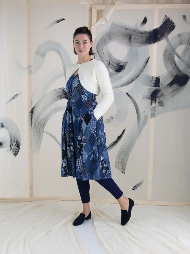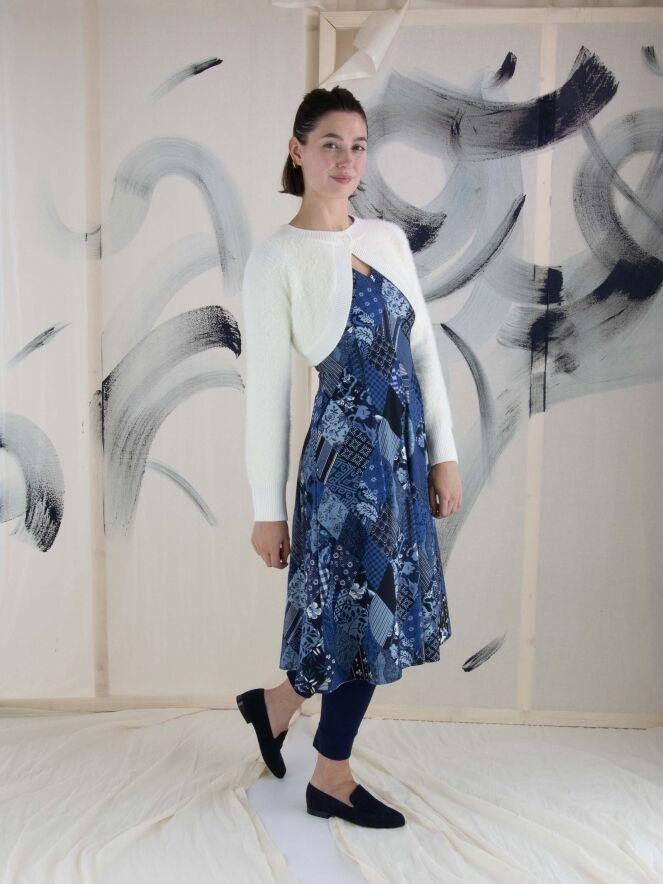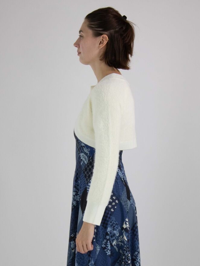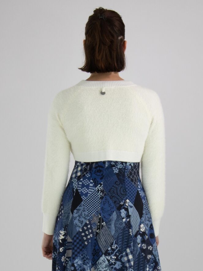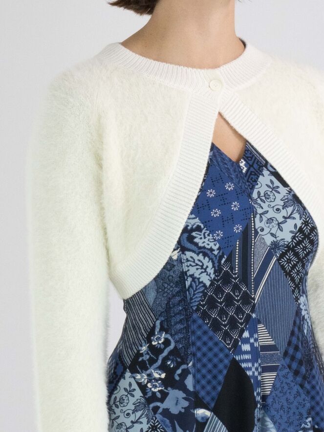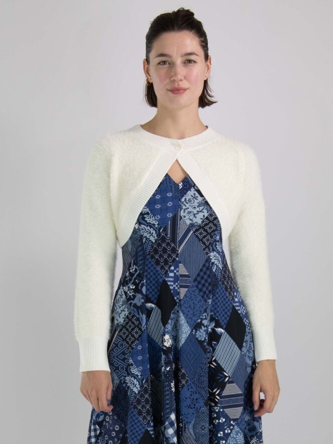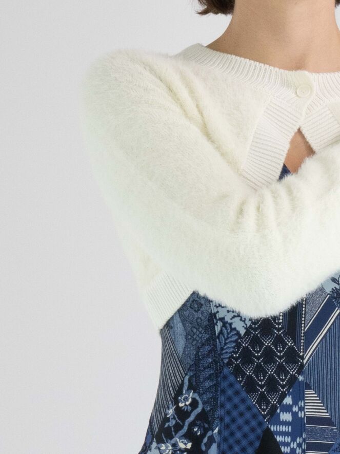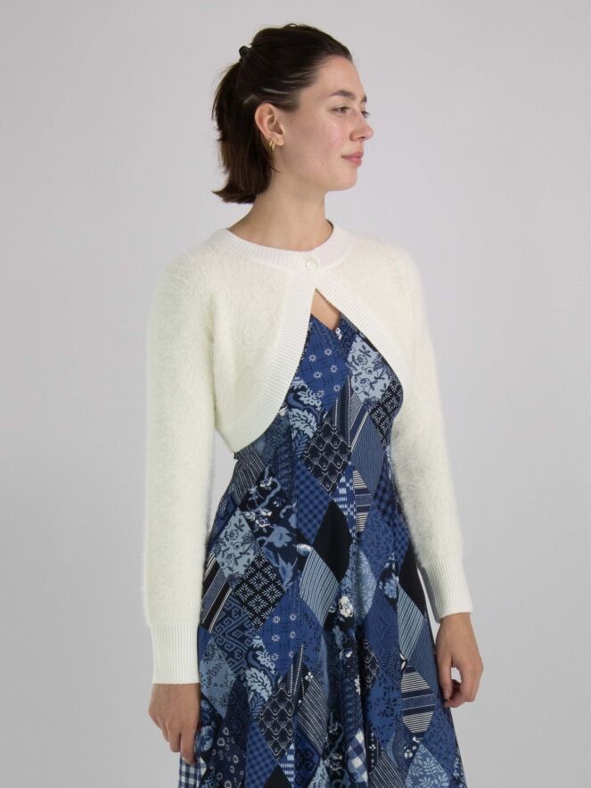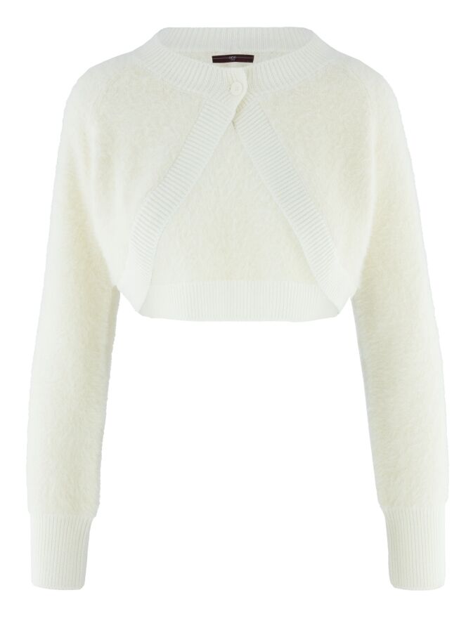 Ein Bolero-Cardigan von High in Cremeweiß. Der Bolero hat eine Mohair-Optik und entlang der Kanten einen fein gerippten Strickbund. Dieser Bolero kann von Hand gewaschen werden.