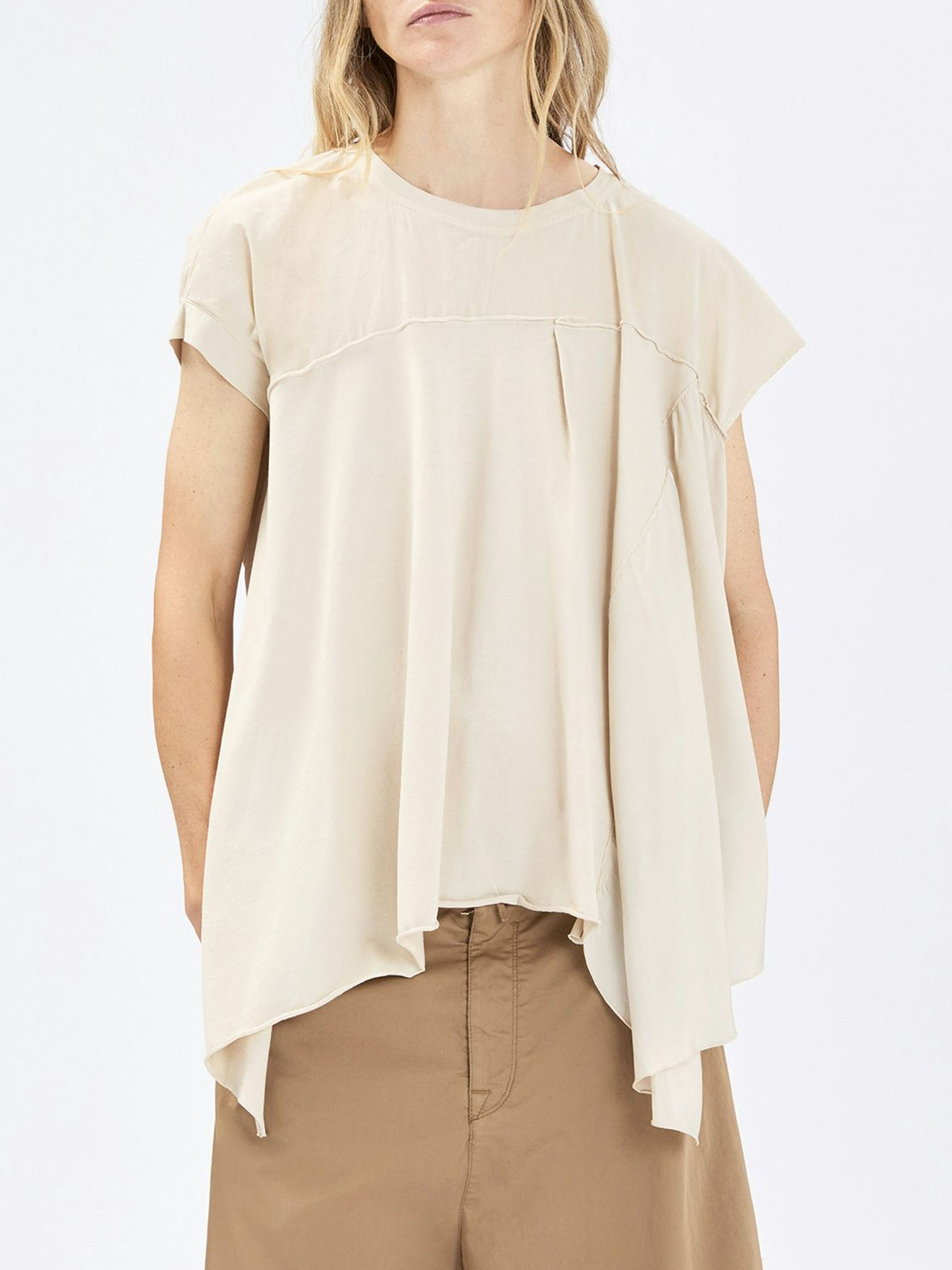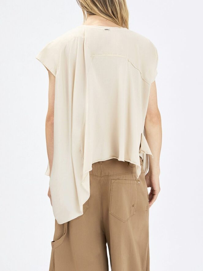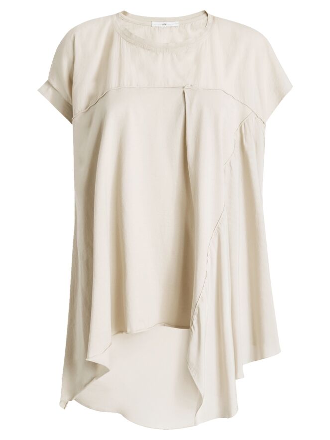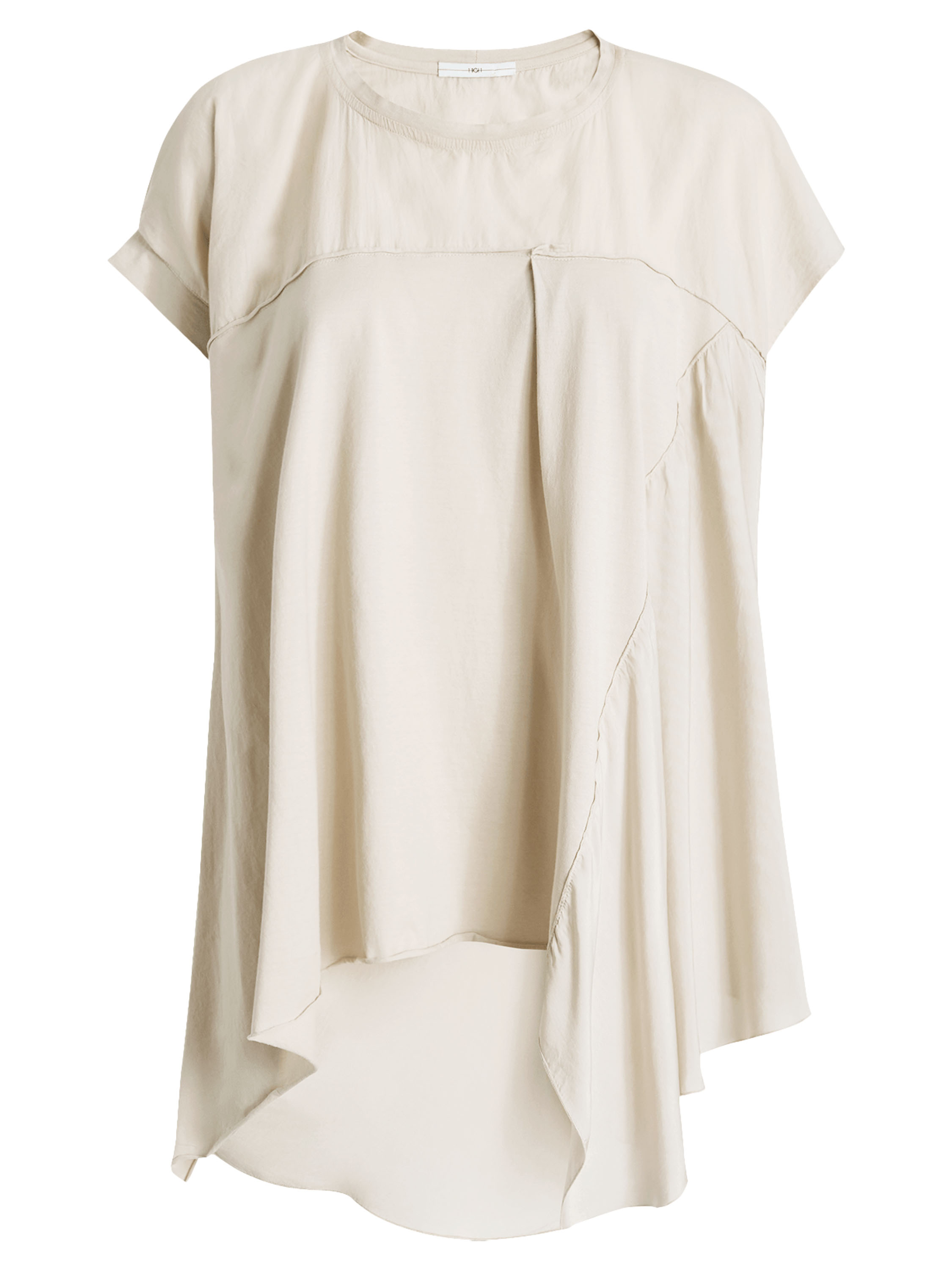 Top von High in einem edlen Sandton. Eine dezente Naht oberhalb der Brust verleiht dem Design Struktur. Die linke Vorder- und Rückseite sind aus mattem Satin gefertigt und setzen einen stilvollen Materialkontrast. In A-Linie geschnitten, fallen die Seiten länger als die Mittelpartie und erzeugen so eine fließende, moderne Silhouette. Dieses exklusive Designertop sollte per Hand gewaschen werden.