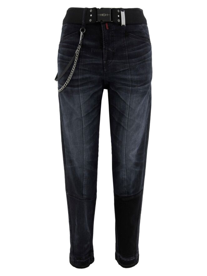 Gewaschene Jeans von High in Schwarz. An der Taille befindet sich ein elastischer Gürtel mit einer quadratischen, nickelfarbenen Schnalle. Von der rechten Gürtelschlaufe geht eine Kette aus, die nach hinten verläuft. Diese Jeans kann bei 30 Grad gewaschen werden.
