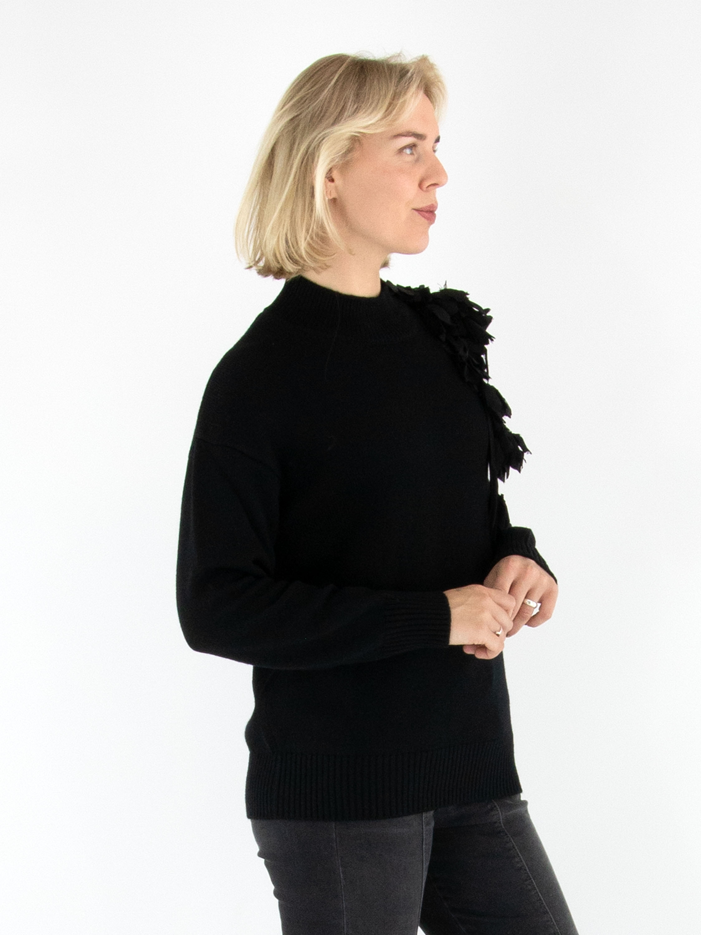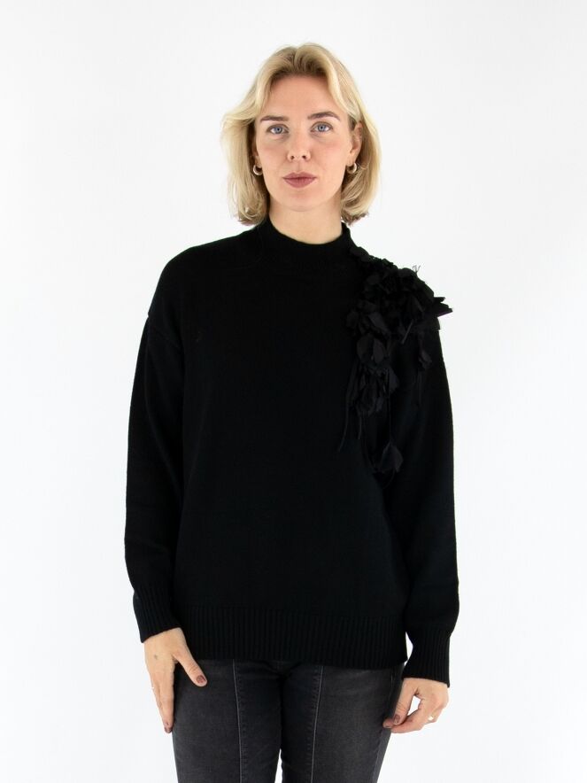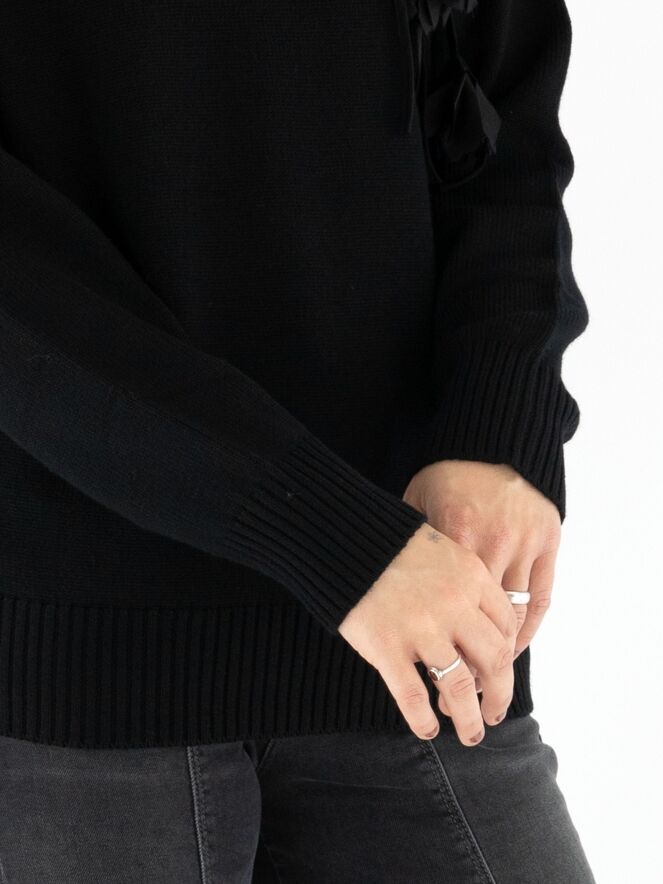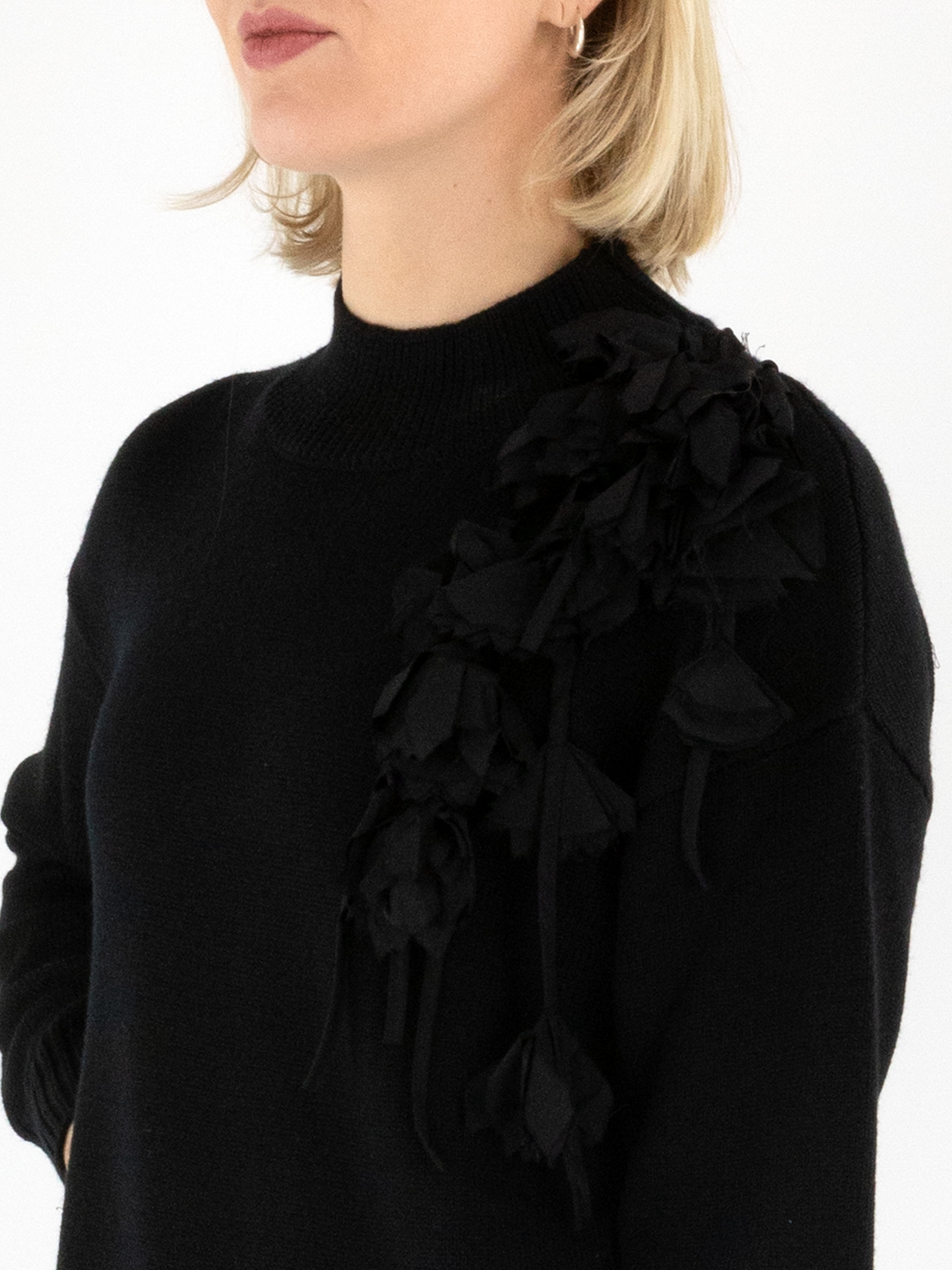 Ein luxuriöser Pullover von High in Schwarz. Der Pullover hat einen hohen Rundhalsausschnitt und lange Ärmel. Von der linken Schulter fallen fünf Bänder in unterschiedlichen Längen, die mit Blumen aus matter Satinqualität verziert sind. Dieses besondere Detail verleiht dem Modell eine künstlerische und elegante Note. Dieser Pullover darf nicht gewaschen werden.