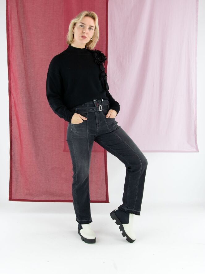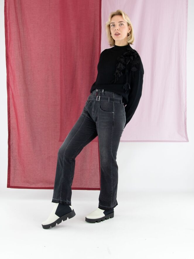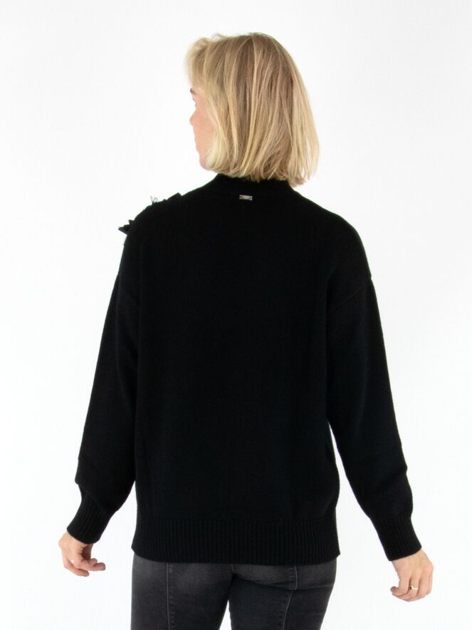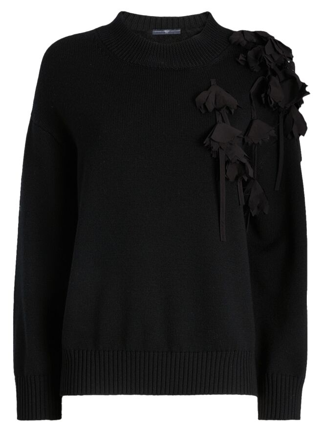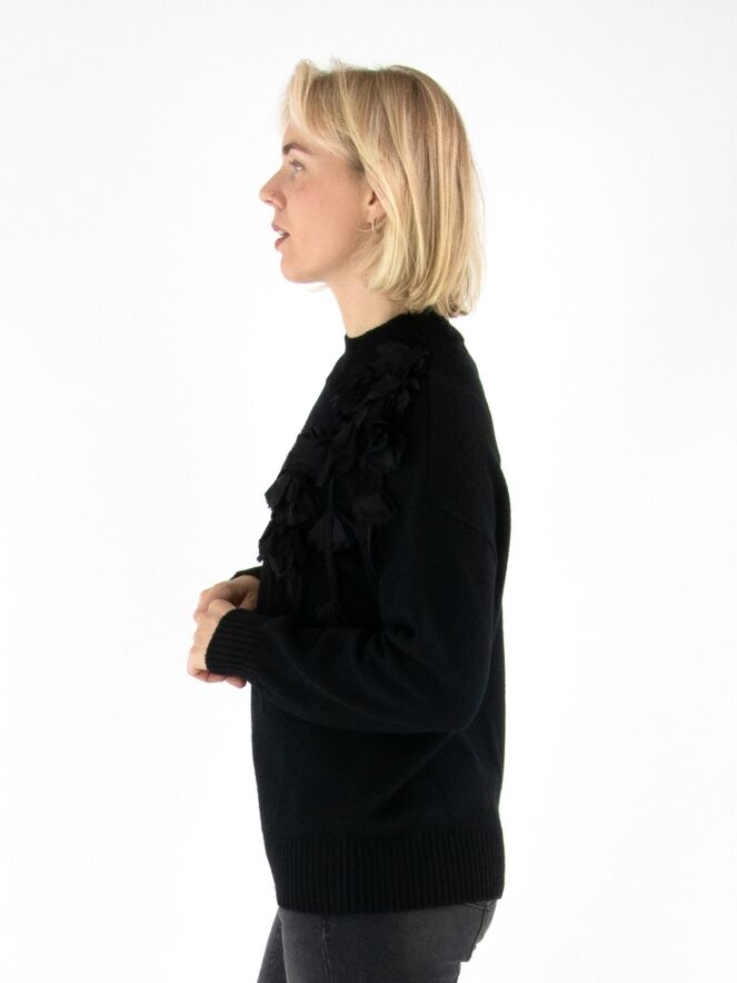 Ein luxuriöser Pullover von High in Schwarz. Der Pullover hat einen hohen Rundhalsausschnitt und lange Ärmel. Von der linken Schulter fallen fünf Bänder in unterschiedlichen Längen, die mit Blumen aus matter Satinqualität verziert sind. Dieses besondere Detail verleiht dem Modell eine künstlerische und elegante Note. Dieser Pullover darf nicht gewaschen werden.