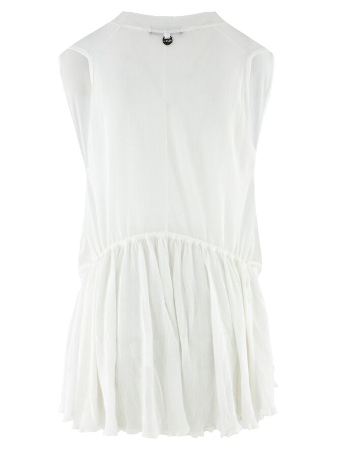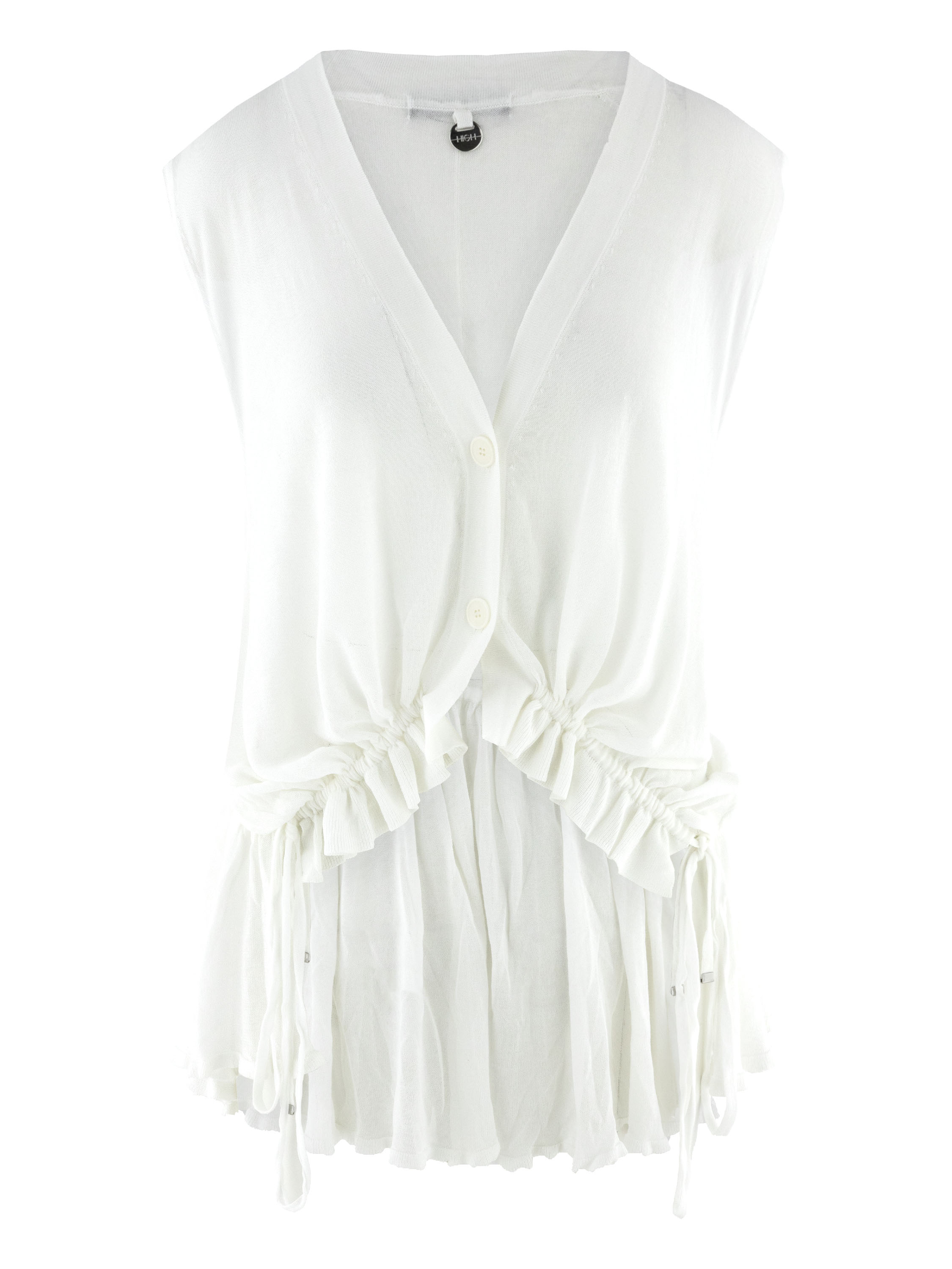 Eine leicht transparente Strickjacke von High in Cremeweiß. Die Strickjacke hat einen Verschluss mit zwei Knöpfen. Im Saumbereich der Vorderseite ist ein Band in Tunnelverarbeitung eingearbeitet, mit dem ein Falteneffekt erzeugt werden kann. Auf der Rückseite befindet sich dieses Band in der Tunnelverarbeitung auf Taillenhöhe. Diese Strickjacke kann von Hand gewaschen werden.