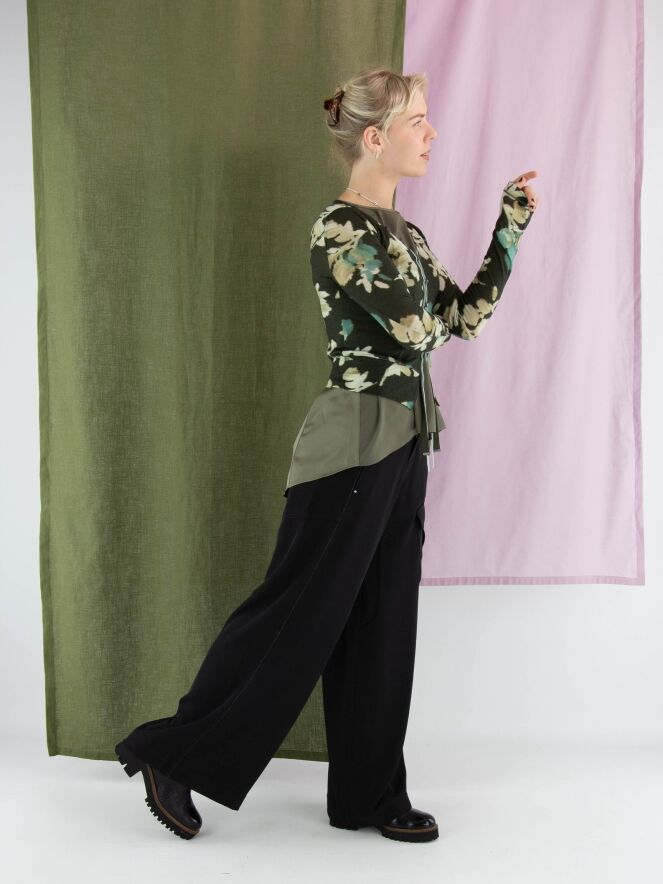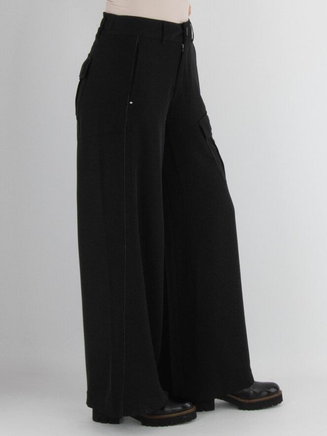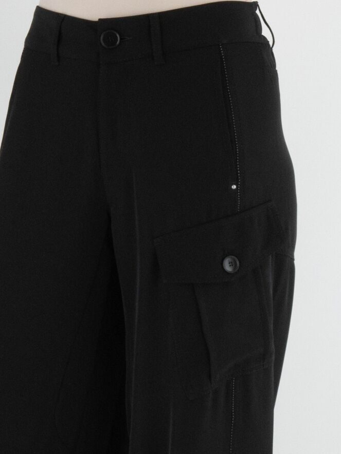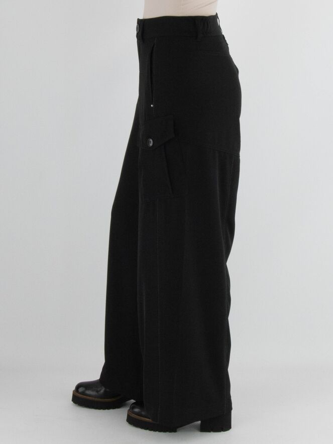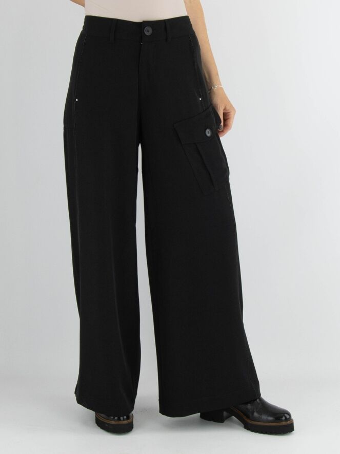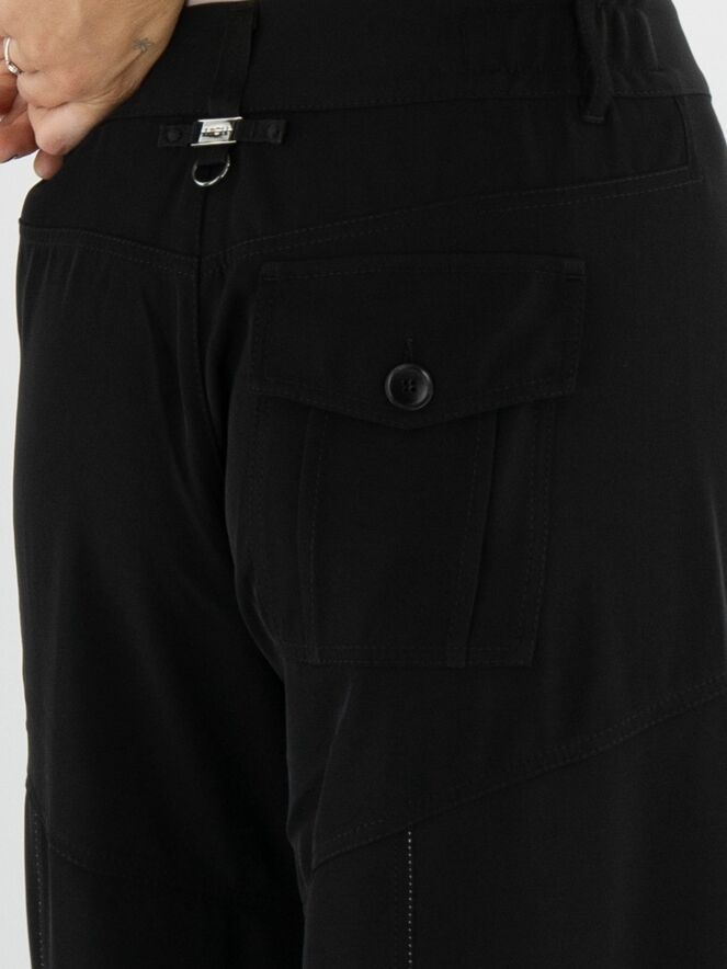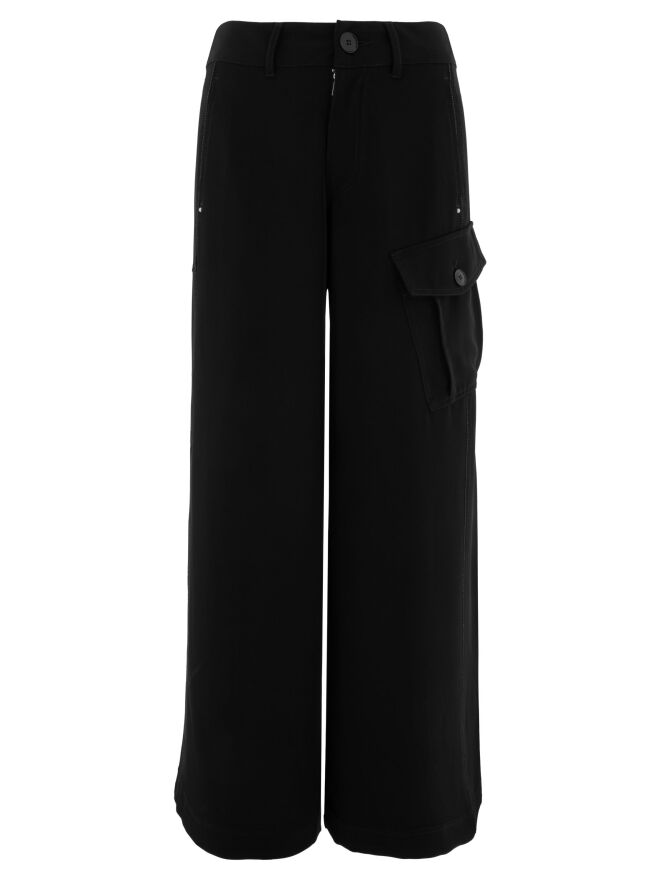 Hose von High in Schwarz. Der Bund ist an den Seiten mit kurzen elastischen Einsätzen versehen. Unterhalb der Hüfte befindet sich am rechten Oberschenkel eine dekorative Tasche. Die vertikalen Nähte sind mit weißem Garn abgesteppt. Diese Hose kann bei 30 Grad gewaschen werden.