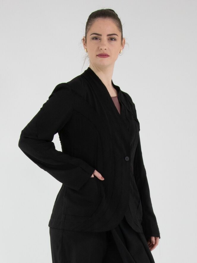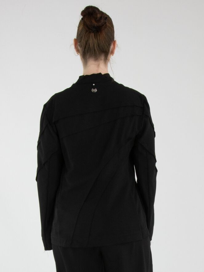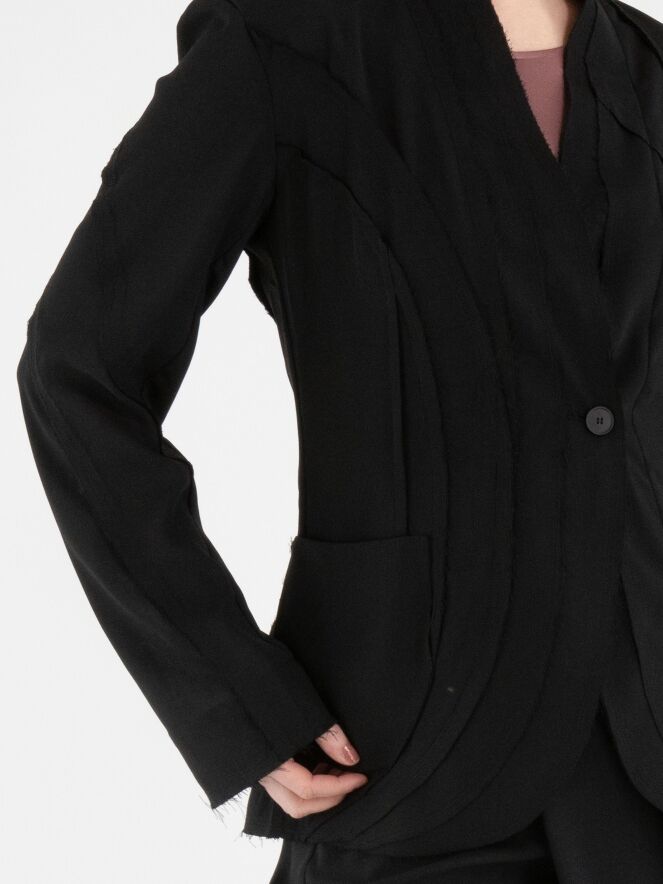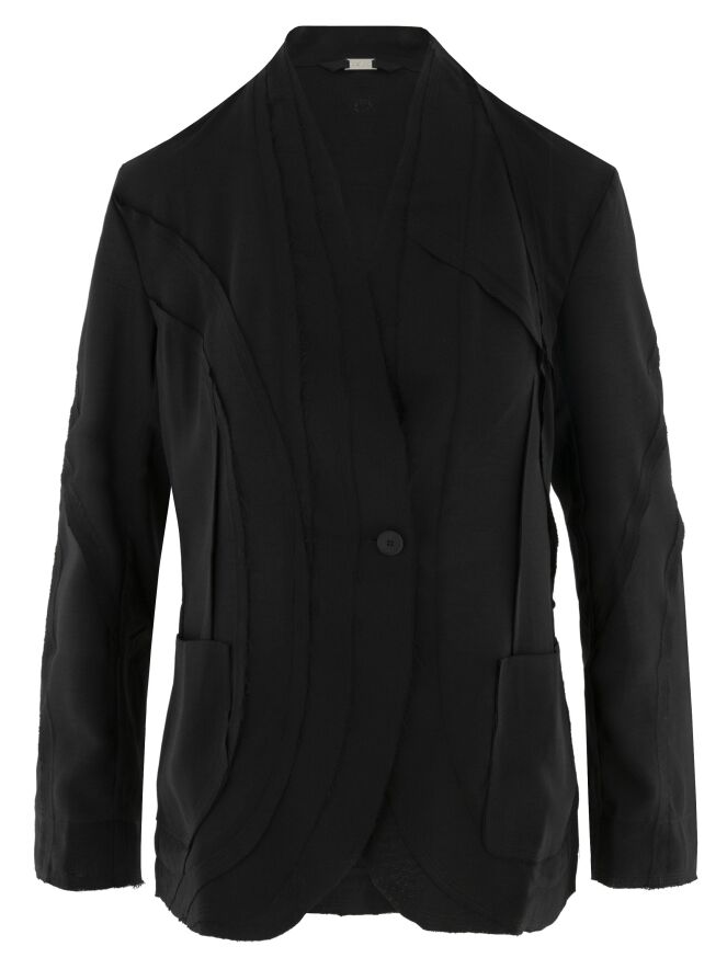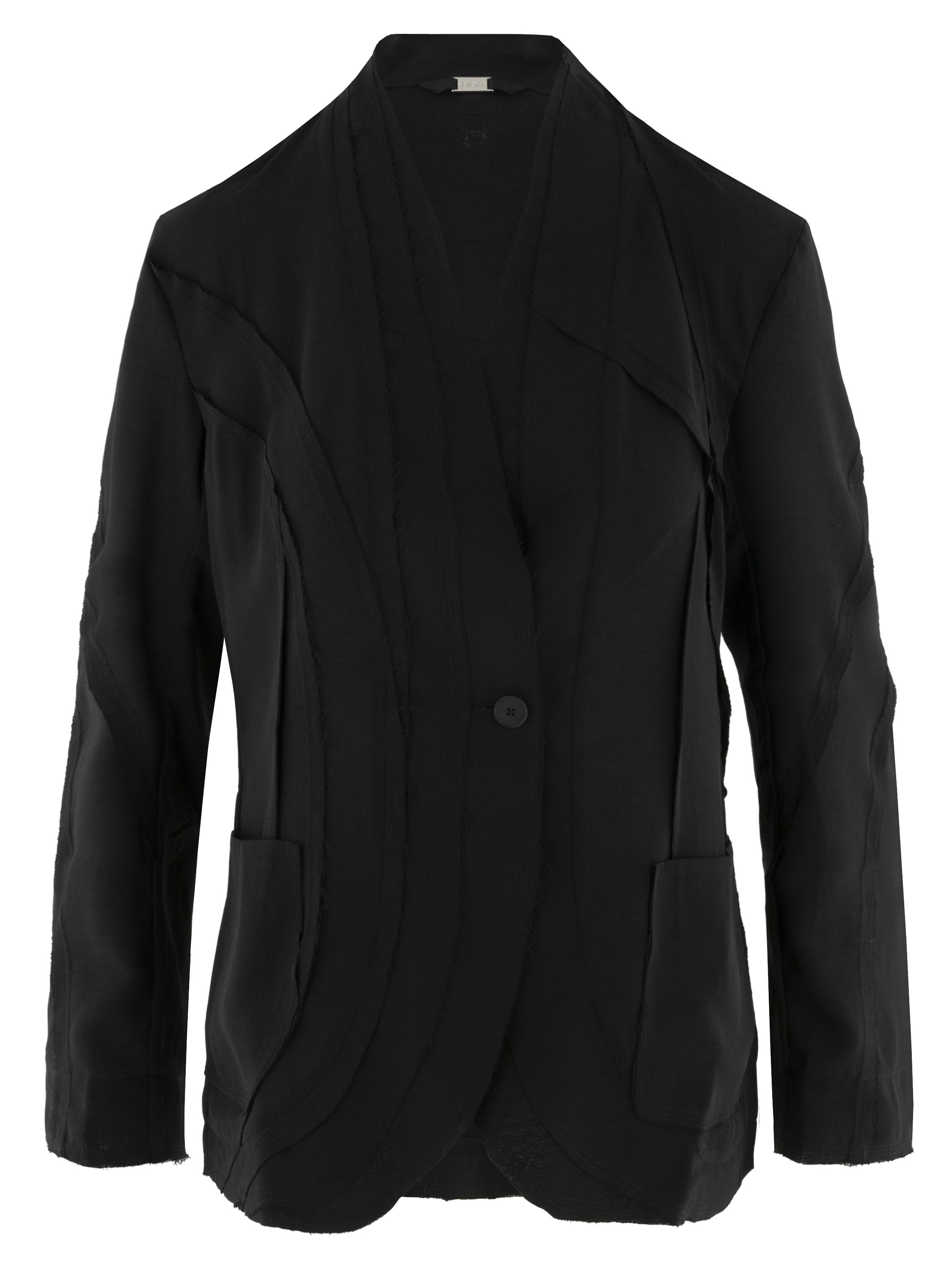 Ein leicht transparenter Blazer von High in Schwarz. Die Kanten der Taillennähte an Vorder- und Rückseite sind fein ausgefranst. Der Blazer hat einen Einknopfverschluss. Dieser Blazer kann von Hand gewaschen werden.