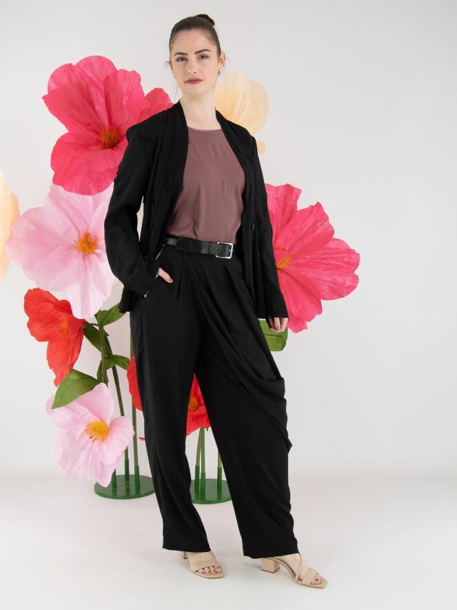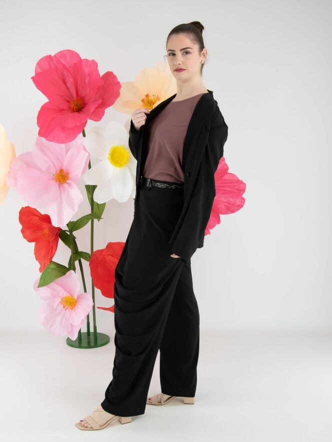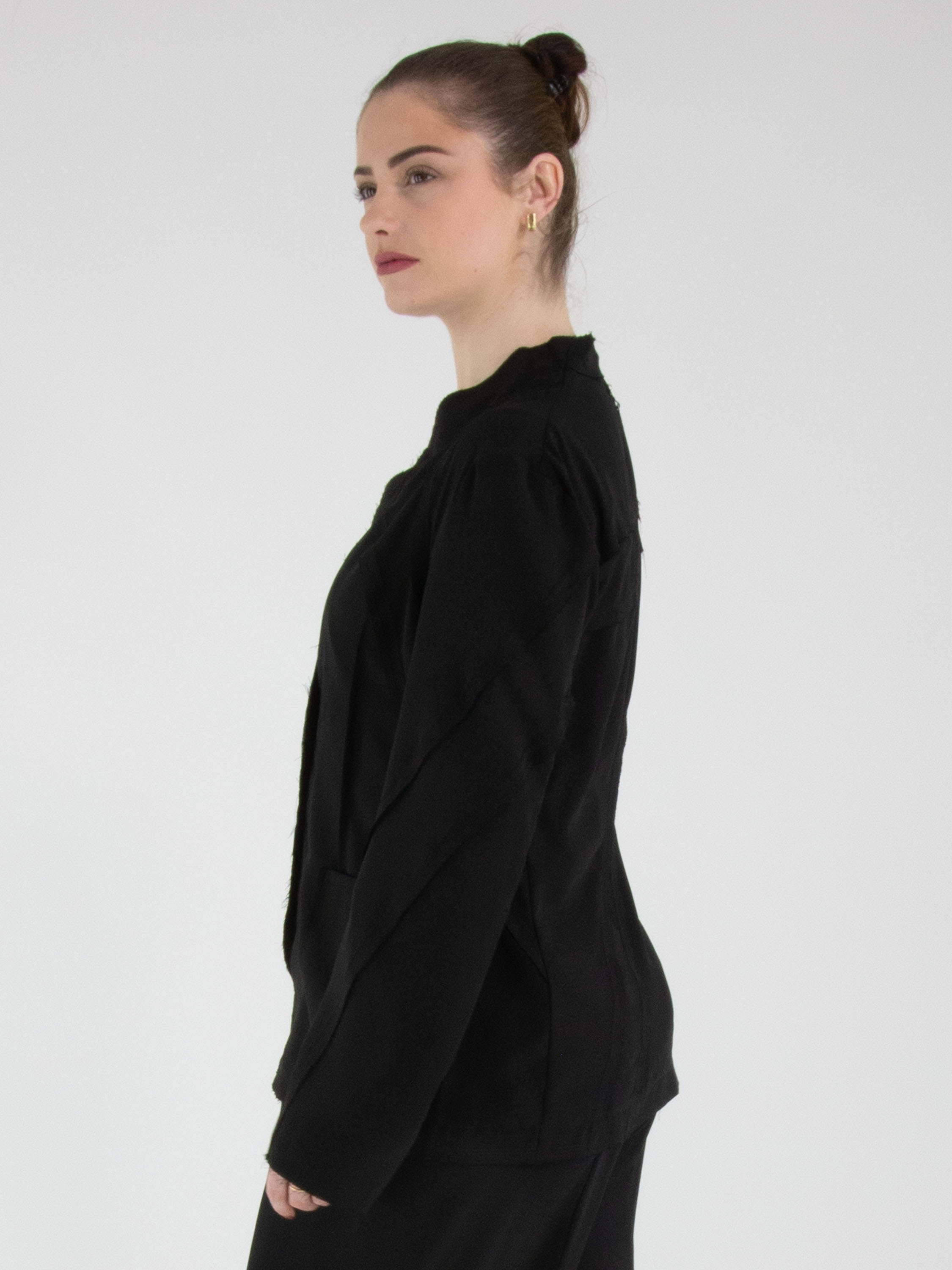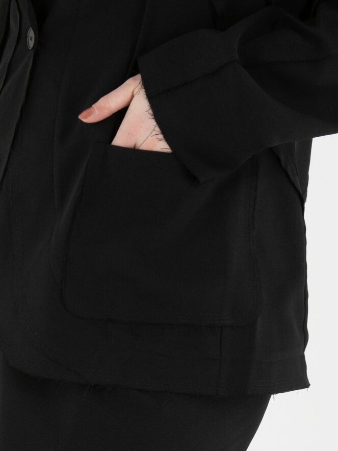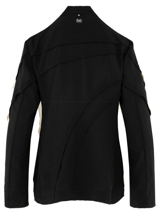 Ein leicht transparenter Blazer von High in Schwarz. Die Kanten der Taillennähte an Vorder- und Rückseite sind fein ausgefranst. Der Blazer hat einen Einknopfverschluss. Dieser Blazer kann von Hand gewaschen werden.