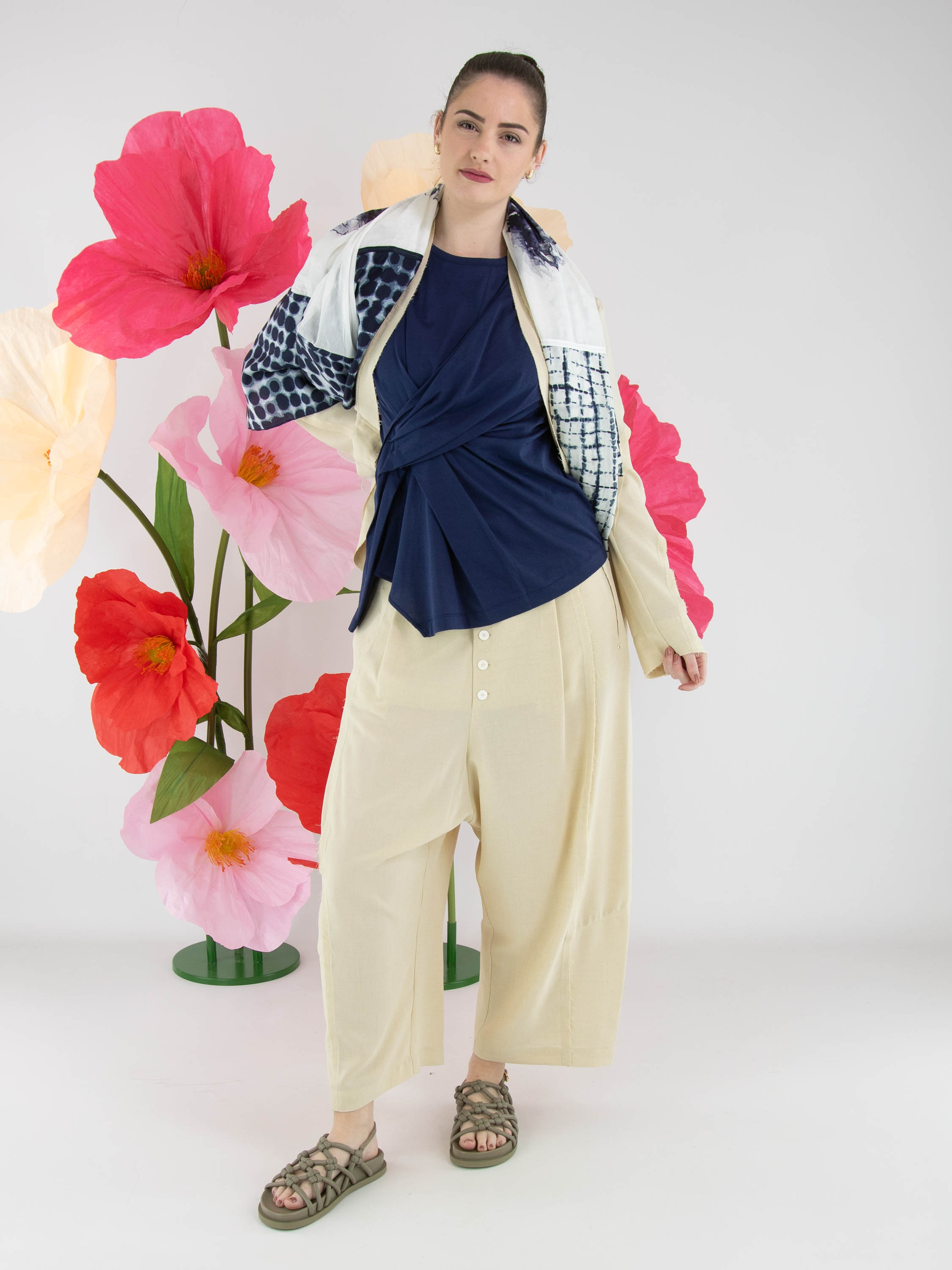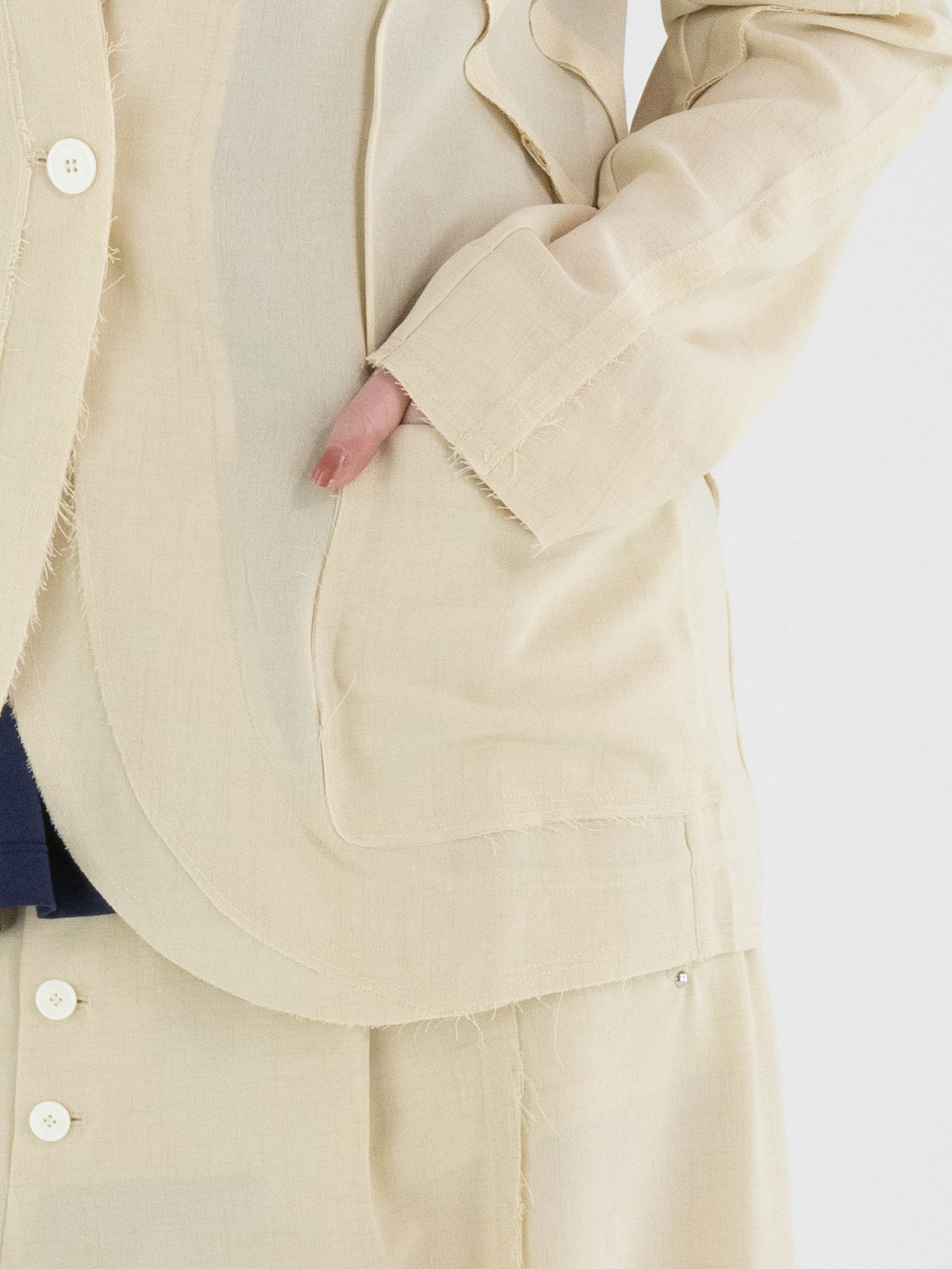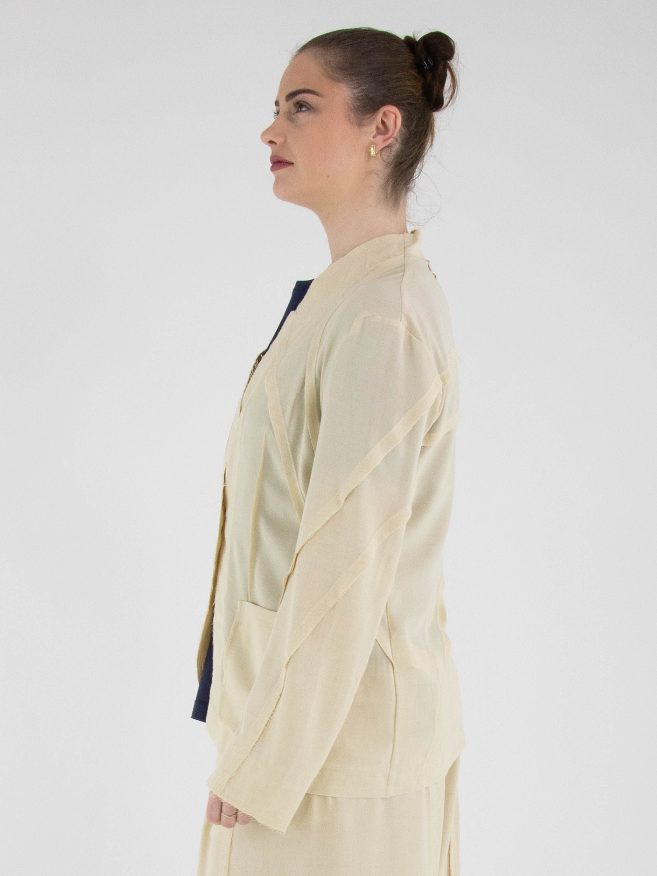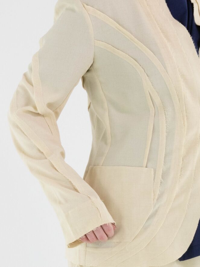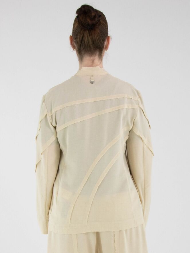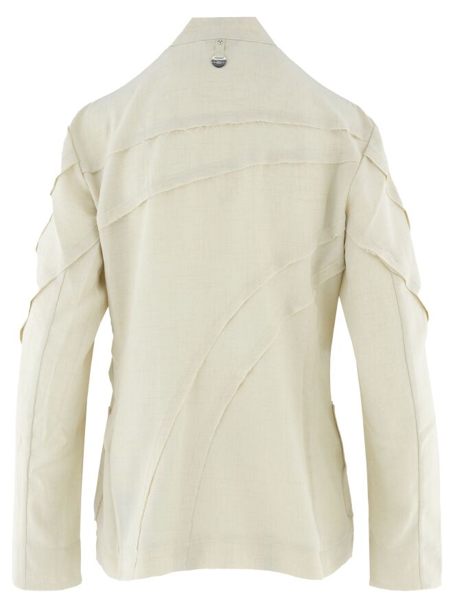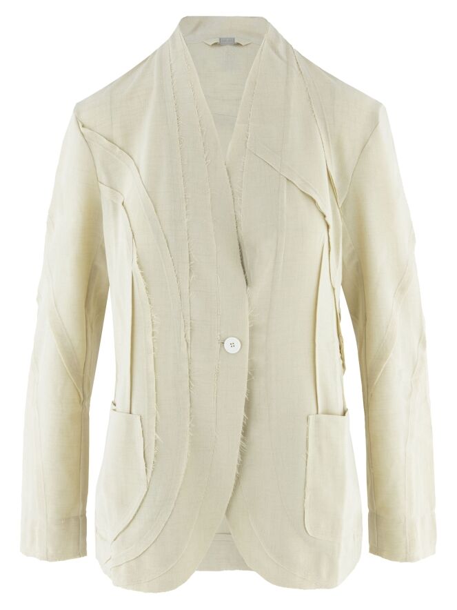 Ein leicht transparenter Blazer von High in Sandfarbe. Die Kanten der Taillennähte an Vorder- und Rückseite sind fein ausgefranst. Der Blazer hat einen Einknopfverschluss. Dieser Blazer kann von Hand gewaschen werden.