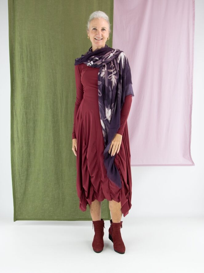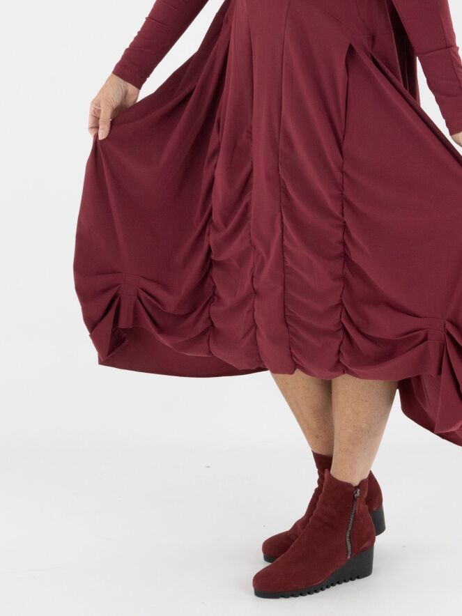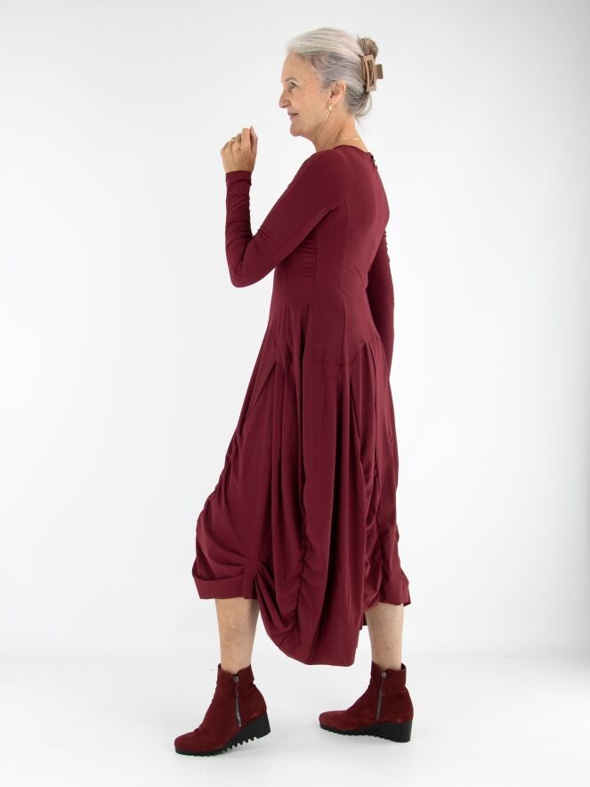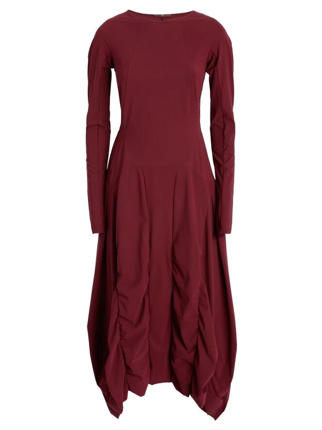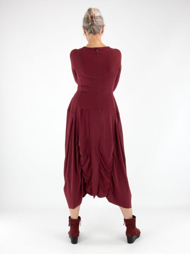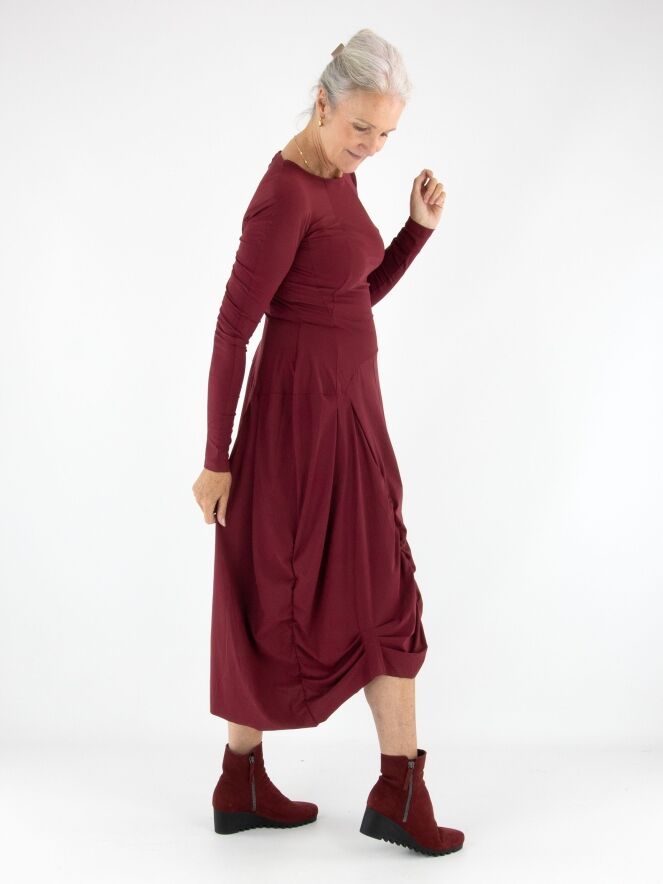 Ein Kleid von High in Aubergine. Das Kleid hat einen Rundhalsausschnitt und lange Ärmel. Von der Taille aus verlaufen vorne und hinten mehrere vertikale Nähte, entlang derer der Stoff fein gerafft ist. Dadurch entsteht ein dekorativer Smokeffekt, der der Silhouette eine raffinierte Ausstrahlung verleiht. Dieses Kleid kann bei 30 Grad gewaschen werden.